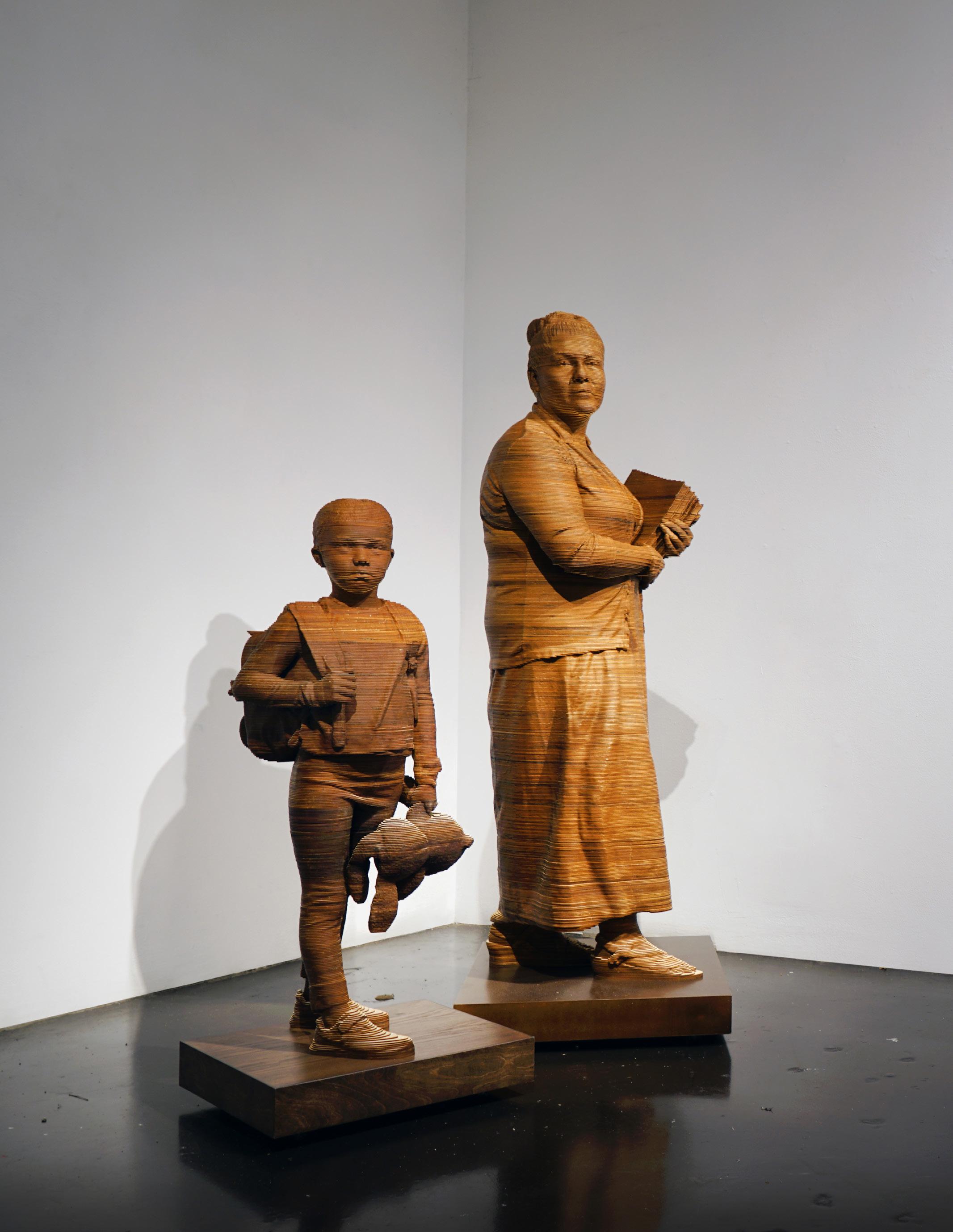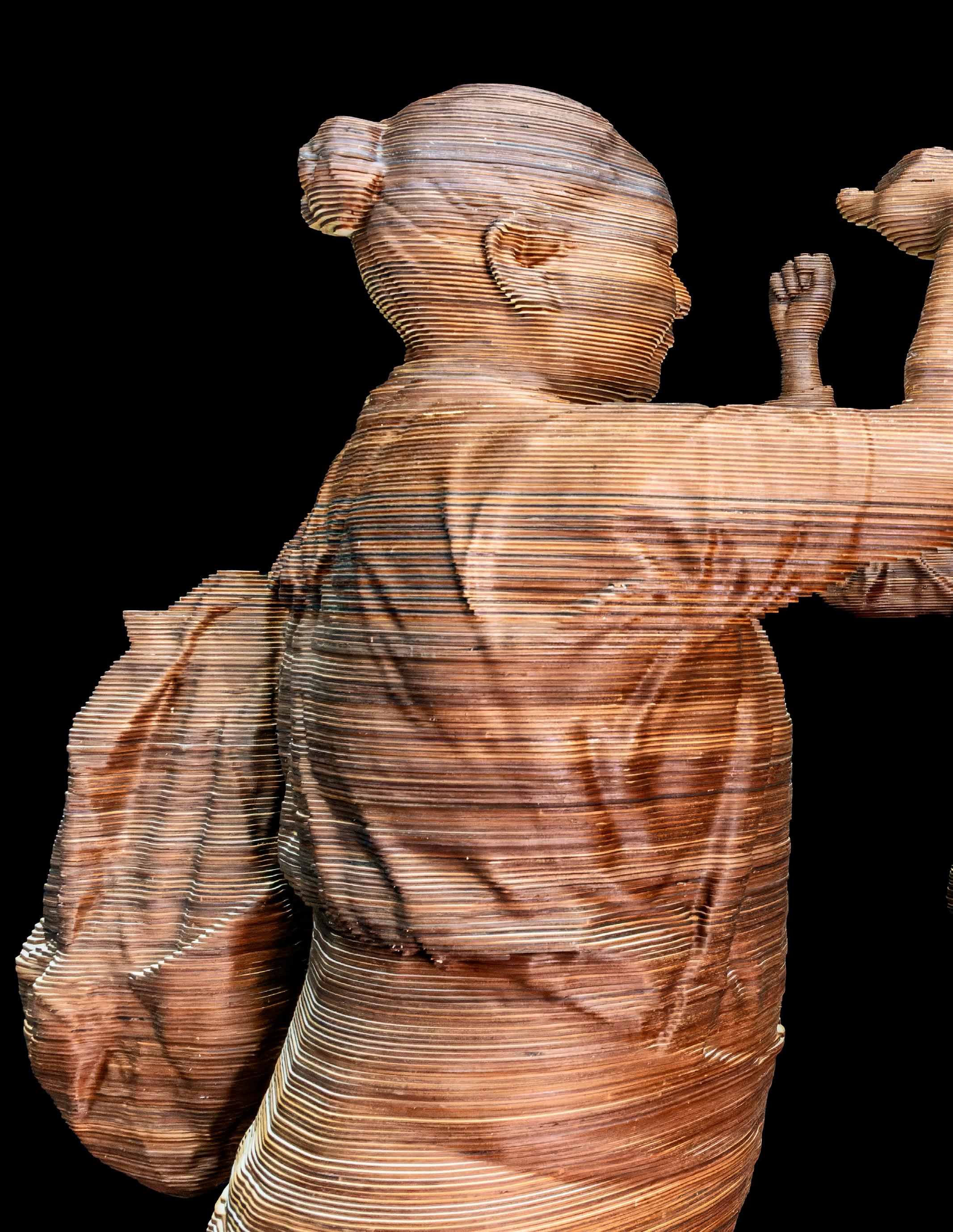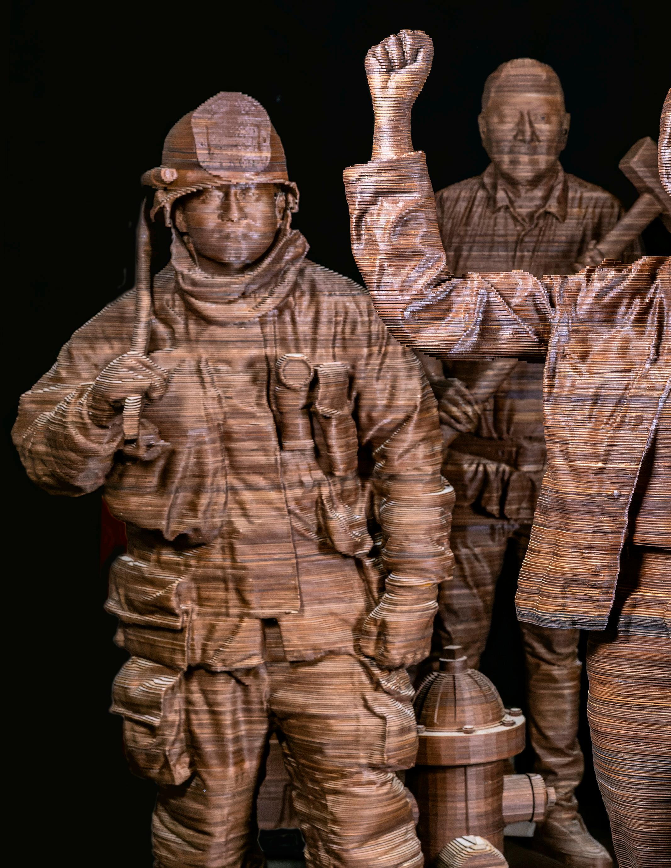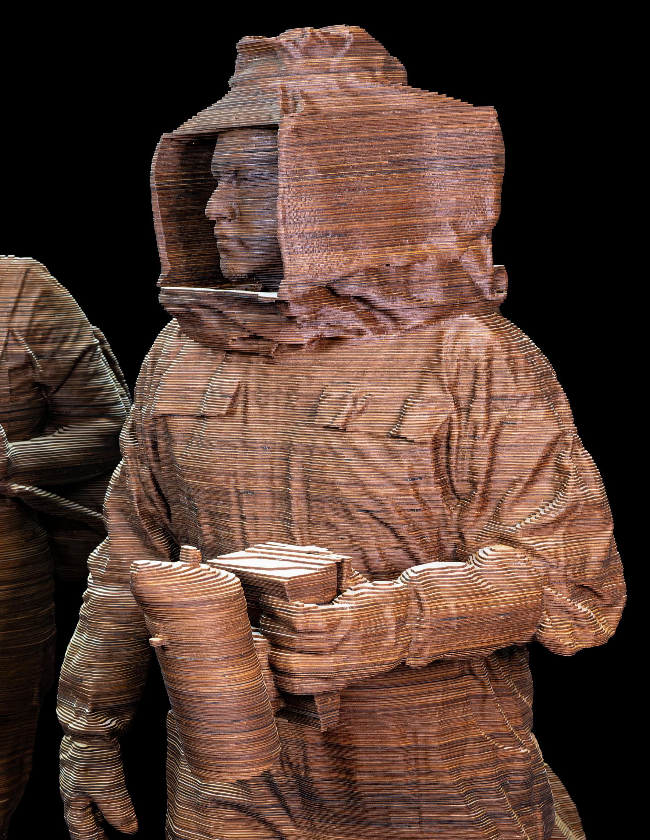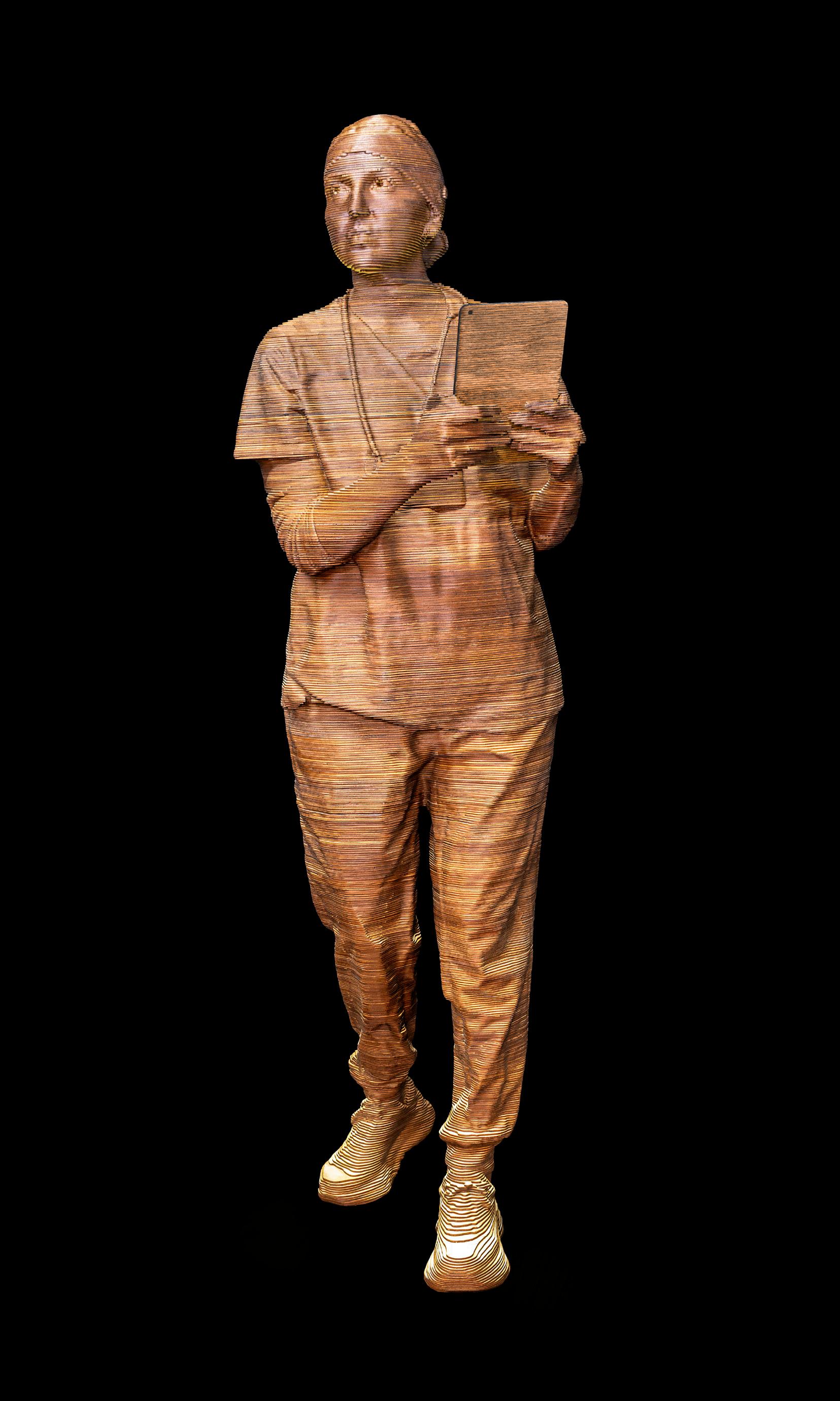The Warriors is a sculptural series that pays tribute to frontline workers—nurses, teachers, agricultural laborers, and more—through intricately layered wooden sculptures. Each life-sized figure is built from numerous laser-cut layers, creating a pixelated effect that brings these essential workers into the spotlight. Inspired by the Terracotta Warriors of China, the series highlights the often unseen contributions of these modern-day heroes.