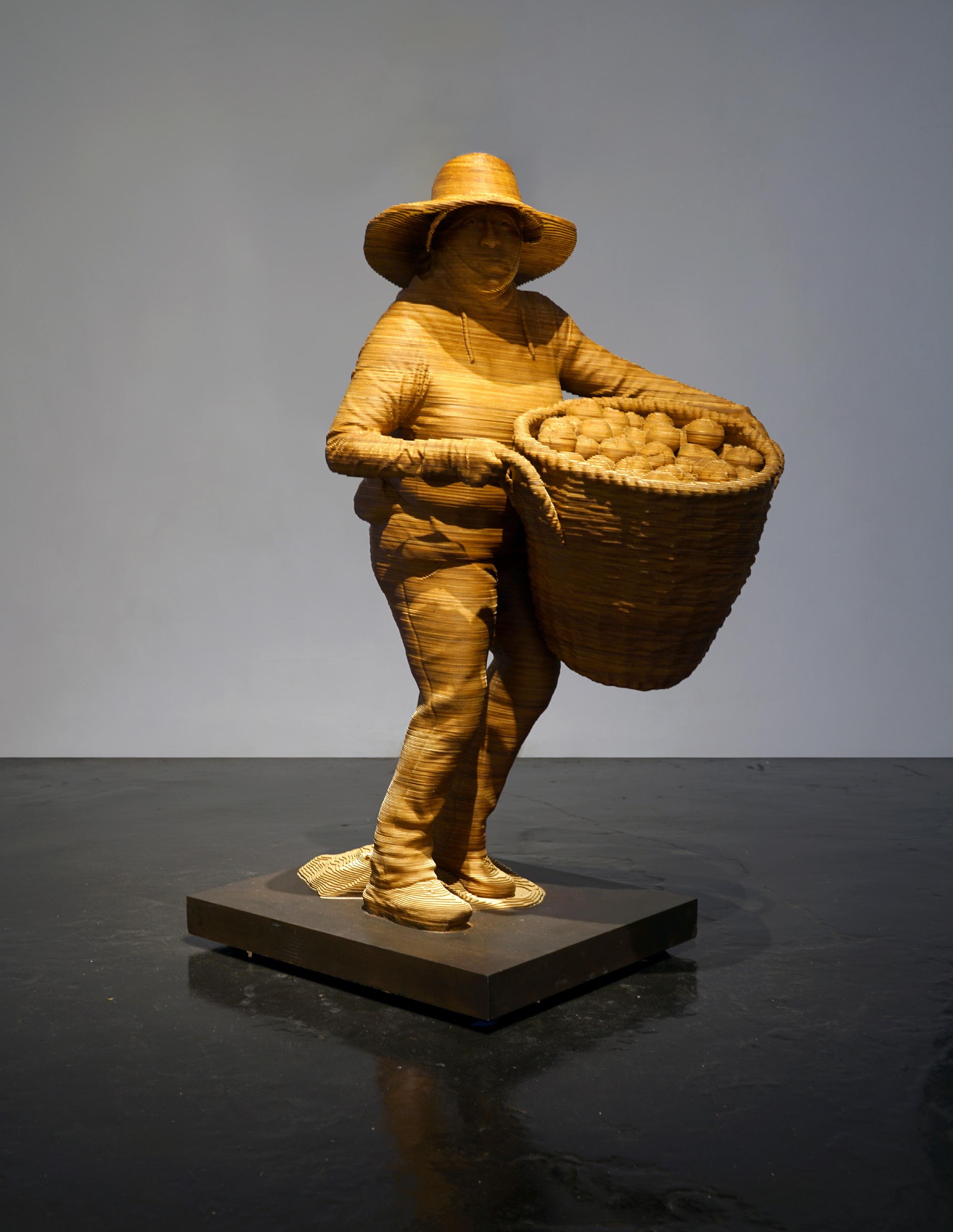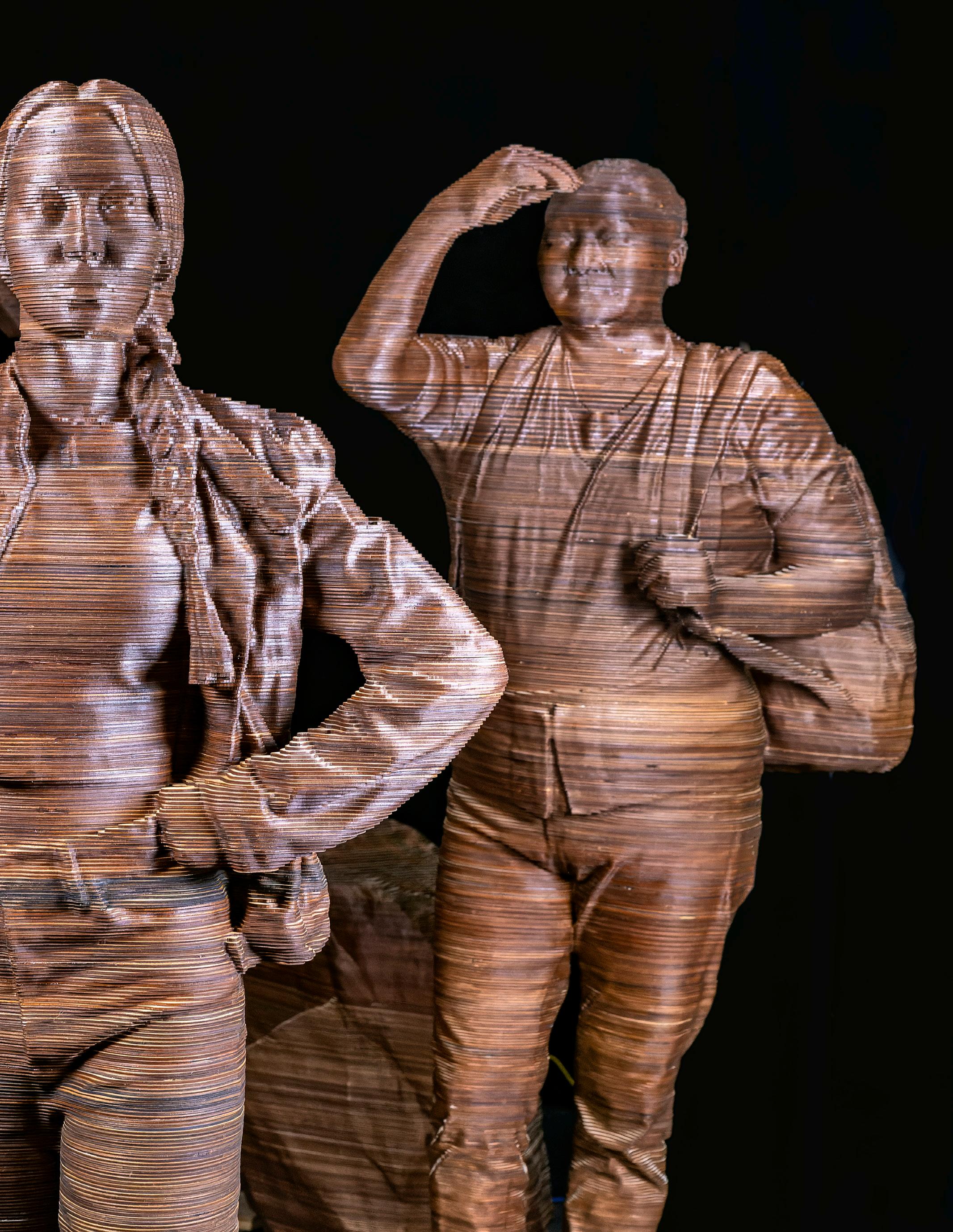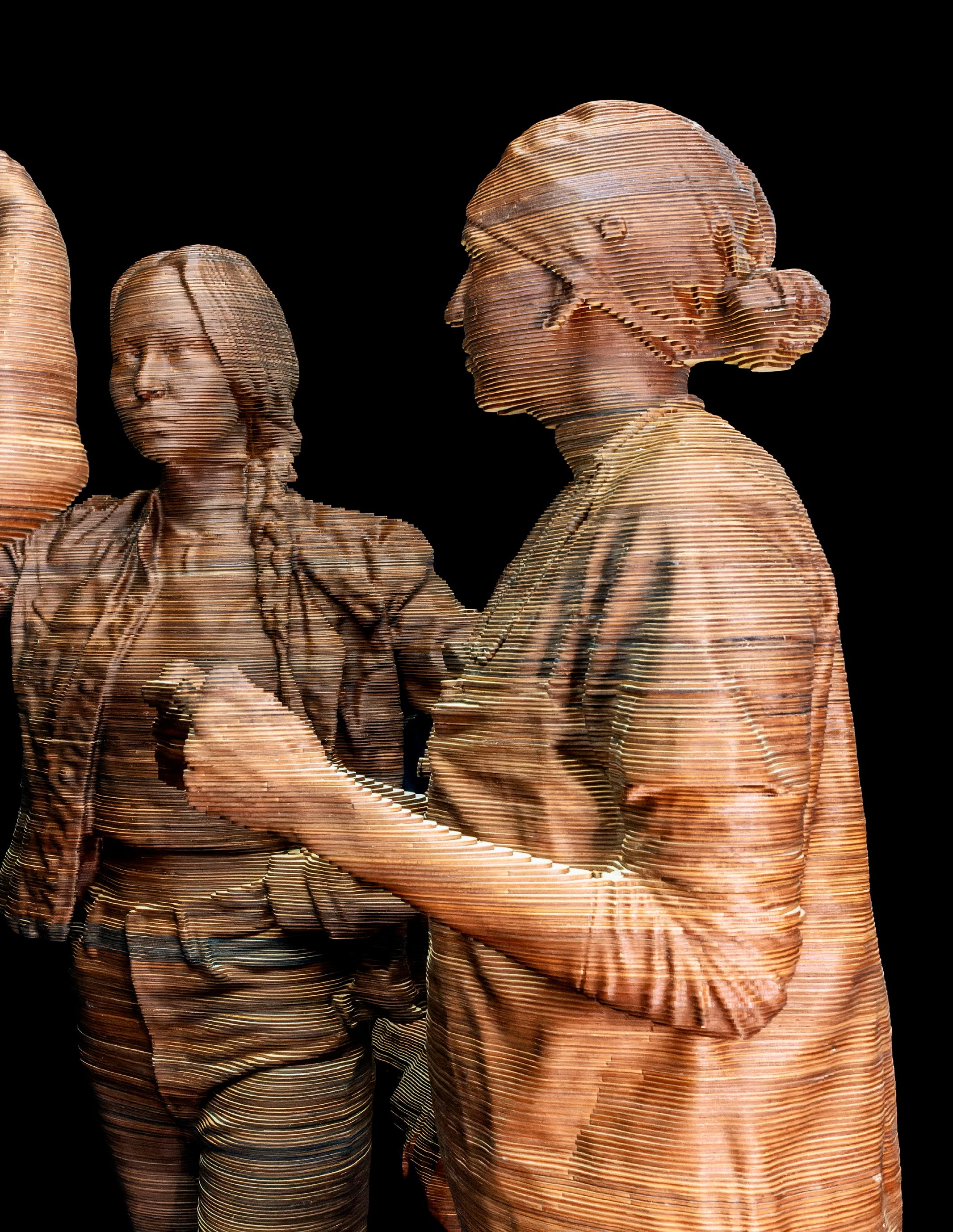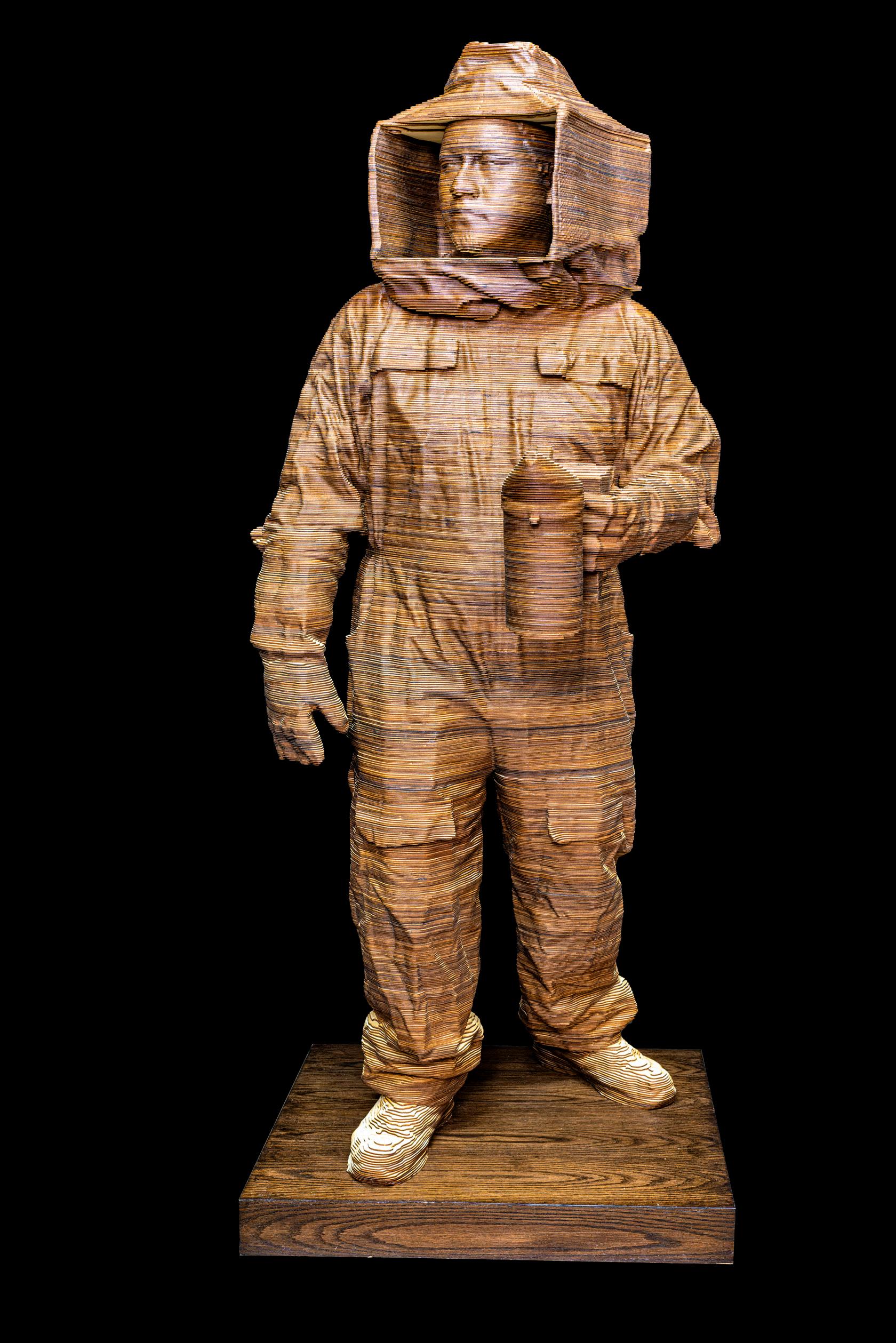 The Warriors is a sculptural series that pays tribute to frontline workers—nurses, teachers, agricultural laborers, and more—through intricately layered wooden sculptures. Each life-sized figure is built from numerous laser-cut layers, creating a pixelated effect that brings these essential workers into the spotlight. Inspired by the Terracotta Warriors of China, the series highlights the often unseen contributions of these modern-day heroes.