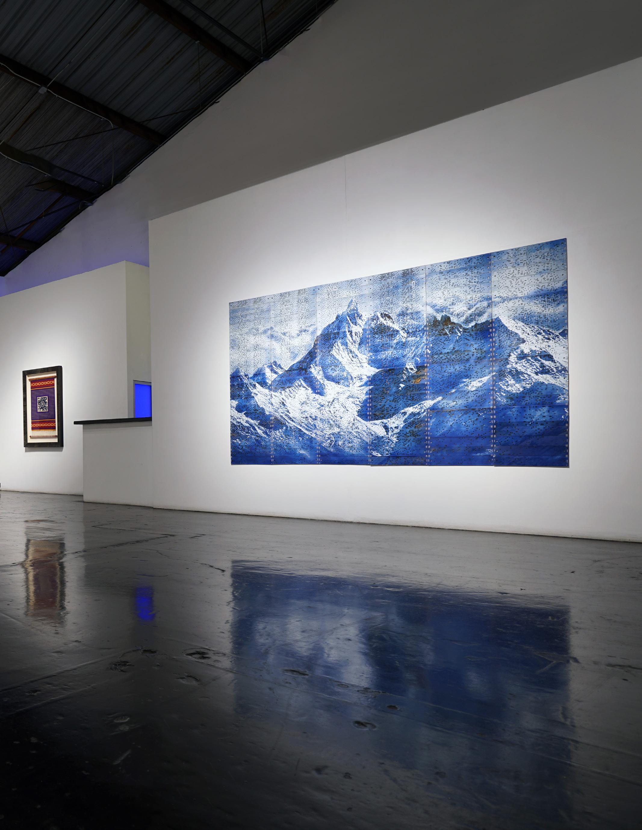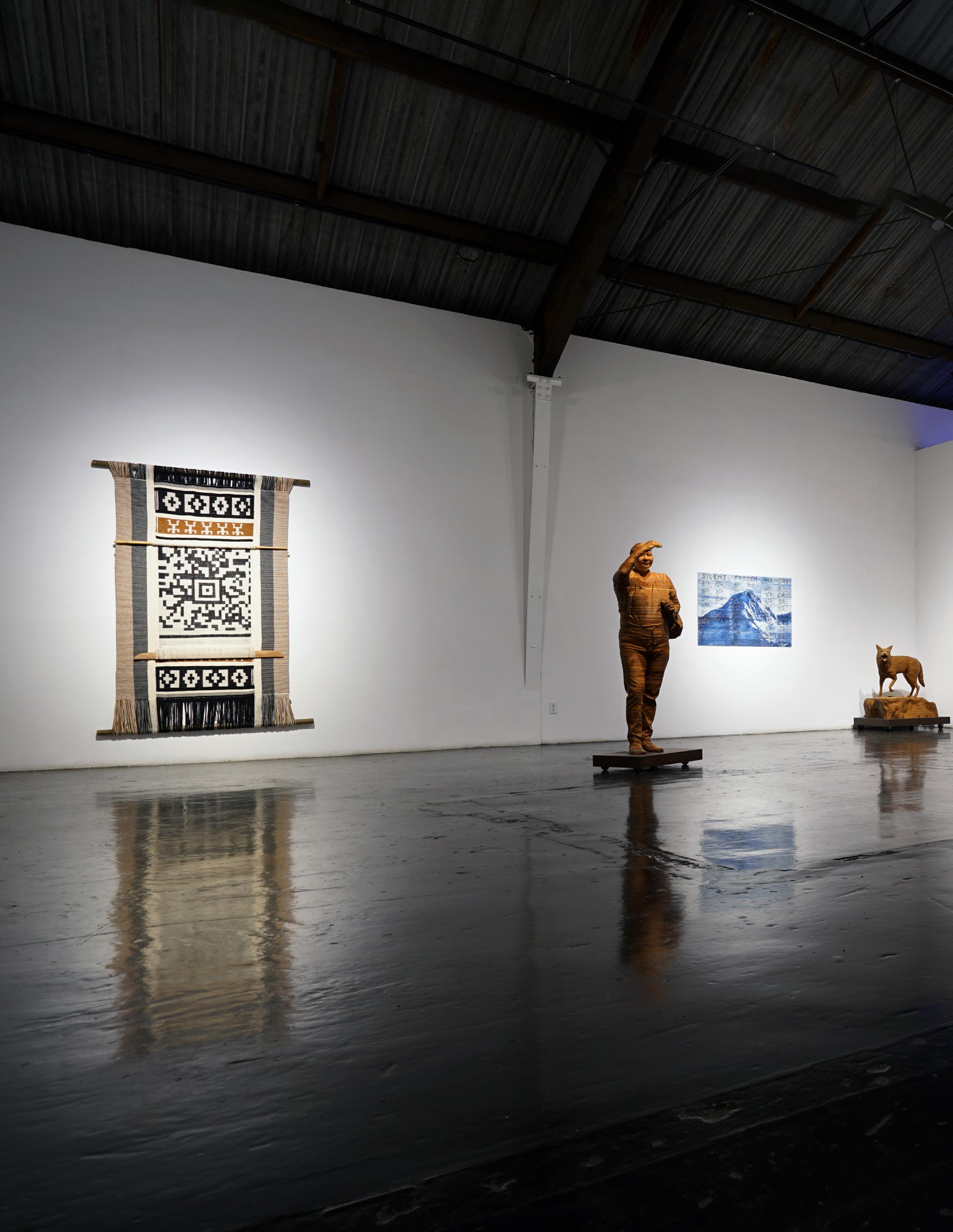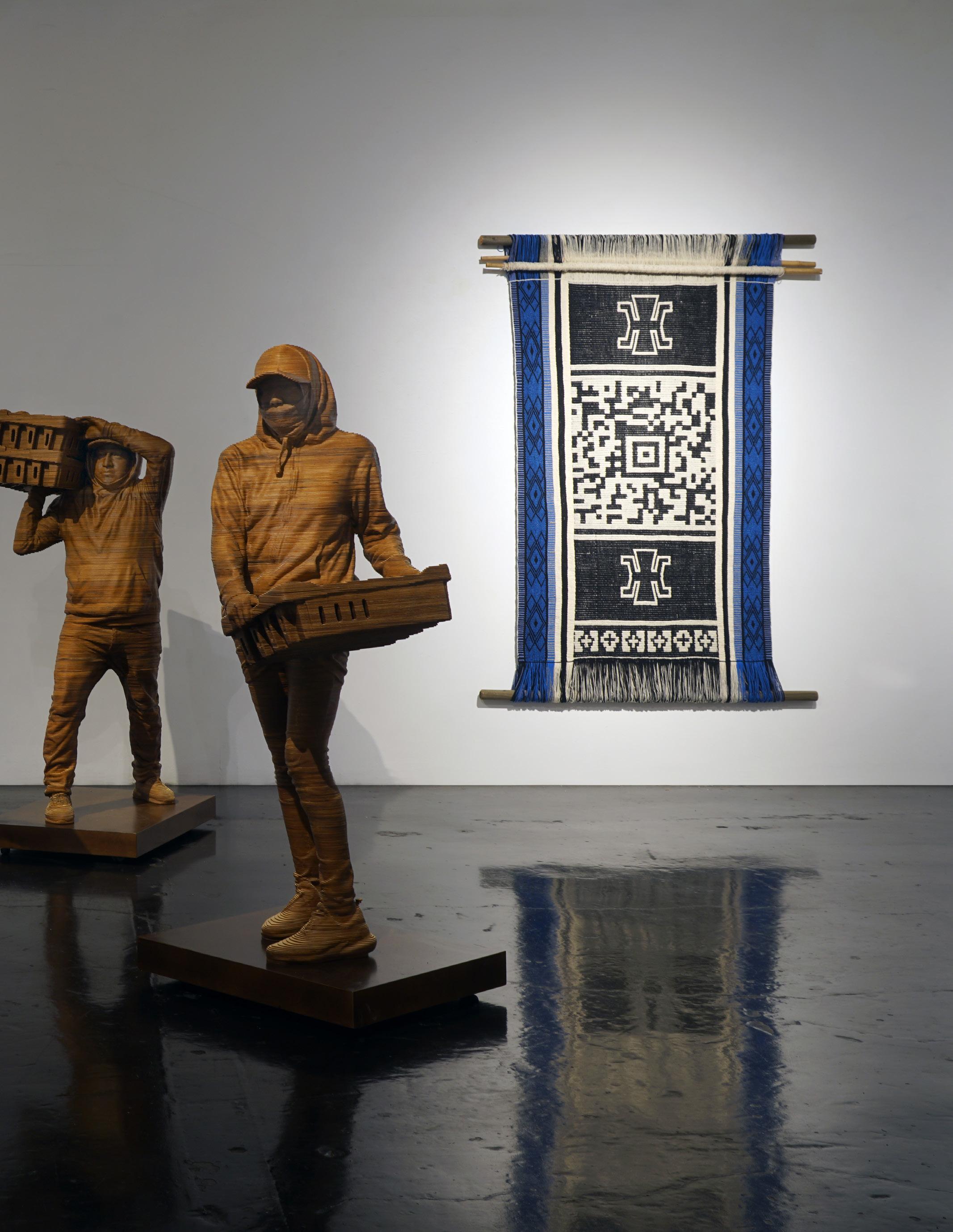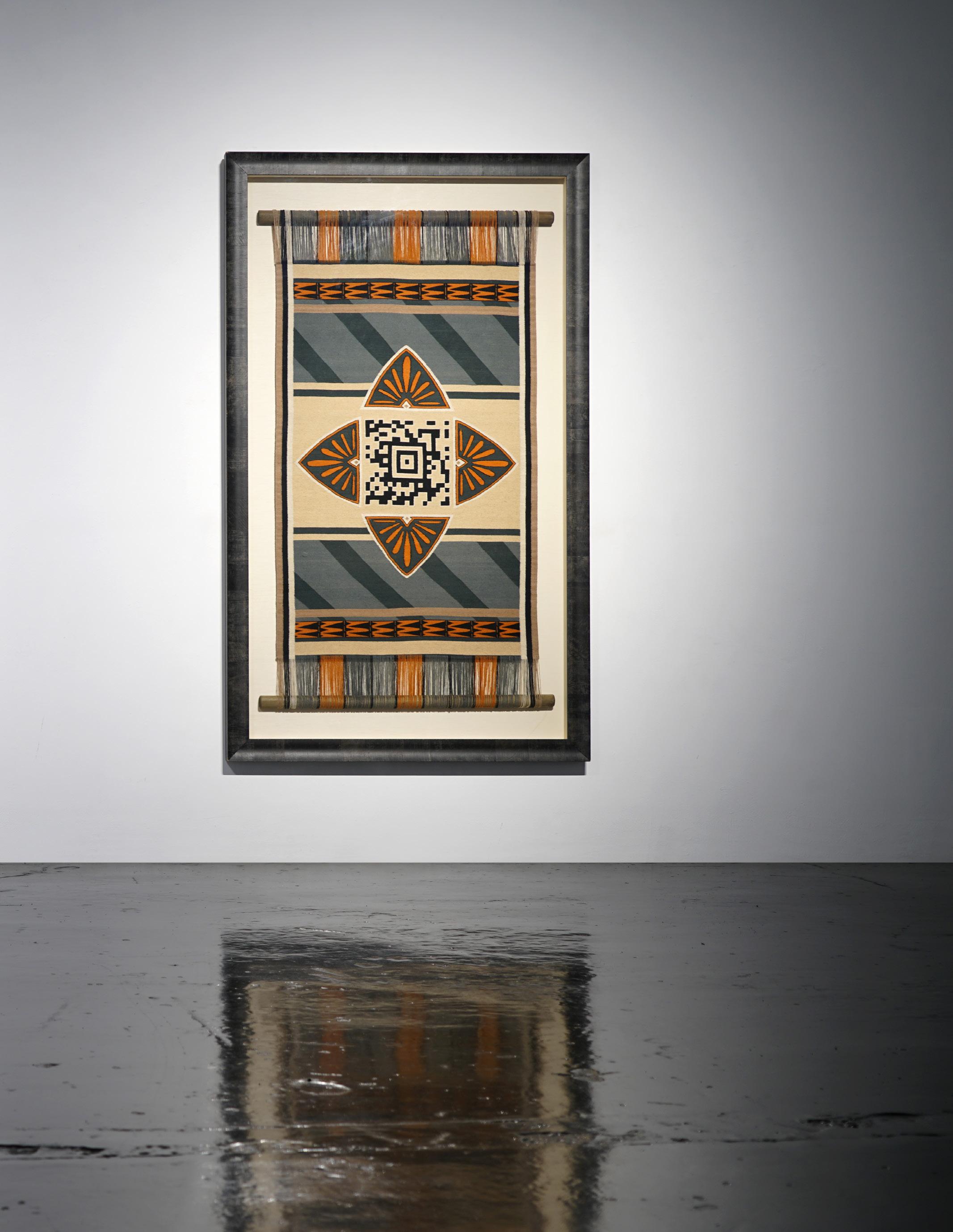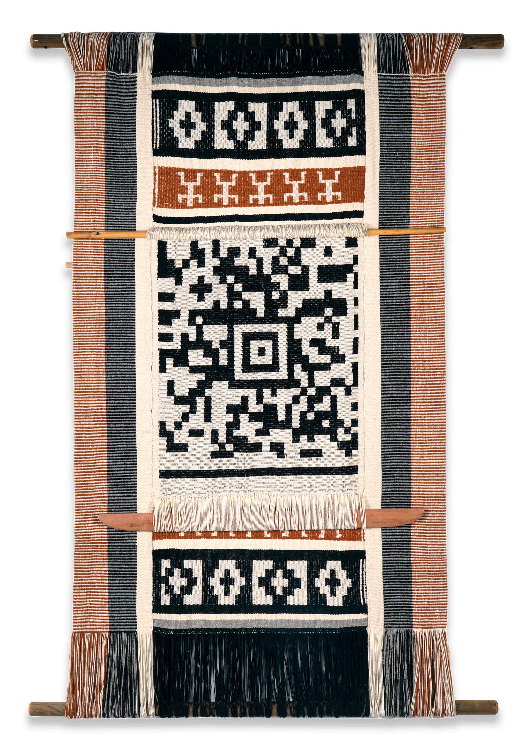 Over time, his work evolved to include technological elements, such as integrating barcodes into laser-cut pieces and paintings. A pivotal moment came in 2010 during his first trip back to Chile, where he began collaborating with Mapuche weavers. This experience profoundly shifted his practice. Together with these artisans, Bert embedded functional QR codes into traditional textile designs. When scanned, these “hightech” patterns link to short films that capture the oral histories, myths, and reflections of Mapuche elders, activists, and poets.