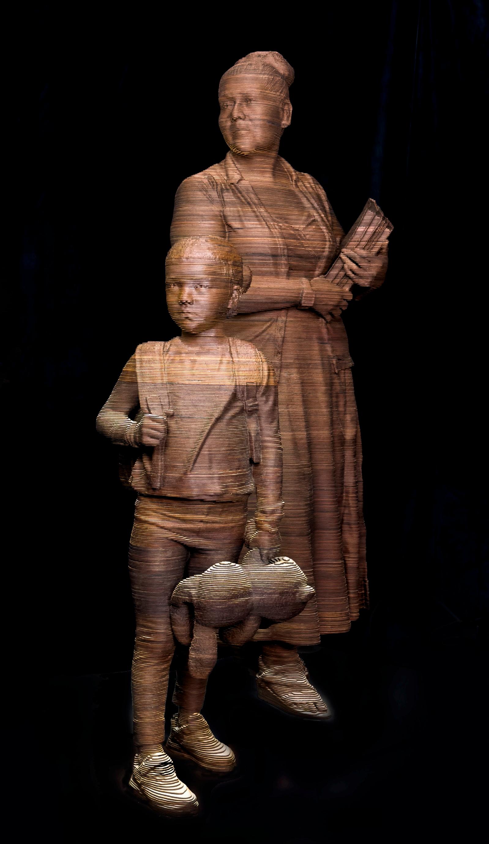 The Teacher and the Student, 2024, 3D Scan, laser cut on birch wood and metal, Teacher: 70” x 27” x 25”, (Edition of 3)