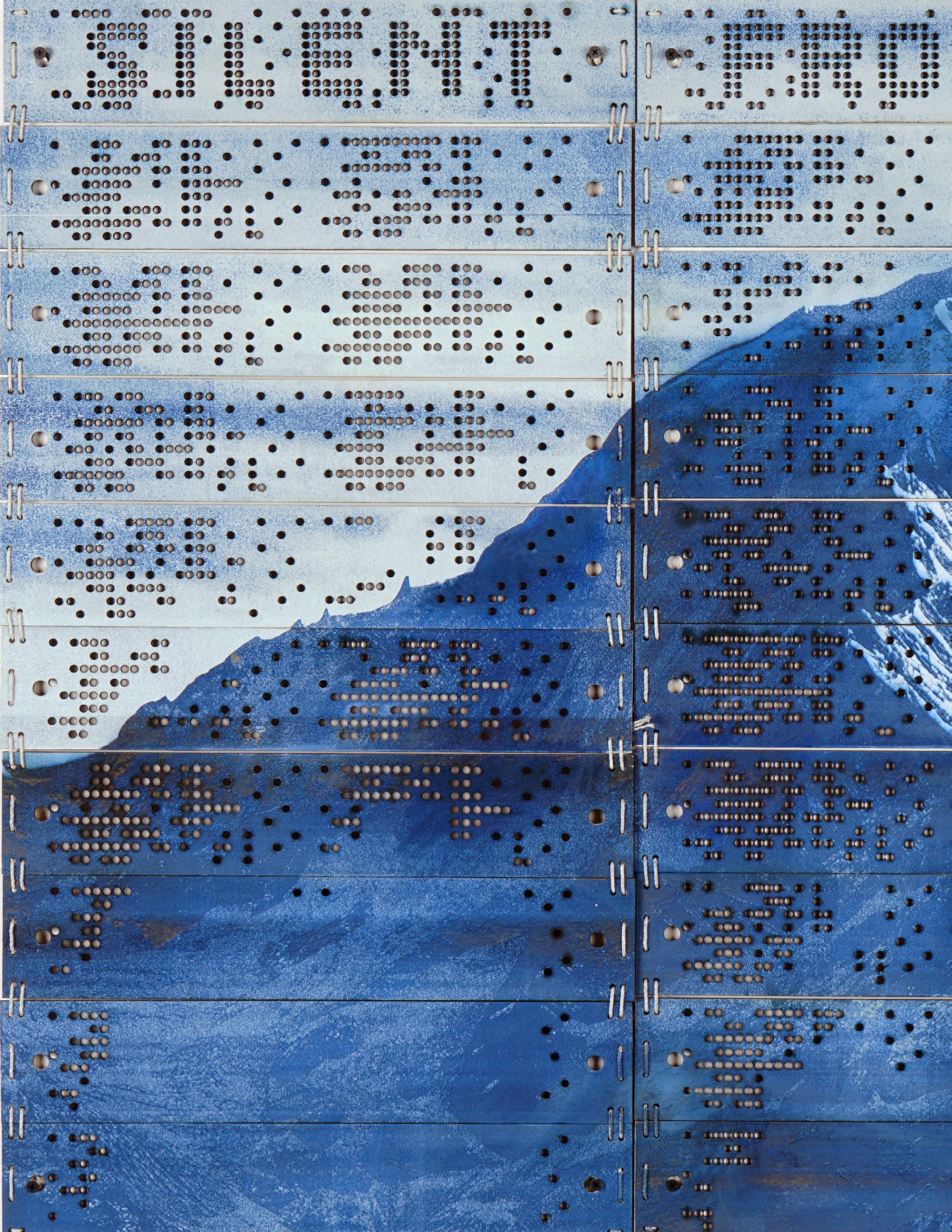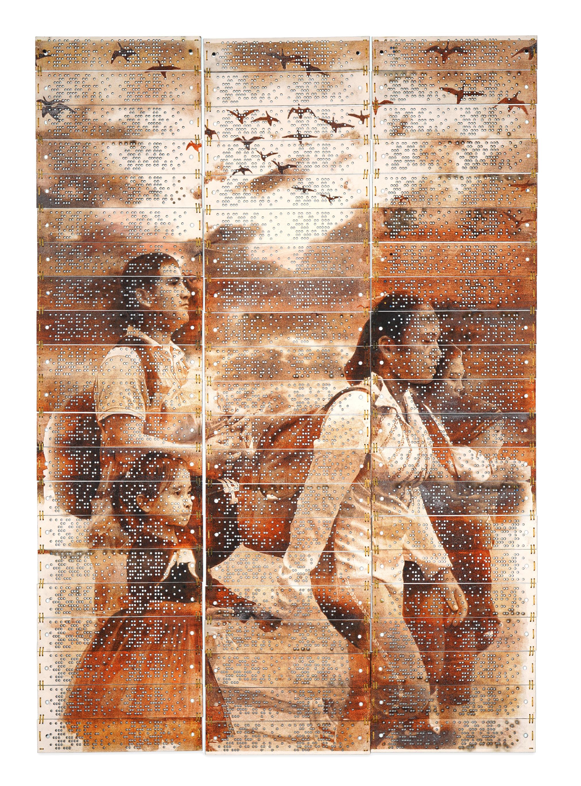 La Sagrada Familia, created on Jacquard punch cards, portrays an immigrant family whose figures are marked by punctures that resemble both scars and binary code. These perforations symbolize the digital and geopolitical forces that rewrite the family’s identity, as if their stories are being encrypted and frozen in time.