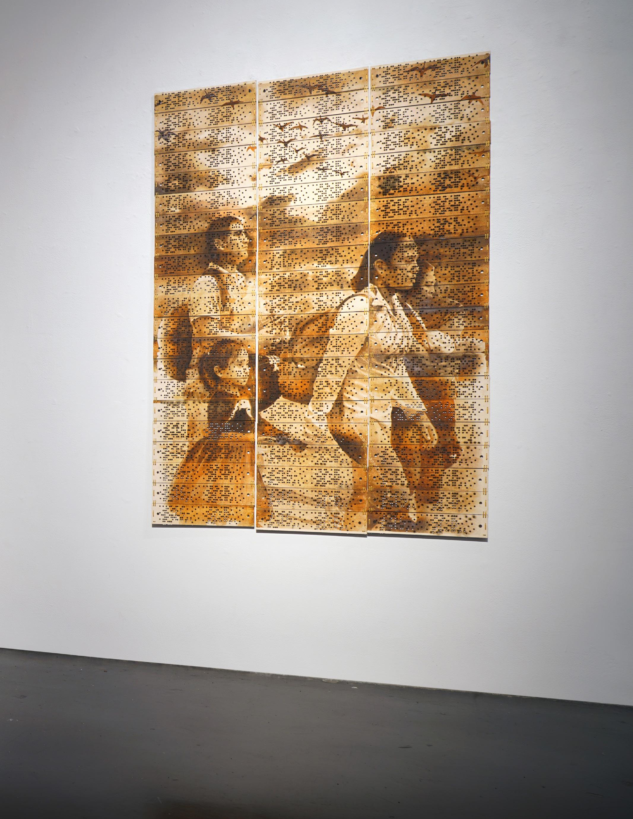 Finally, the Jacquard Punch Card series revisits one of the earliest coding technologies—the 17th-century punch card, developed for weaving patterns on the loom, which prefigured the computer by utilizing a binary code as a form of language. By burning portraits of immigrants into layered punch cards, Bert creates haunting hybrids of tapestry and code, weaving together the analog and the algorithmic, the historical and the contemporary.