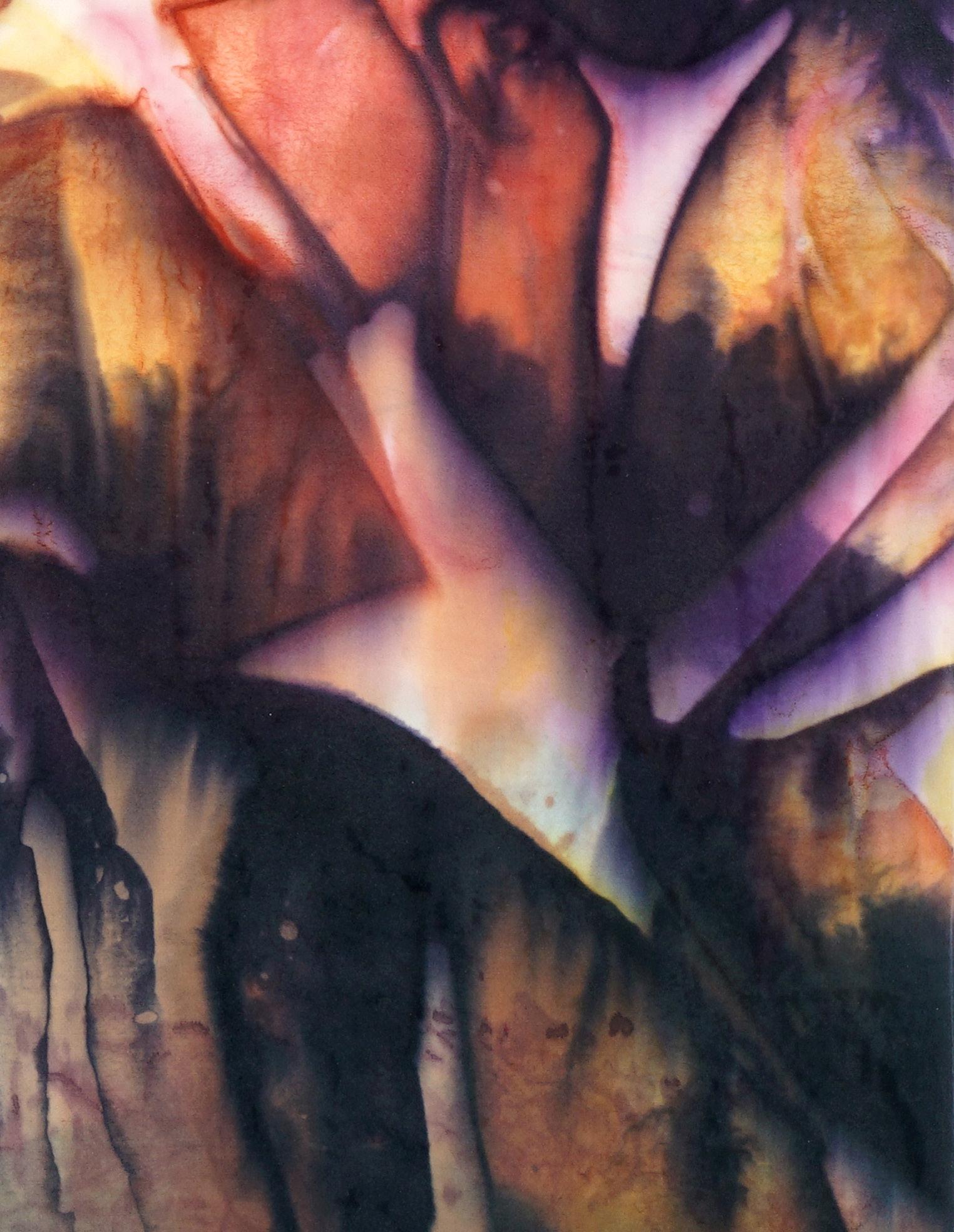 The works in this series live within this tension. Created with natural dyes on silk, the materials themselves embody this duality. The pigments, once used in some of the world’s earliest and most enduring artworks, carry a deep material history—rooted in ritual, craft, and reverence for the natural world. The silk, luxurious yet delicate, becomes a vessel not just for color, but for memory—shimmering with echoes of both ancient practices and personal exploration.