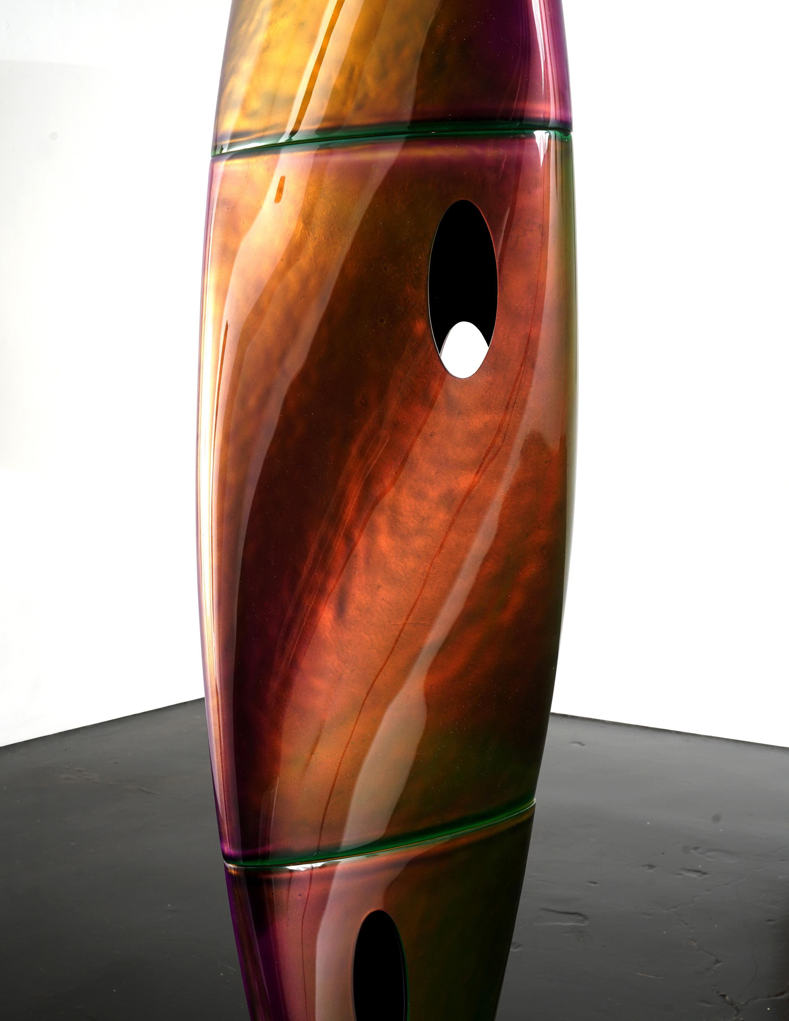 Eric Johnson utilizes polyester resin and color-shifting pigments, to create sculptures that are exquisitely sensual and dynamic in how they reflect and absorb light. They recall the materials of the surf and car culture of the late 60s and early 70s in Southern California, employed by many artists like DeWain Valentine, Craig Kaufman and Billy Al Bengston. Johnson embraced the hot-rod culture as well and has made customized car bodies for the Porsche 962 and has lovingly overhauled vintage cars as evidenced by the two toned 1939 Chevrolet panel truck and fire engine red 1934 Ford pickup that sit to one side of his studio. As often was the case for many artists working in the 1970s, industrial products found their way into Johnson’s early studio practice and have remained there ever since. “I’ve translated all that automotive knowledge into making my artwork”,” he says. “I use the full array of auto tools and pigments.” The handcrafted abstract works are sheathed in resin skins, often revealing glimpses of skeletal armatures and hidden architectures. Other influences have been the aerospace industry and an ancestral boat builder heritage. Initially the constructs hid their “bones” under a “skin”, time capsule artifacts within. Over the past twelve years, the structures have become more organic and revealing. The current work merges Johnson’s passion for depth and structure with an obsession for color and surface. Johnson’s work is in the collections of the Oakland Museum, CA, the Laguna Beach Museum, CA, the UC Irvine Museum, CA and the Hamano Institute, Tokyo, Japan.