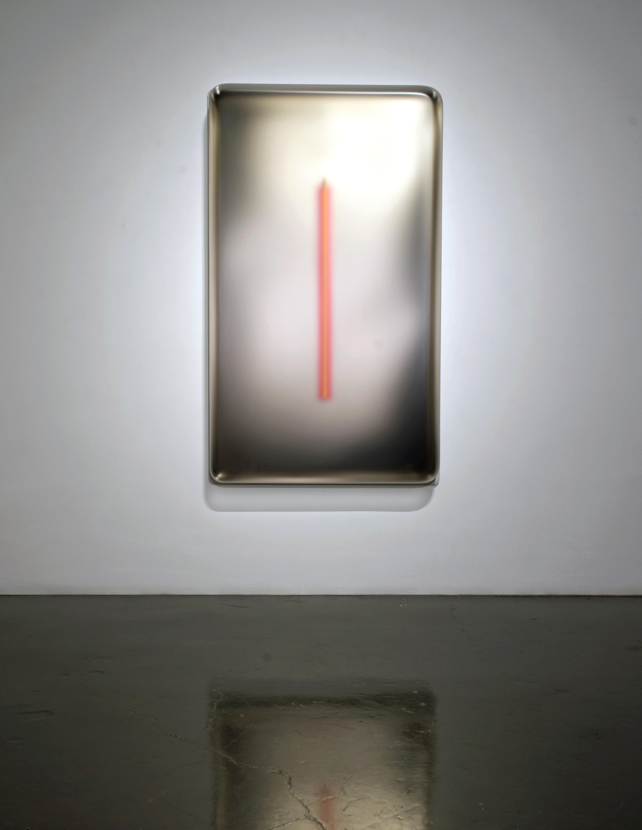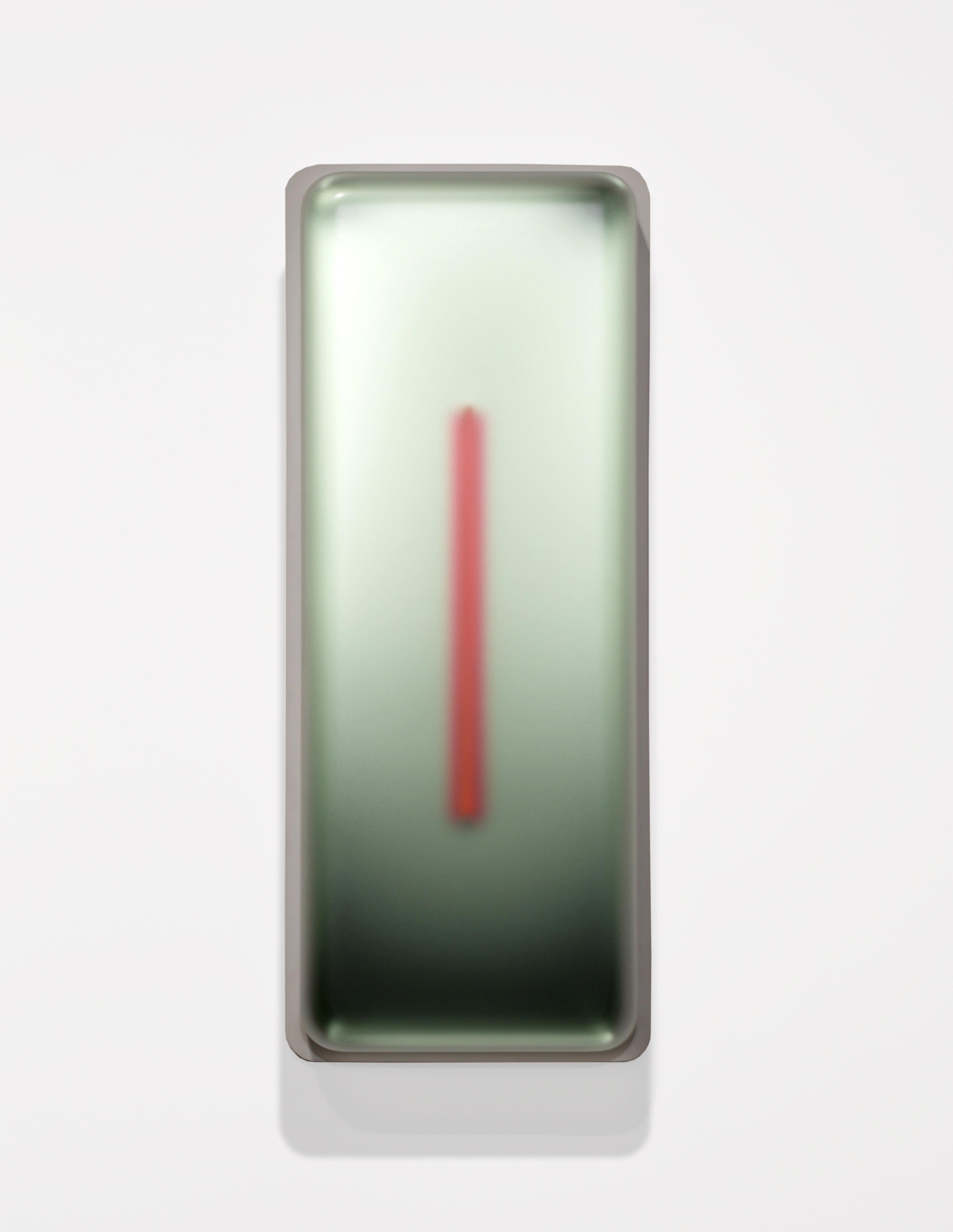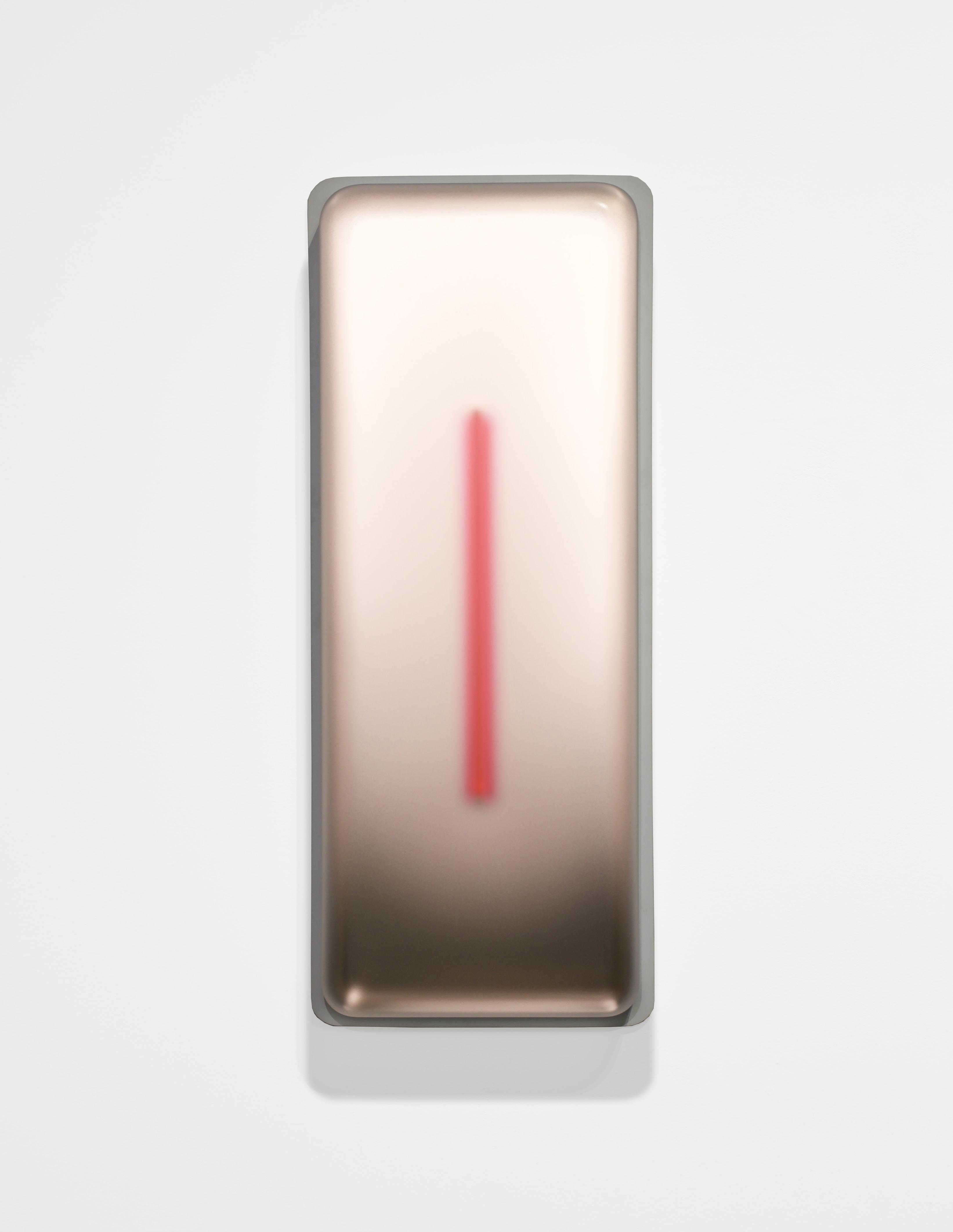 The hues shift slightly as one walks around them, an effect abetted by the use of dichromatic automotive paints; dimming the gallery’s lights, they seem to glow. Set out in rows, they confront their viewers with alluring but totemic authority. Call them batteries, filaments or conduits, they transcend static geometry to channel light and energy. The result is at once bold and subtle, luxuriant yet distilled, thrilling and yet soothing, like some chromatic atomizer or sativa-based stimulant for the optic nerves.