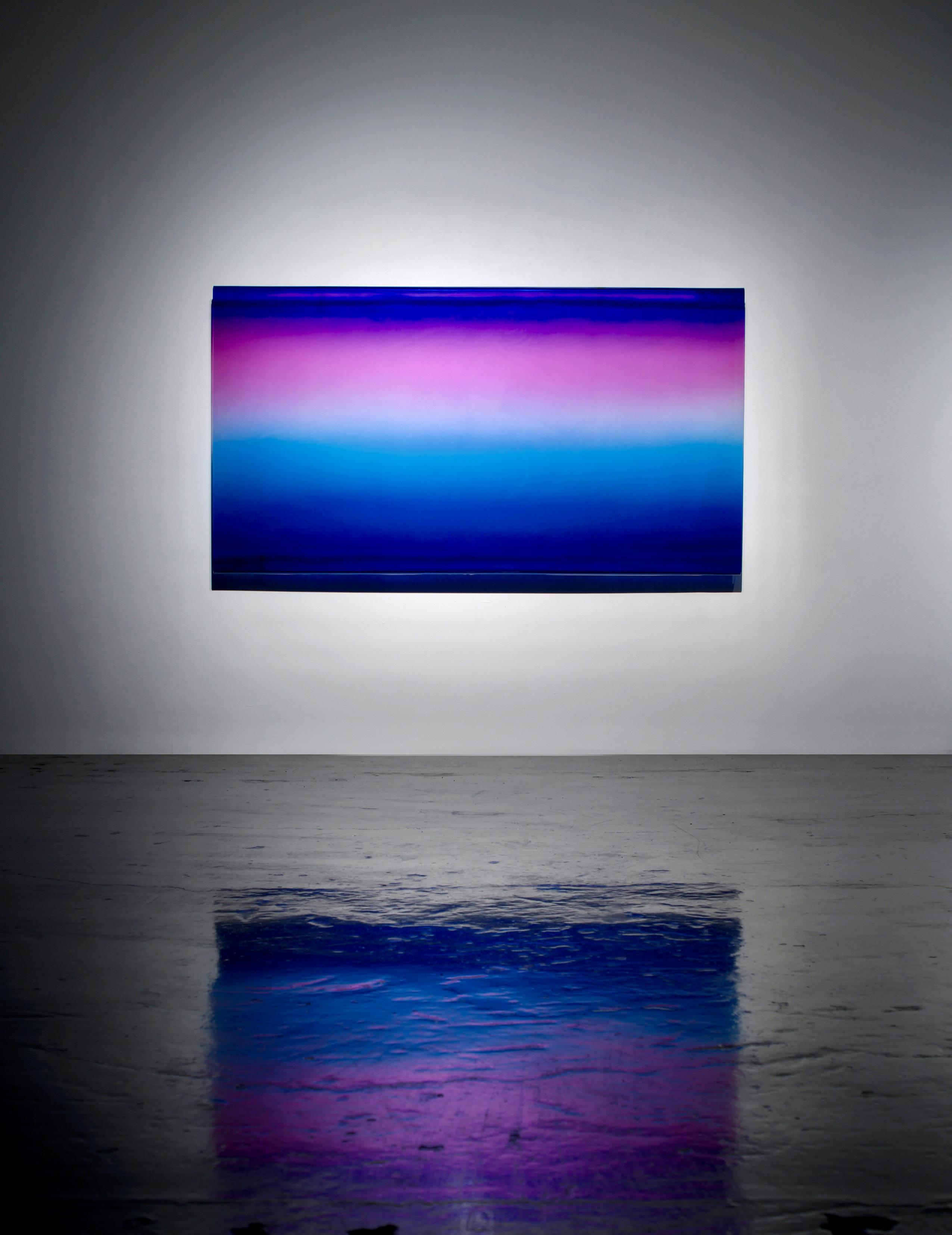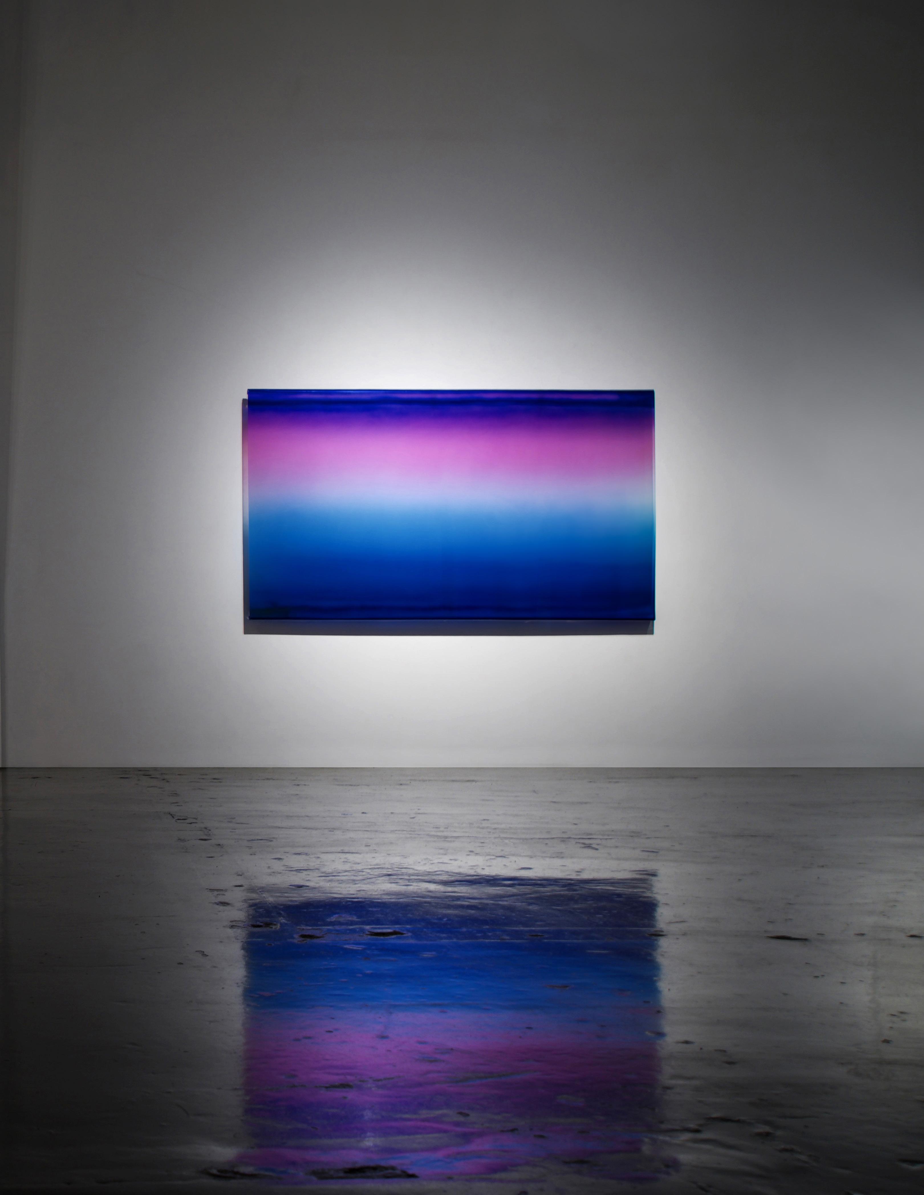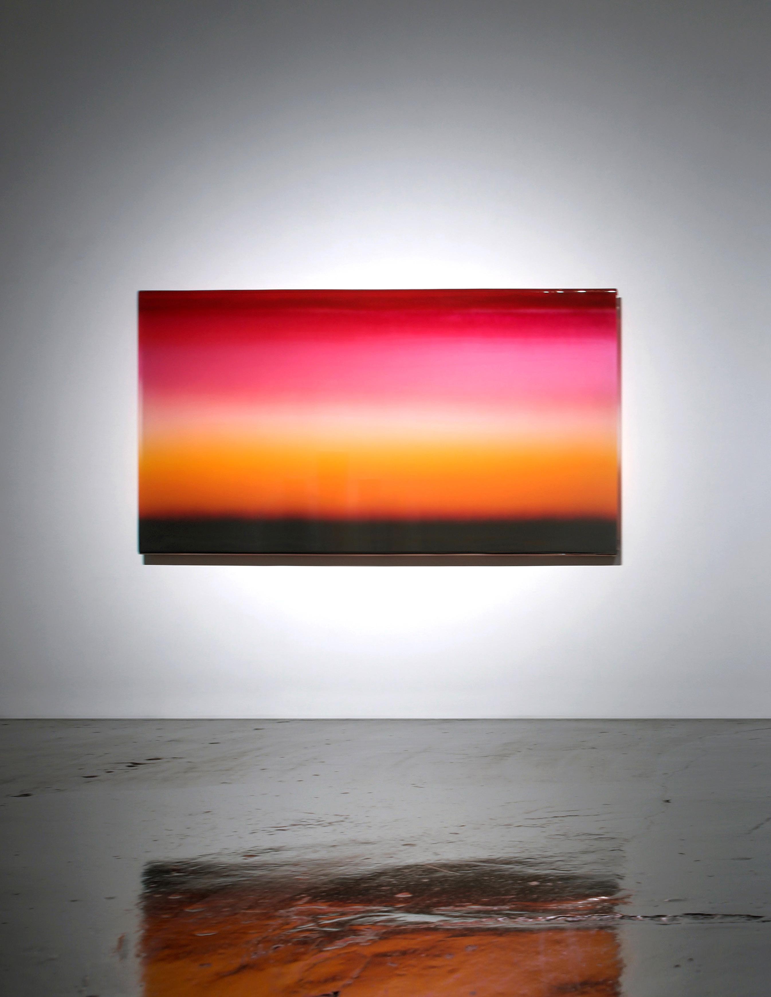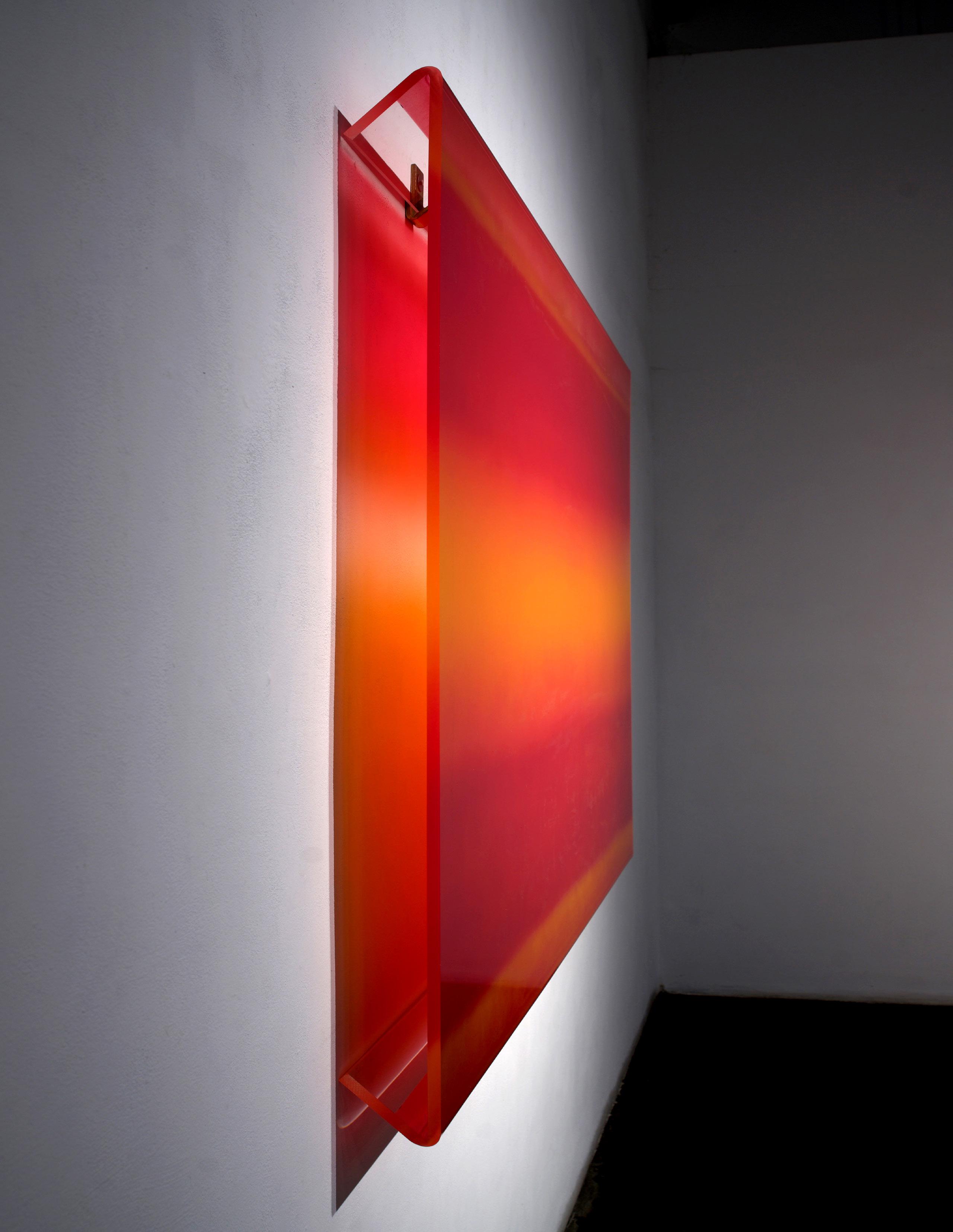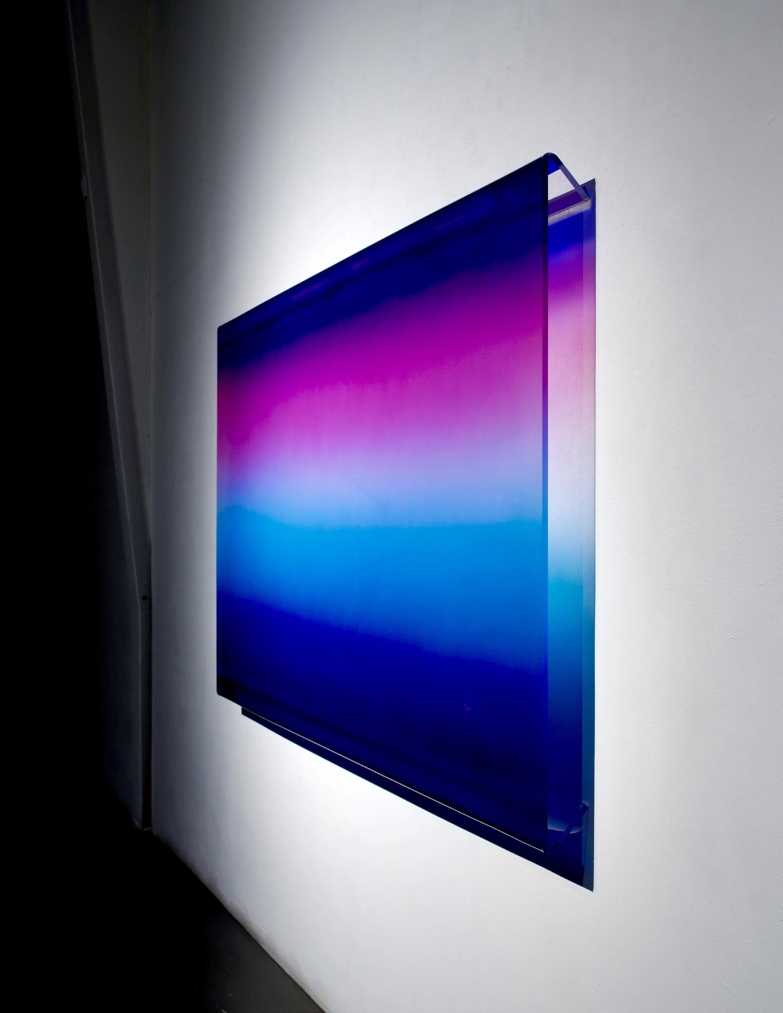 Casper Brindle refers to his latest series as Veils , a poetic nod to the interplay between concealing and revealing. Painted on the reverse side of clear sheets of pristine acrylic, the Veil paintings hover between transparency and opacity. Viewed head on, Brindle’s Veils appear as opaque washes of saturated color, their surfaces smooth and impeccably finished. Viewed from the side, one discovers their magical, multicolored shadows.