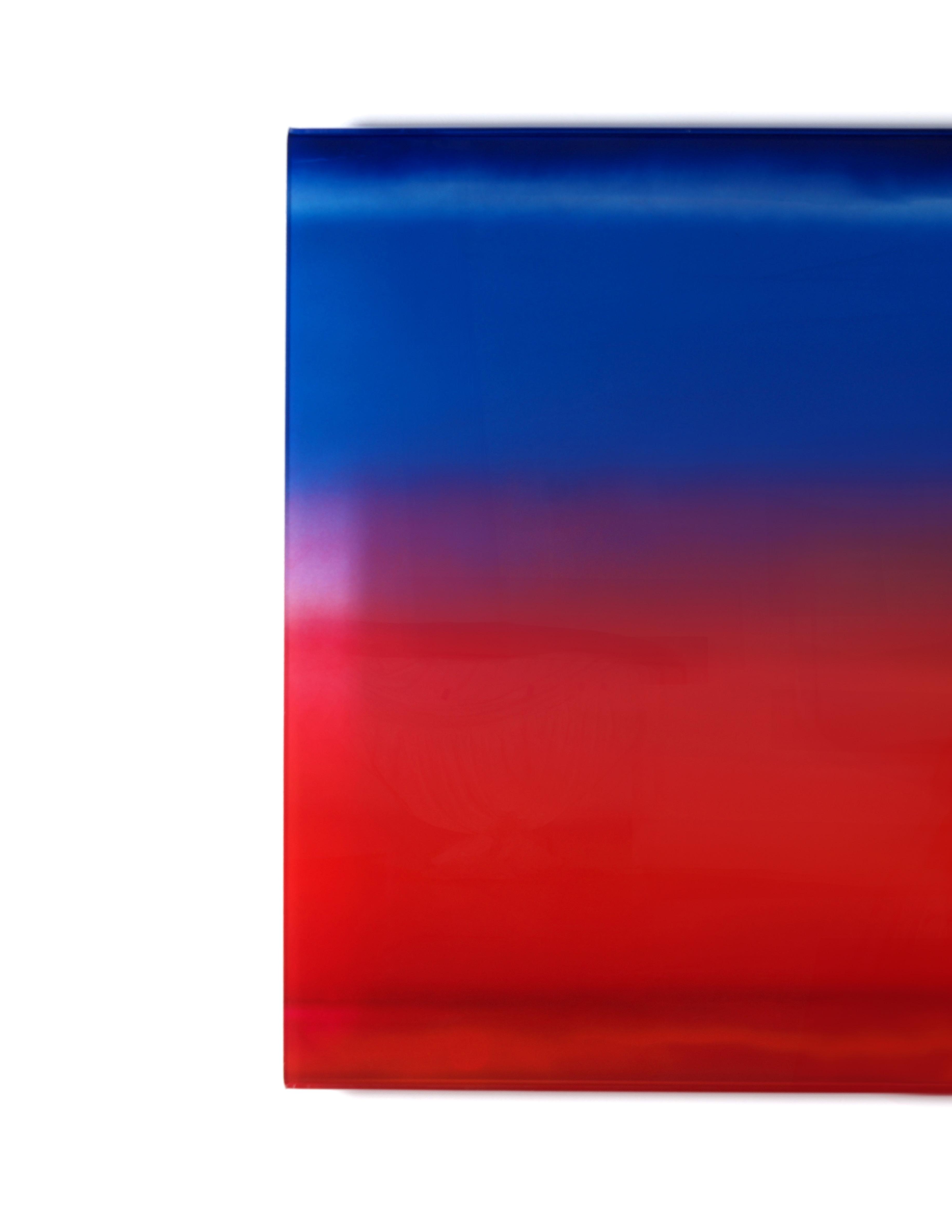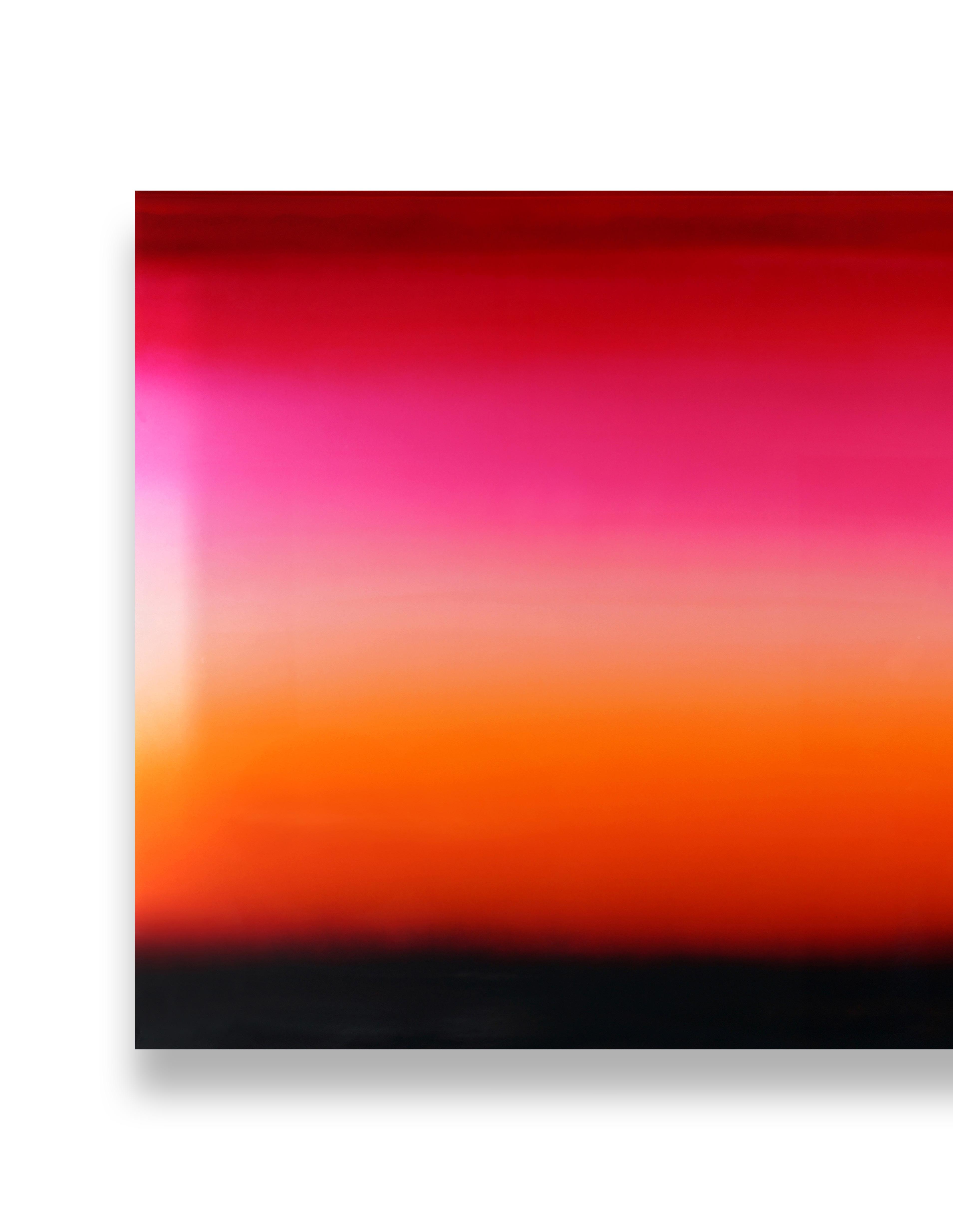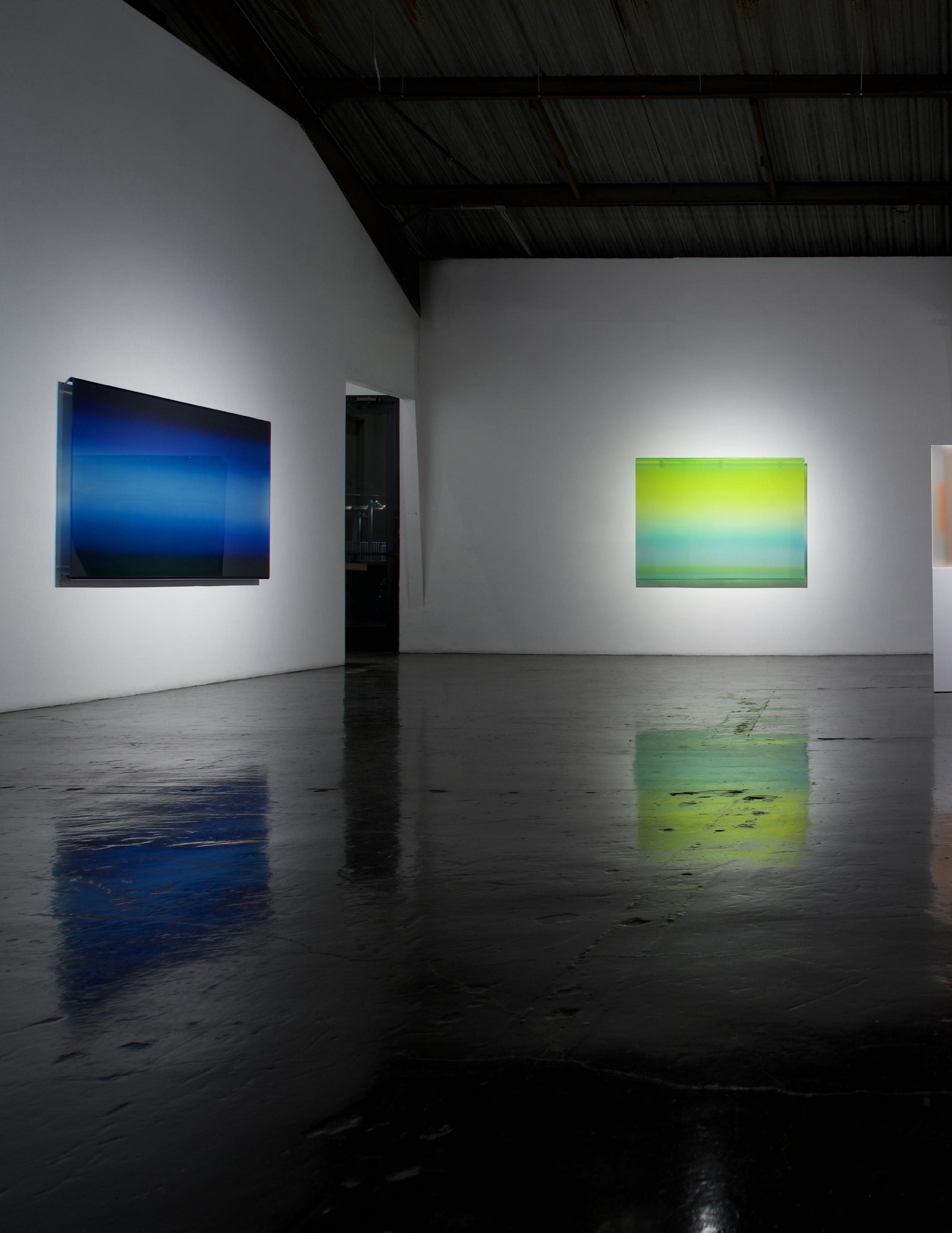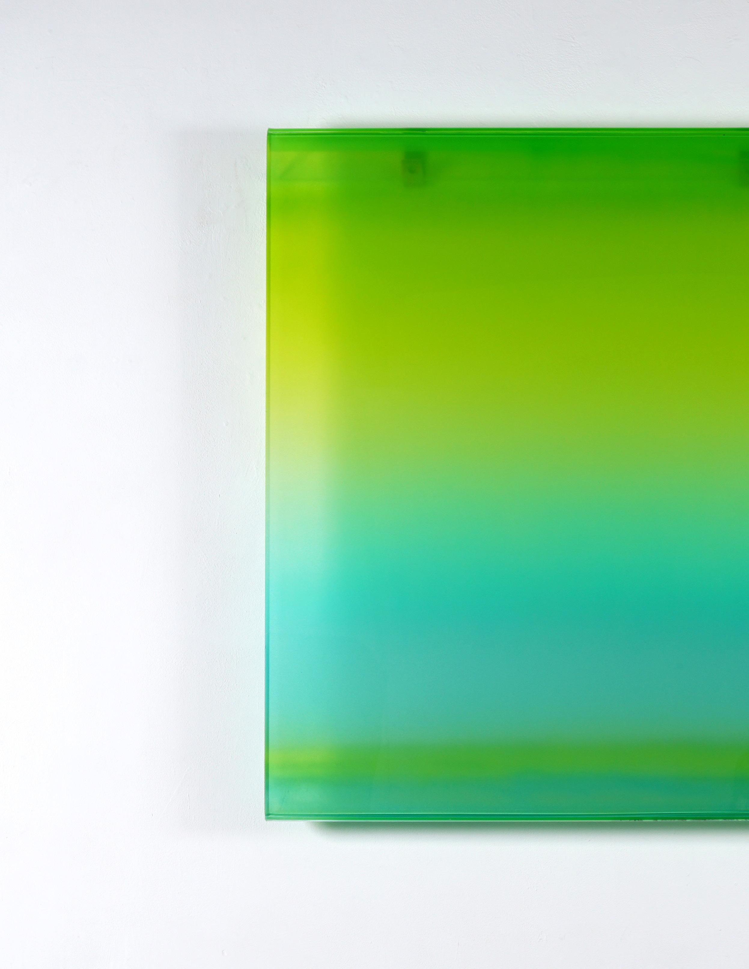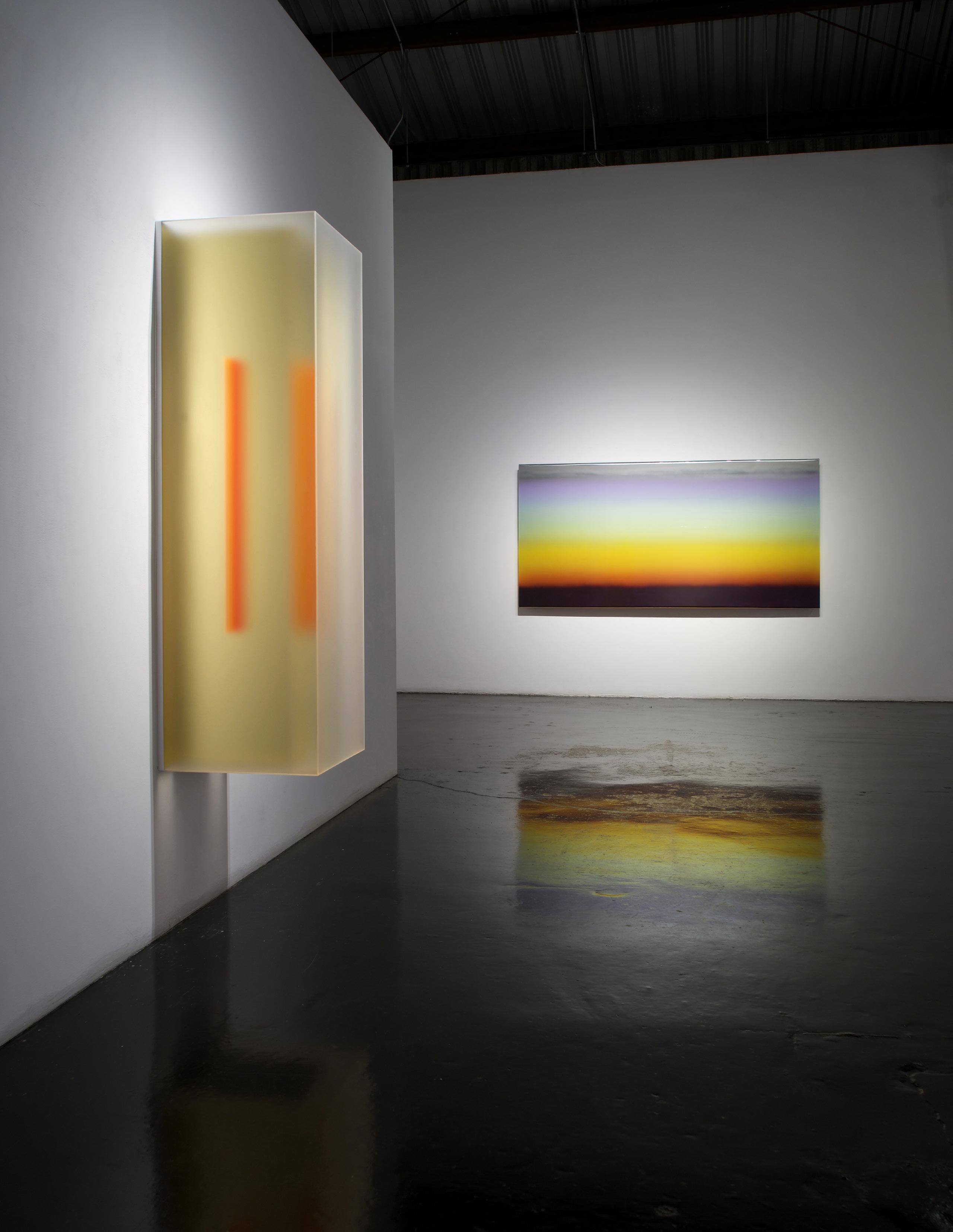 Casper Brindle refers to his latest series as Veils , a poetic nod to the interplay between concealing and revealing. Painted on the reverse side of clear sheets of pristine acrylic, the Veil paintings hover between transparency and opacity. Viewed head on, Brindle’s Veils appear as opaque washes of saturated color, their surfaces smooth and impeccably finished. Viewed from the side, one discovers their magical, multicolored shadows.