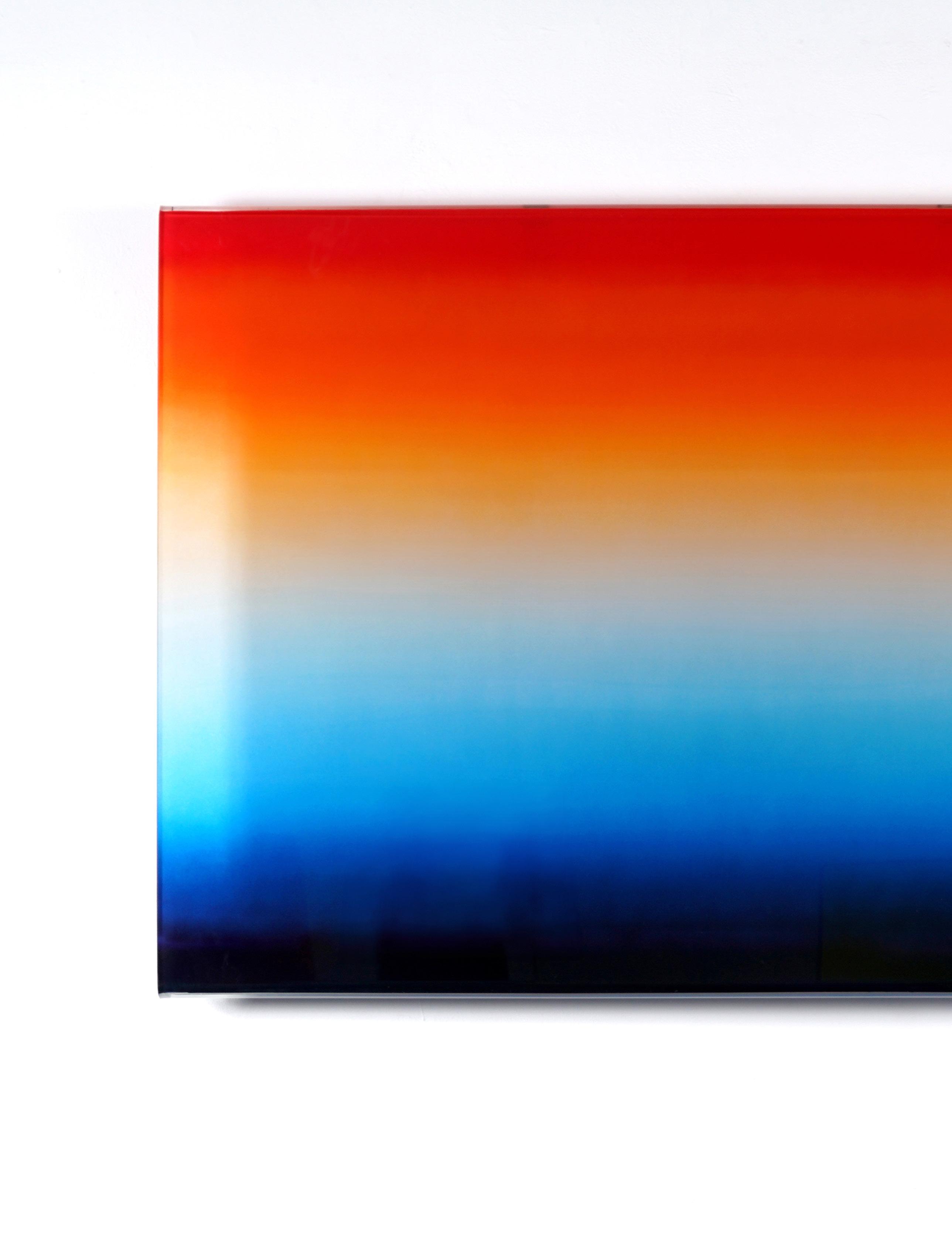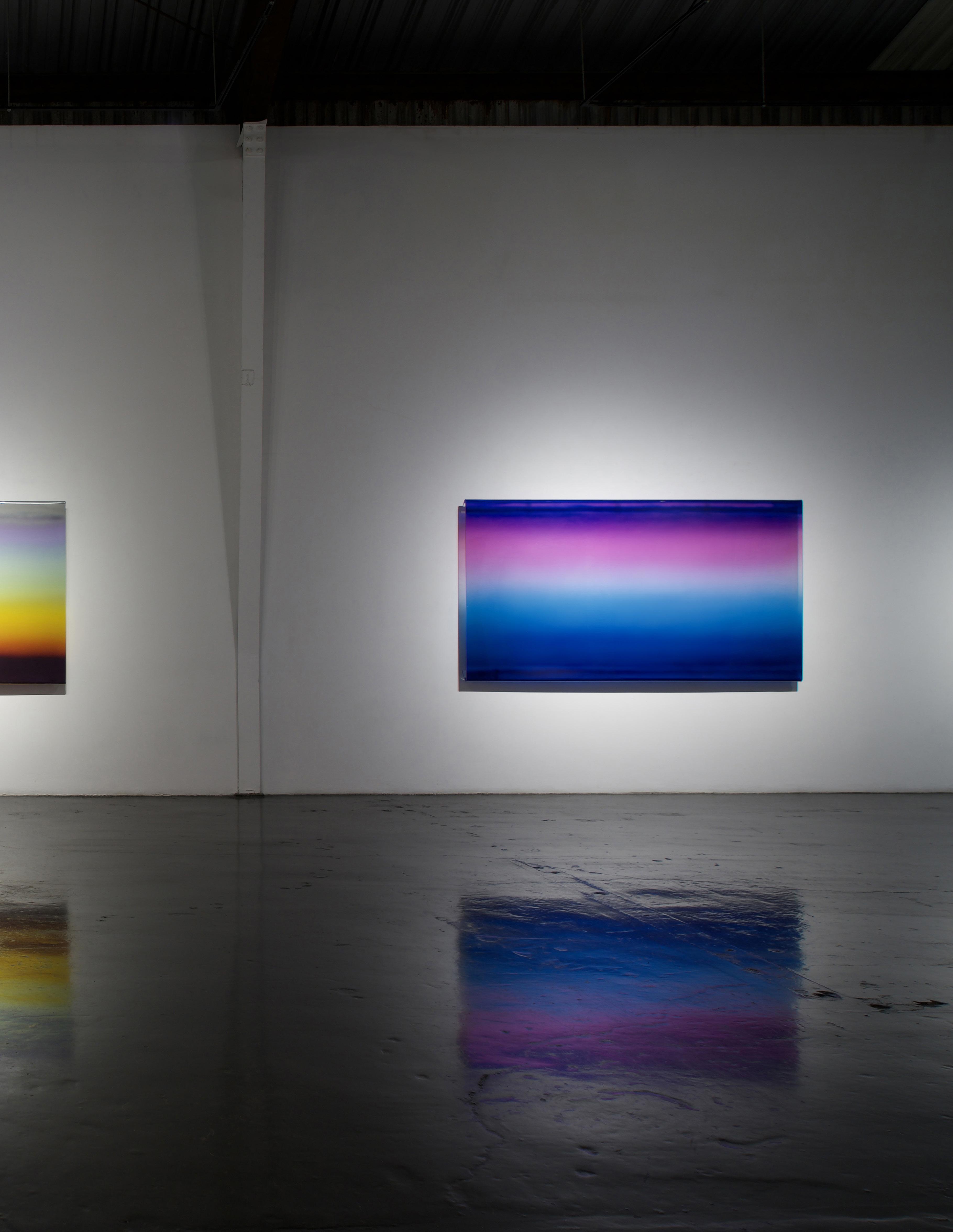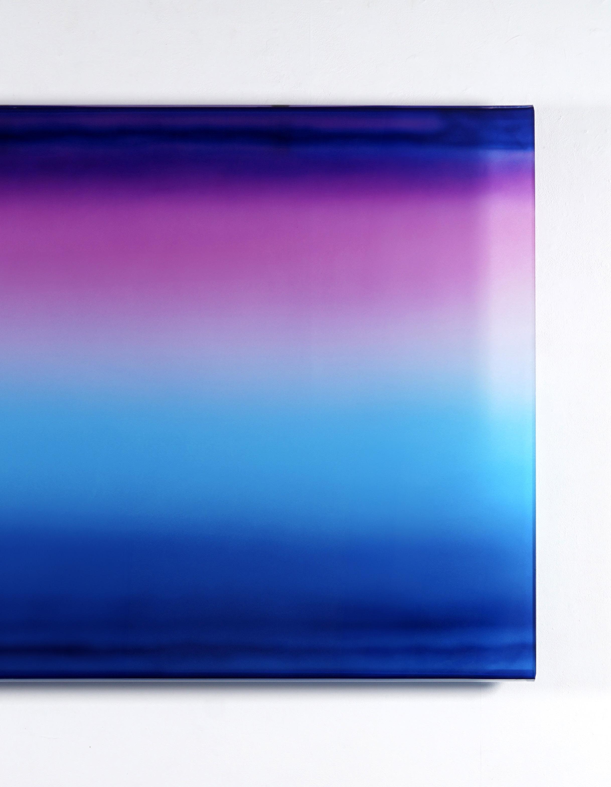 Extending forward into three dimensions, the format of the new Veil series lends his palette extra vibrancy, featuring layers of paint applied to the backs of clear acrylic sheets which are curled in at their tops and bottoms to allow the light to flow through them and refract back out into the surrounding space. Because Brindle applies his pigments to the backs of the surfaces, he has to start with the finishing details then builds to the base, in a reversal of the usual process.