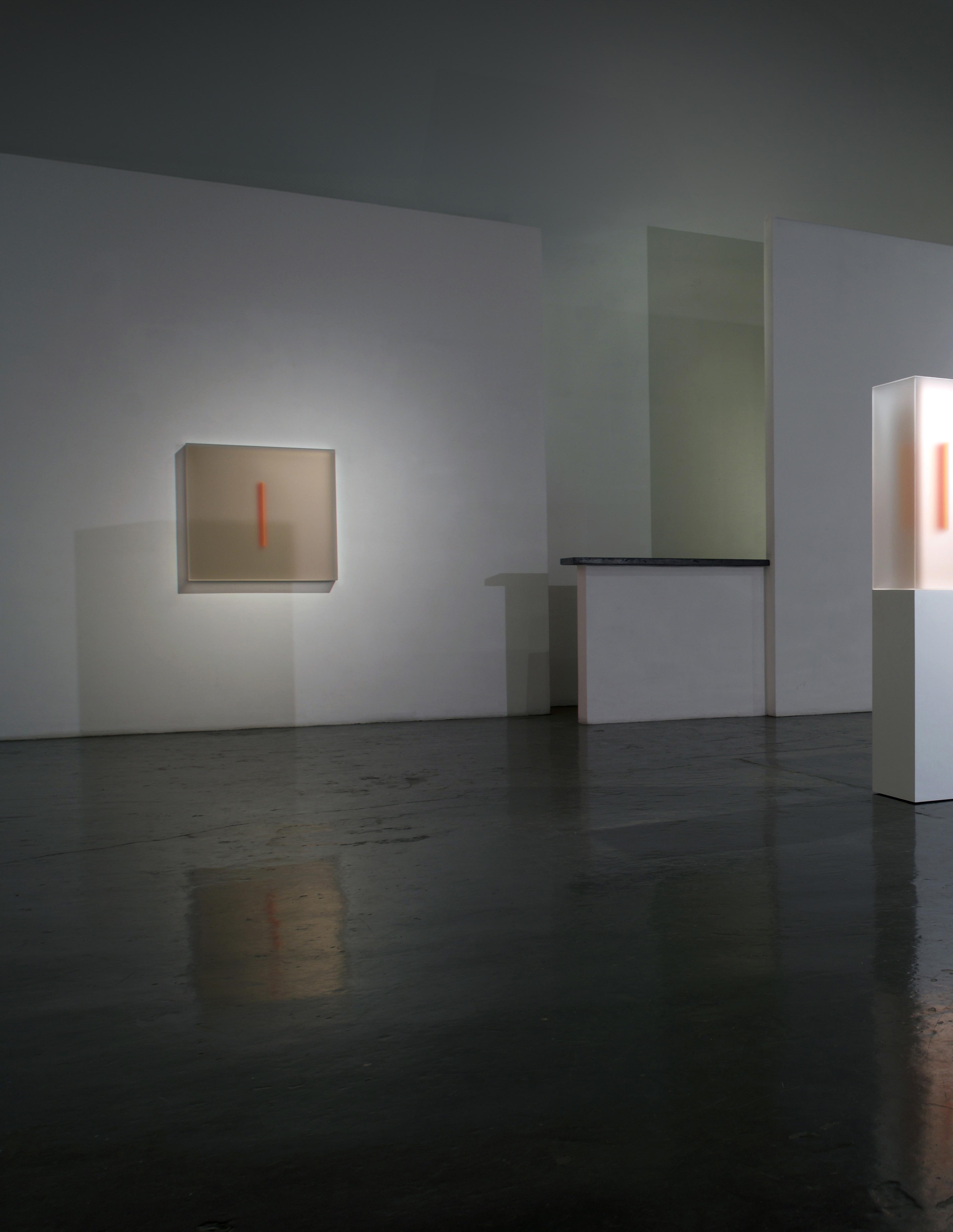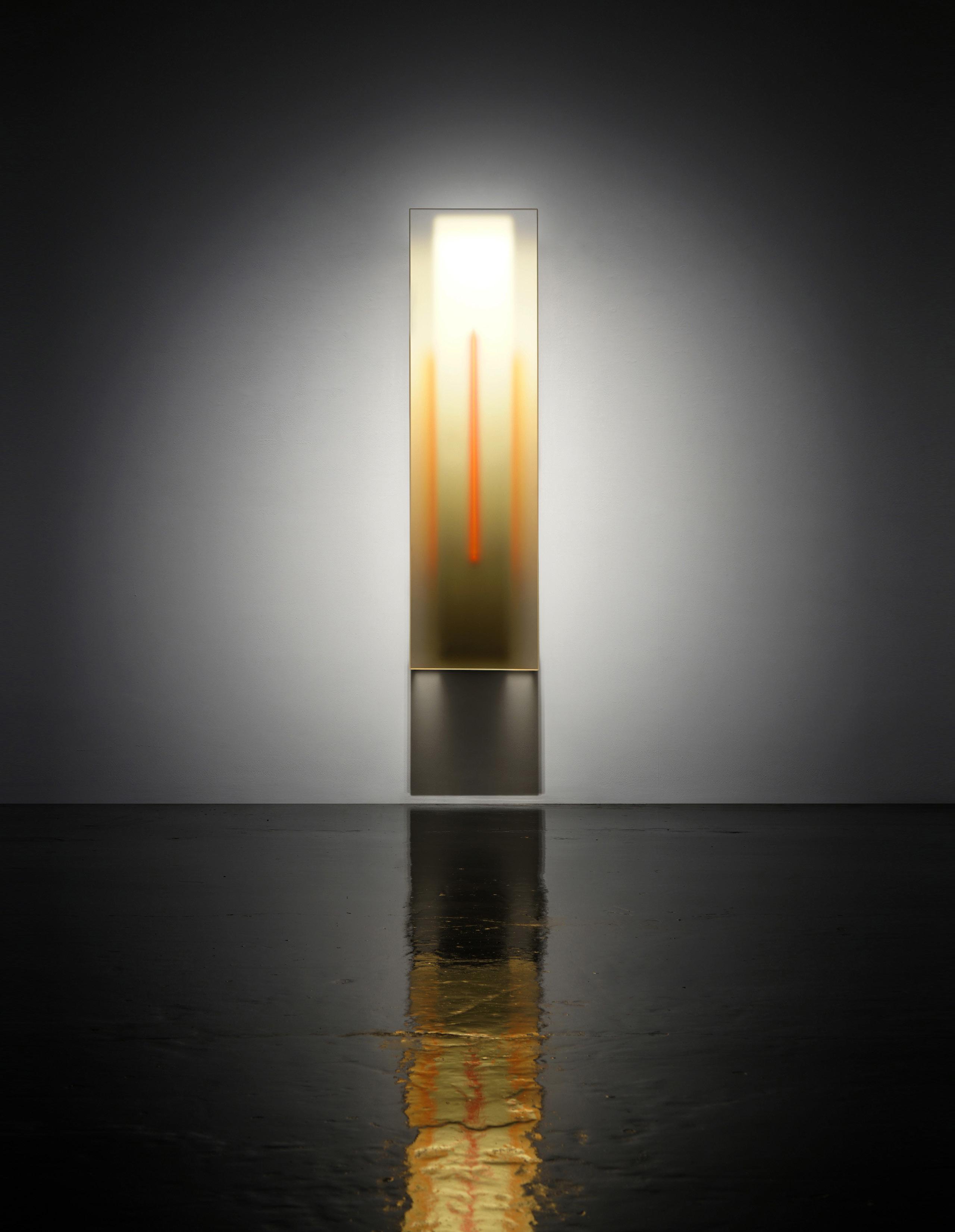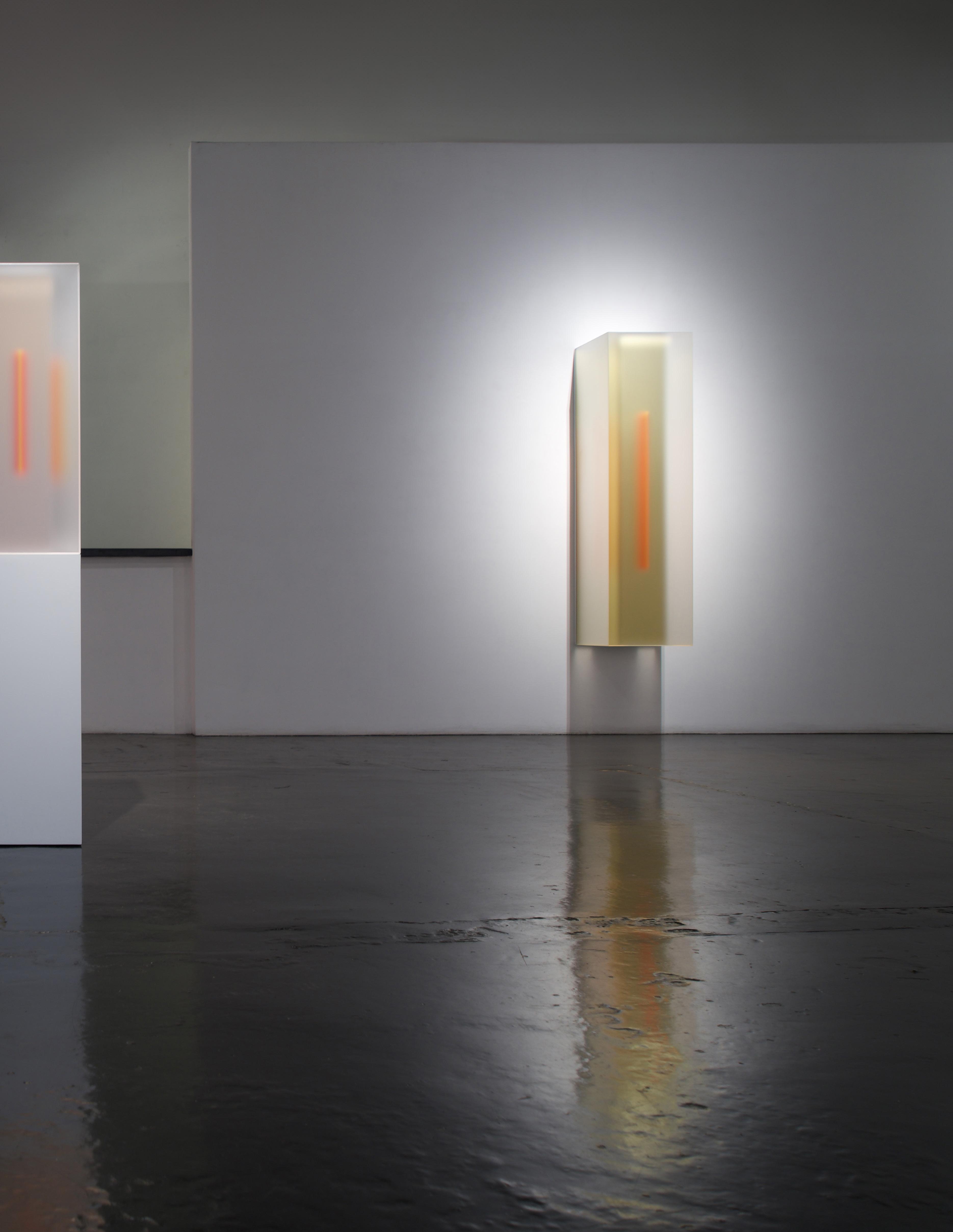 By then, Brindle’s glyph forms had already begun to outgrow the canvas, emerging into the gallery as threedimensional forms. Featuring tinted filaments set within translucent vertical rectangles, the new format allowed light to actually pass through them, via refractive paints that transmuted it into a beguiling gamut of nuanced colors that seem to shift and shimmer.