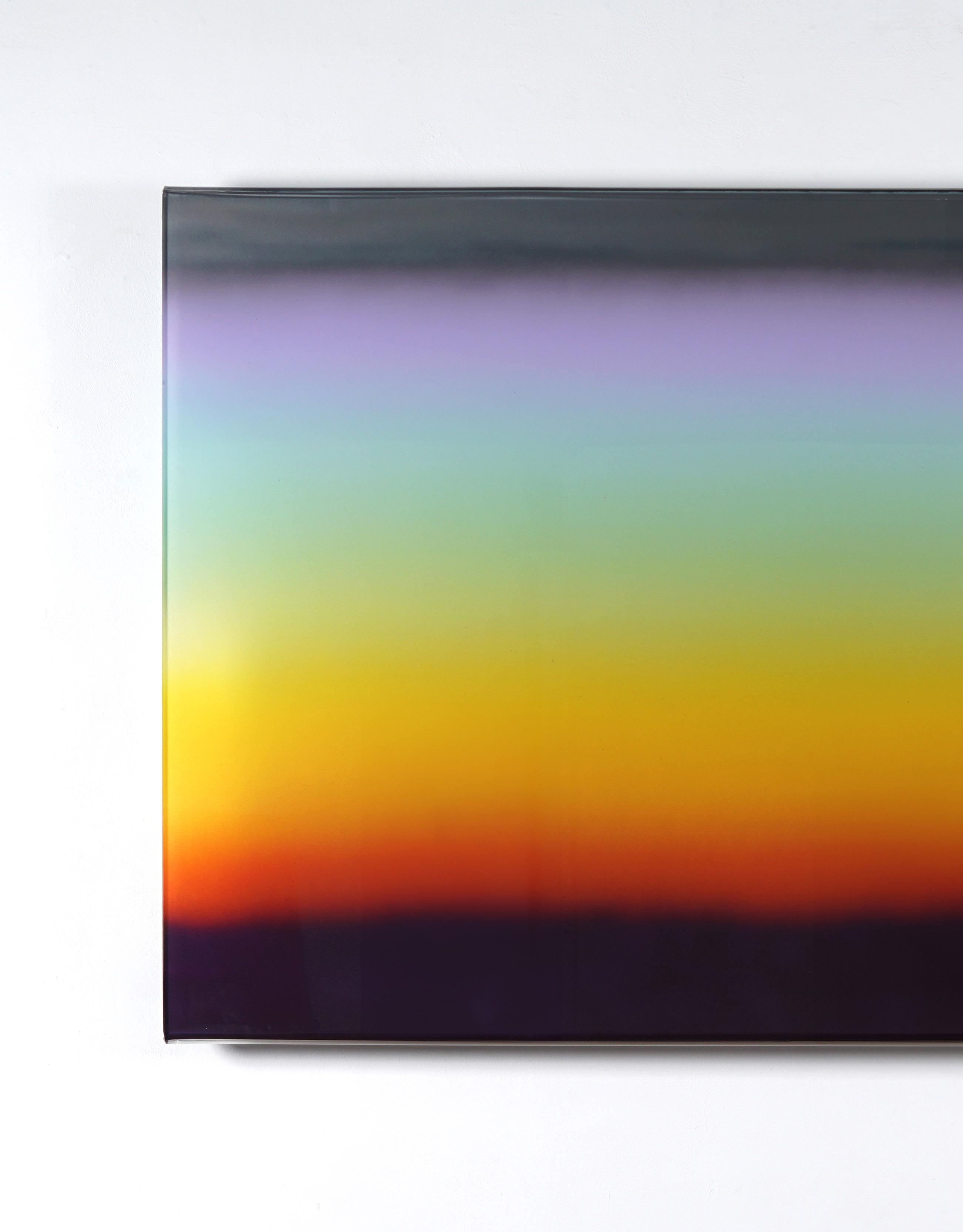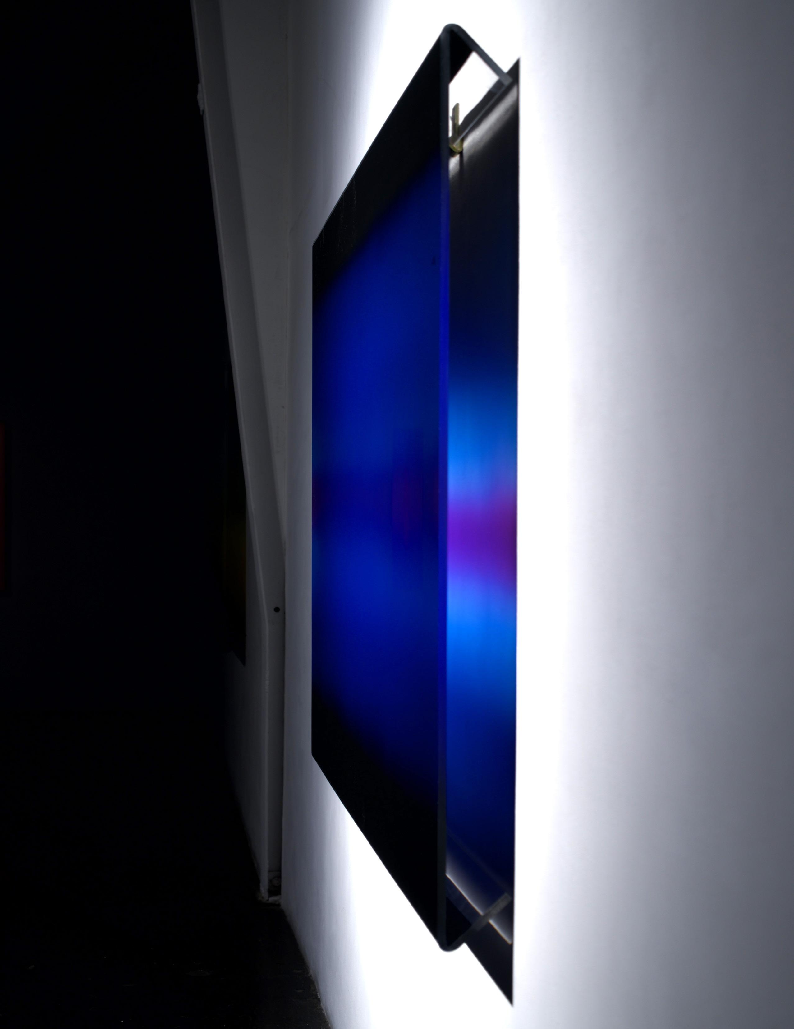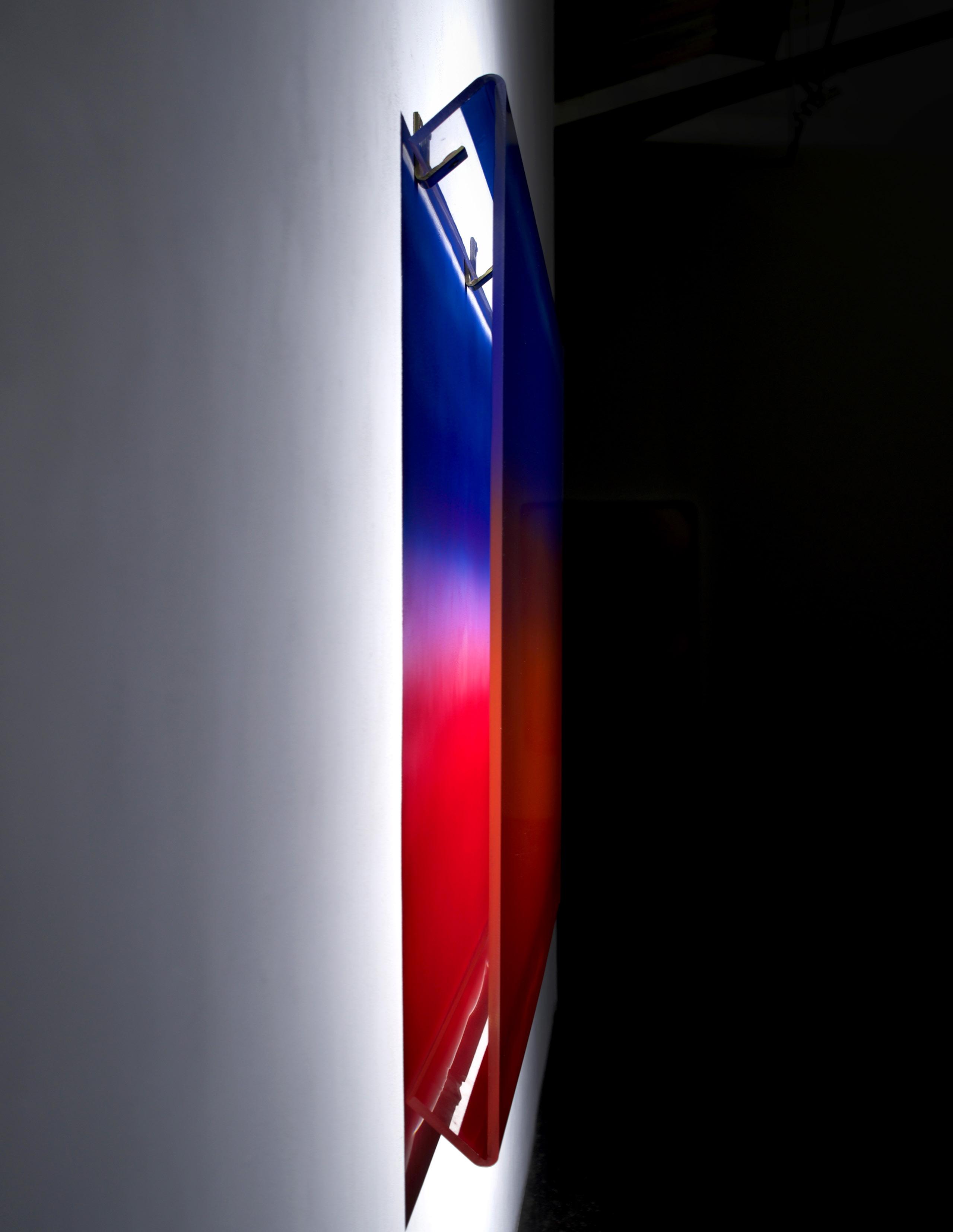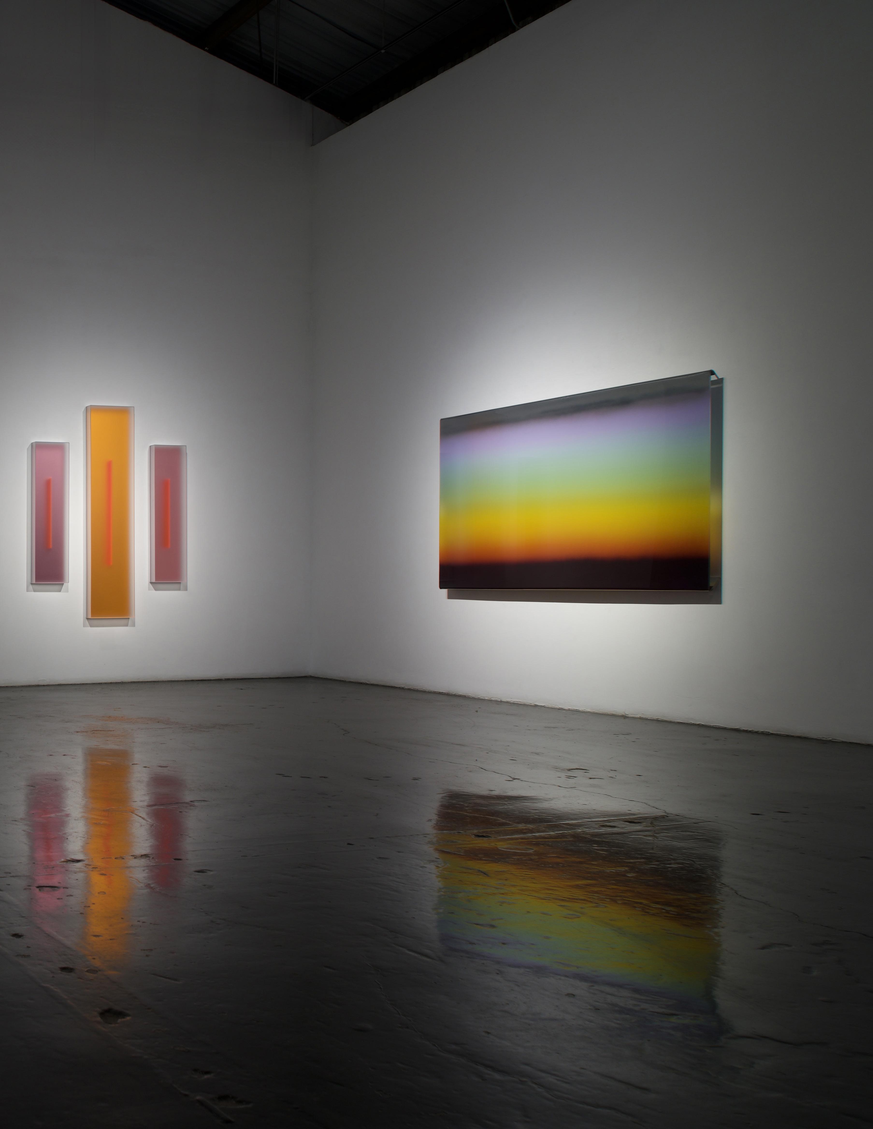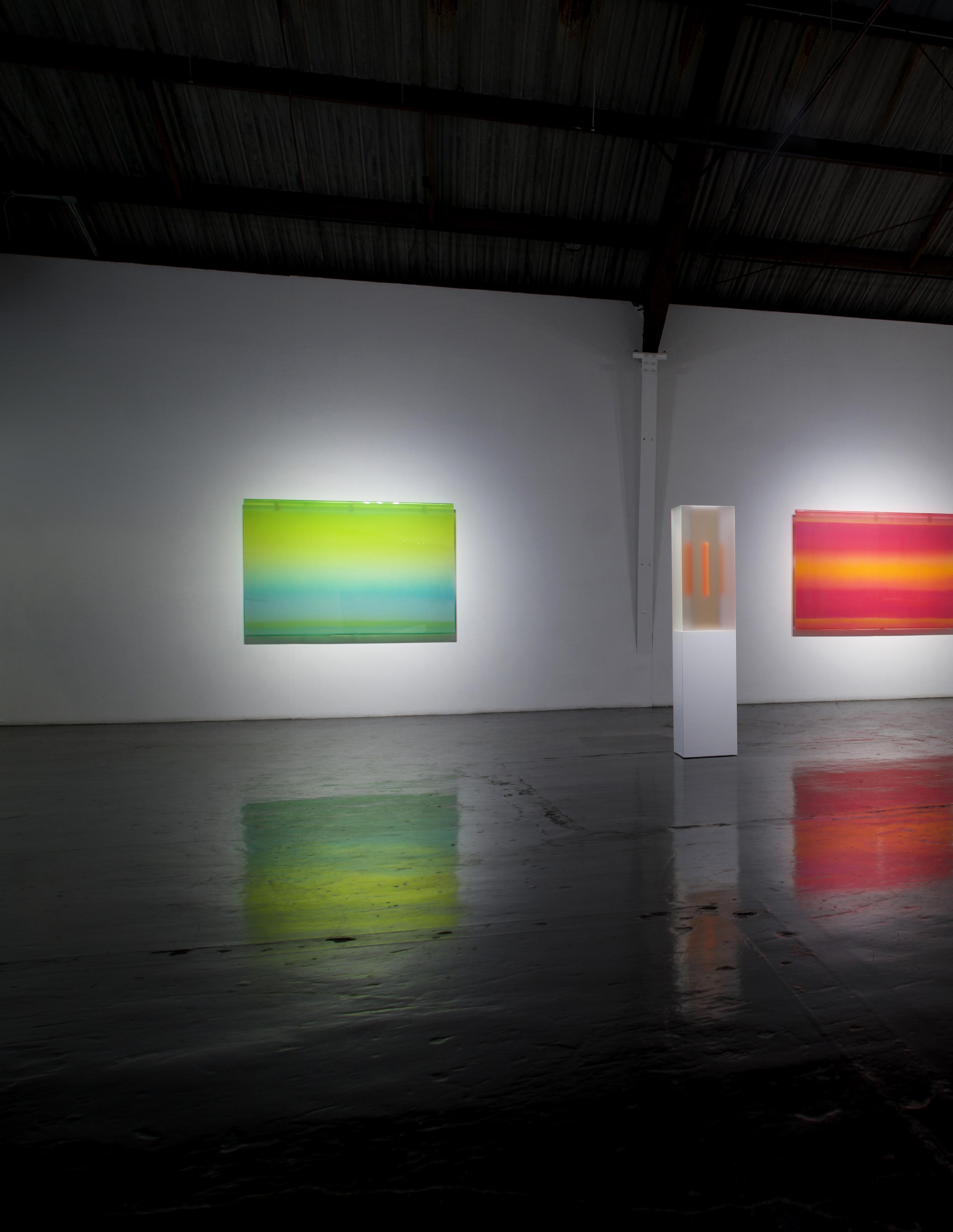 Casper Brindle is a maestro of refracted color. The affinity is both deeply intuitive and rigorously cultivated, the years spent in refinement of his craft evident in the lushly captivating effects he conjures from his materials. Entering the space of Brindle’s new exhibition, titled “Numina,” at William Turner Gallery, provides an immediate, strangely hushed immersion into his vision: his colors –applied to and filtered through various planes of clear acrylic – seem to glow, glimmer, radiate. They float like some dazzling color field mirage, gathering at dusk, or rising languidly off the Pacific as the marine layer dissipates in the warmth of sunlight. If you locked Mark Rothko, Peter Halley and Olafur Eliasson in a studio together with plenty of clear plastic, refractive paint and West Coast herbal supplements, this is what you might end up with.