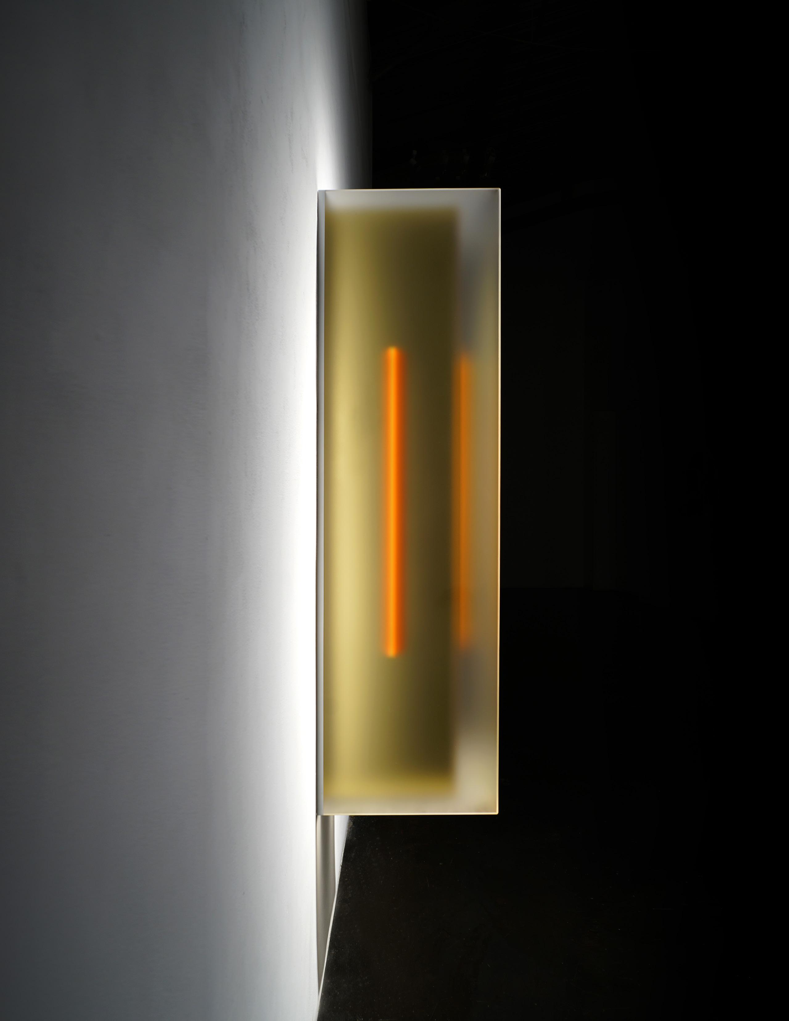 His new show offers several variations of these Light Glyph sculptures: some vacuum-formed, some with three filaments, some grouped in triptychs. Some with hard geometric corners and others with rounded edges that feel organic and seductive. Flaunting a charmingly low-tech, Minimalist sci-fi panache that would not be out of place on an episode of Star Trek (the original or TNG), they offer a glorious spectrum of unlikely metallic colors that are nothing short of sumptuous and yet seem to come out of a nature guide: pine green, tangerine, hyacinth.