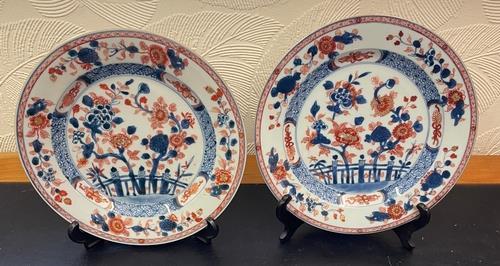 373. A GOOD PAIR OF 18TH.C CHINESE IMARI KANGXI PERIOD PLATES, 22.8CM AND 22.4CM IN DIAMETER