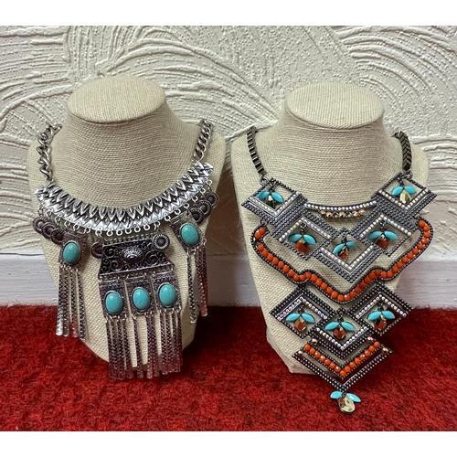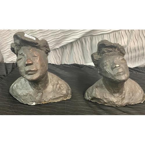 385. 2 X RESIN CAST ORIENTAL STYLE FIGURES WITH BIRD DECORATION, STAFFS, JUGS ETC.
