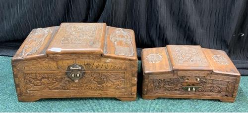 394. 2 X CARVED ORIENTAL STYLE CADDIES/BOXES WITH BRASS LOCKS (ONE PART OF ONE LOCK MISSING)