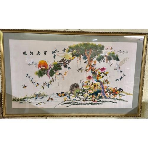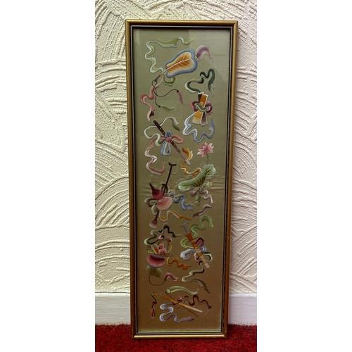 362. A 19TH/20TH.C FRAMED CHINESE EMBROIDERY DEPICTING RIBBONED EMBLEMS, THE FRAME 50CM X 16CM
