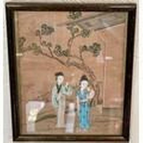 377. CHINESE: A FRAMED & GLAZED 19TH.C. CHINESE PAINTING ON SILK (THE FRAME 26.5(H) X 21.5(W) CMS)DEPICTING TWO WOMEN NEAR A TEMPLE WITH A TREE
