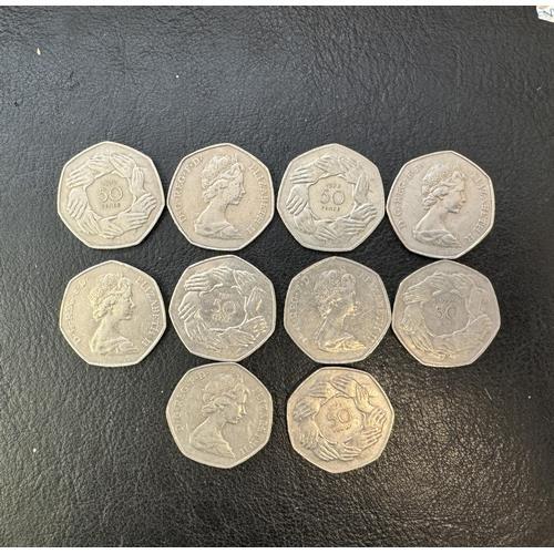 345. DECIMAL COINS : 10X 1973 50P 'RING OF HANDS' ENTRY TO THE EEC
