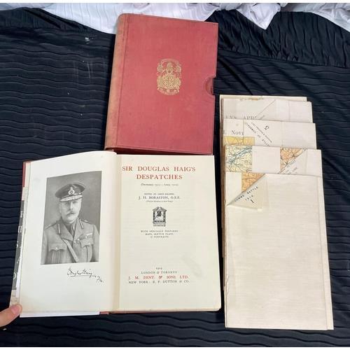 351. A HARDBACK EDITION OF 'SIR DOUGLAS HAIG'S DESPATCHES' BY J H BORASTON PUBLISHED JM DENT & SONS LTD. 1919 1ST ED H/B, TOGETHER WITH SIR DOUGLAS HAIG'S DESPATCHES MAPS INC. THE BATTLE OF THE SOMME 1916, THE THIRD BATTLE OF YPRES 1917, GERMAN OFFENSIVE ON THE SOMME 1918 ETC.