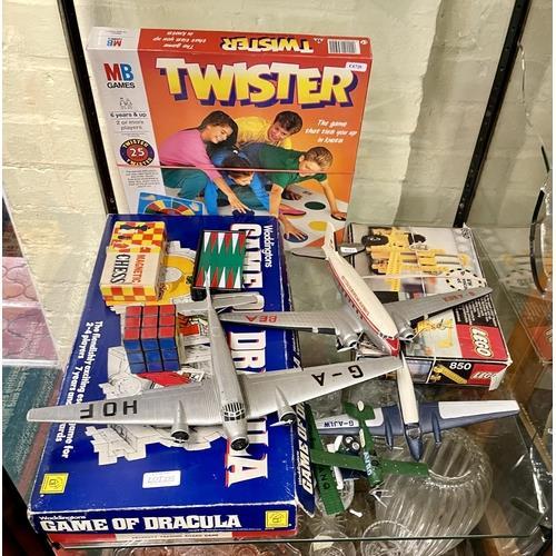 395. A QTY OF VINTAGE GAMES INC. LEGO, MONOPOLY, THE GAME OF DRACULA, 3 X MODEL AEROPLANES, RUBIKS CUBE ETC.