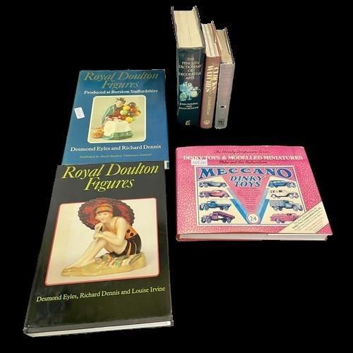 357. 6 X HARDBACK REFERENCE BOOKS INC. ROYAL DOULTON FIGURINES IN TWO VOLUMES, MECANNO DINKY TOYS, THE PENGUIN DICTIONARY OF DECORATIVE ARTS ETC.
