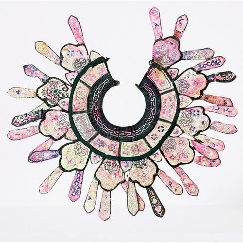 370. A LARGE 19TH CENTURY CHINESE SILK EMBROIDERED FABRIC COLLAR, APPROX 51CM WIDE
