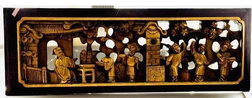 382. CHINESE: A CHINESE GILT WOOD PANEL LATE 19TH/EARLY 20TH C. - 42.5(L) X 14.8(H) CMS