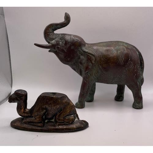 366. A SOUTH-EAST ASIAN BRONZE ELEPHANT AND A BRONZE CAMEL, ELEPHANT 18CM LONG