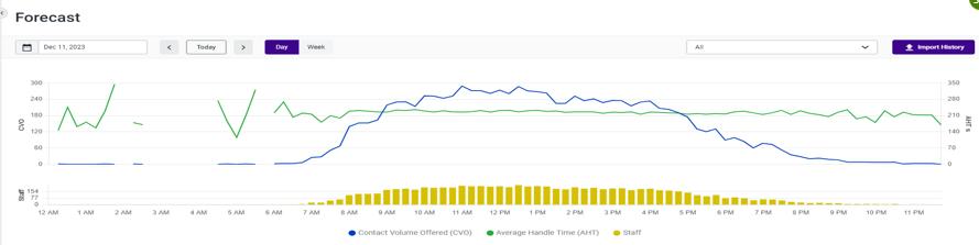 WFM will show “Forecasted,” “Predicted,” and “History” time series, allowing users to compare the predicted/projected performance and the actual performance, as well as make realtime decisions on the actions to undertake.
