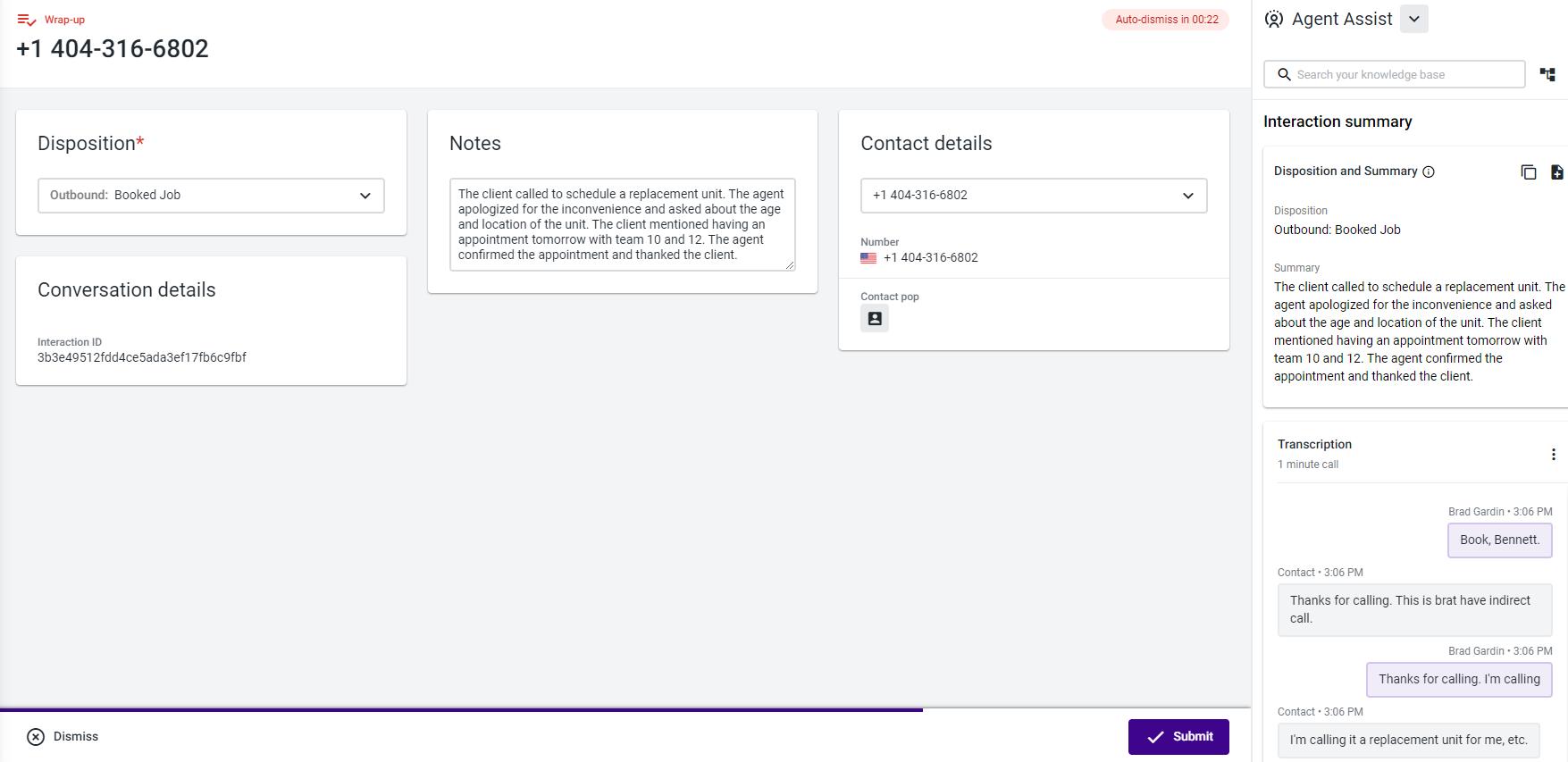 2. The generated summary is instantly presented to the user alongside the appropriate call disposition.