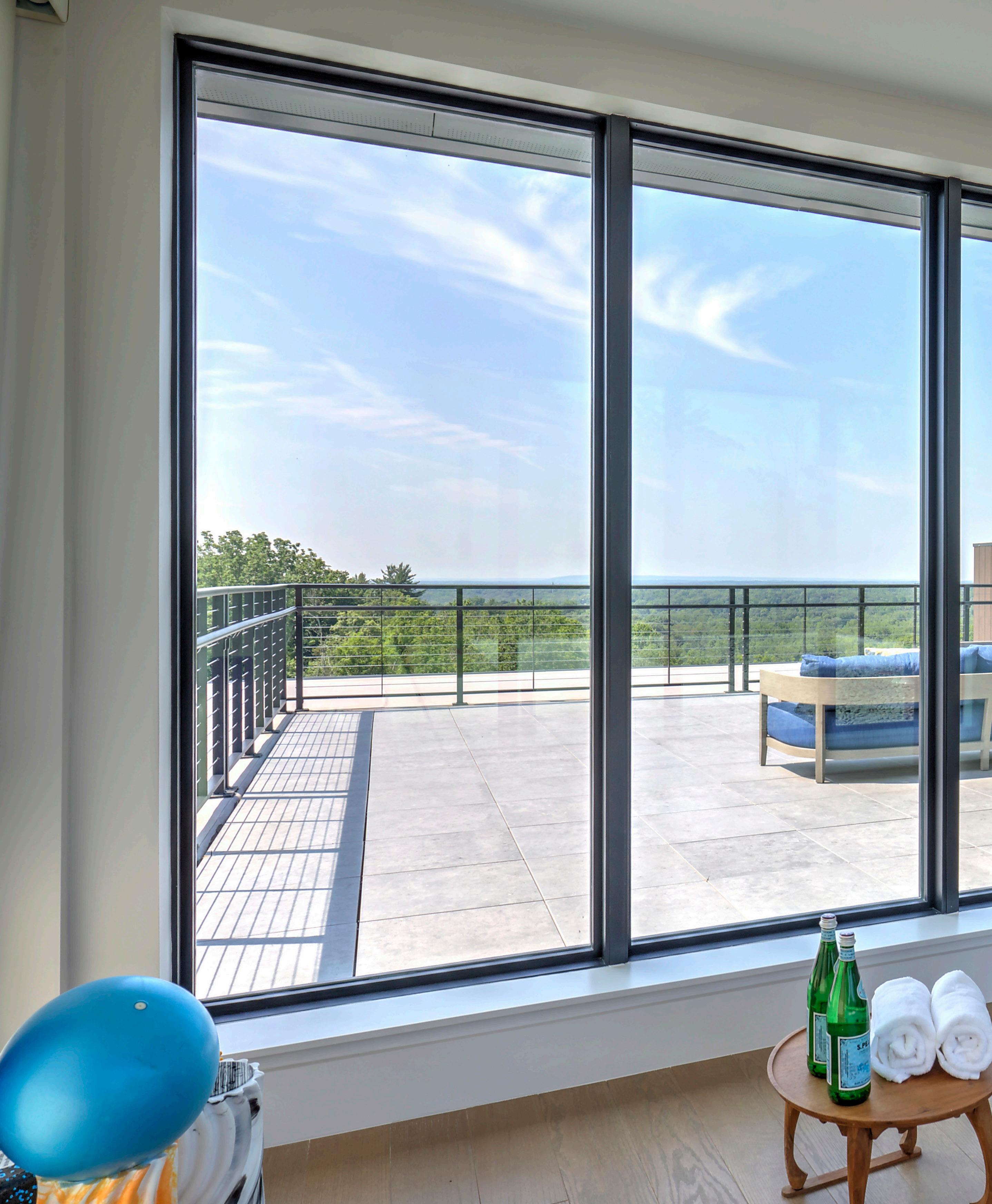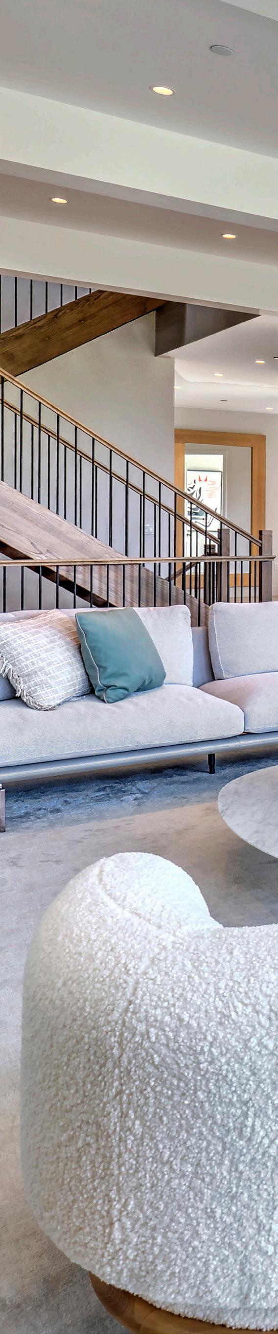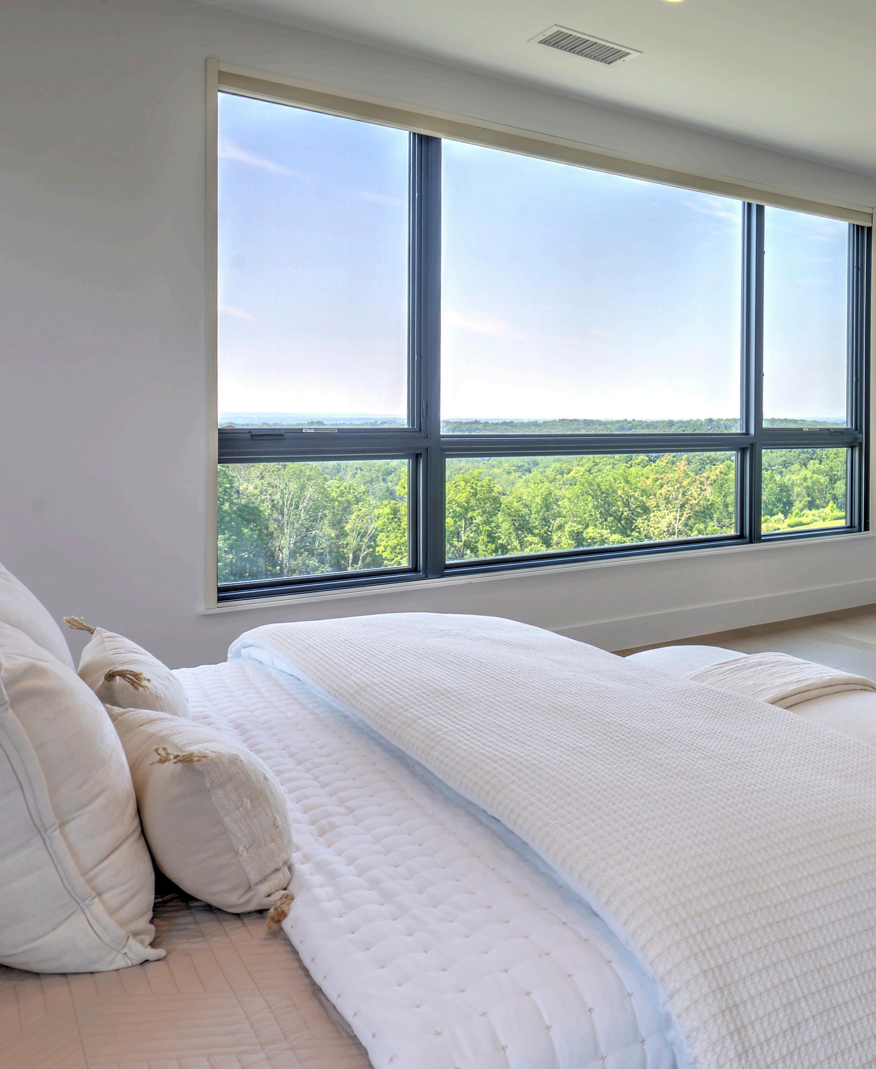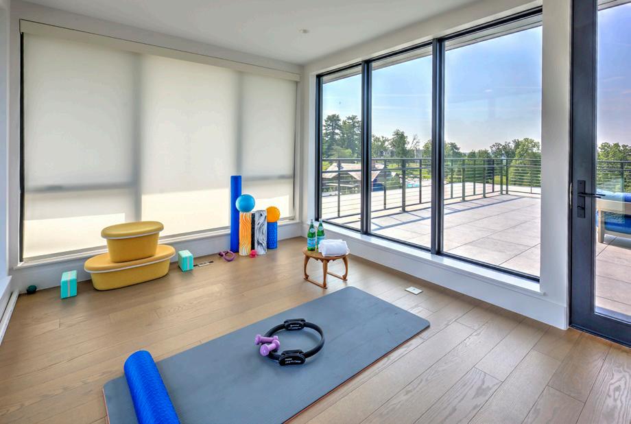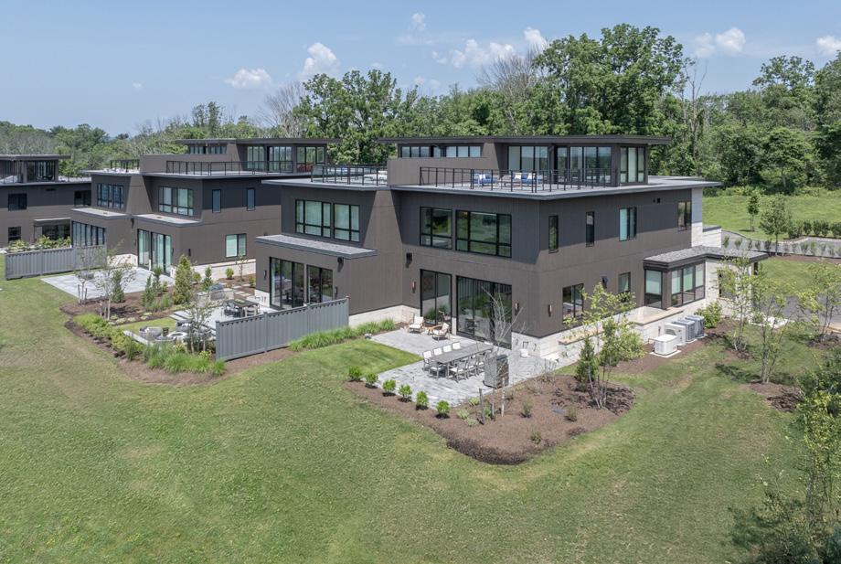 A flexible 12-room floor plan of two bedrooms and a bonus room, offers a roomy foyer with a custom California Closet, a fireside living room filled with natural light, chef’s center island kitchen with upgraded appliances from Sub-Zero, Wolf and Cove as well as Cambria quartzite counters and backsplashes, a dining room opening to the rear terrace providing a gas line for a future grill and firepit, sunny window-walled office, powder room and mud room adjoining the two-car garage. Upstairs, an impressive primary suite has far-reaching views, a sitting area, enormous walk-in California Closet and spa-inspired designer bath. This level also contains another bedroom with a walk-in California Closet, a bonus room featuring two California Closets, a laundry room and a full bath. The multi-use third level belvedere is wrapped in glass walls with endless views from within or the enormous roof top terrace, both taking in miles of pastoral scenery. Completing the layout is a finished walkout lower level with an expansive recreation room, 12-footwide glass door to a patio and exterior staircase, plumbing for future bath, plus ample storage and utility space.