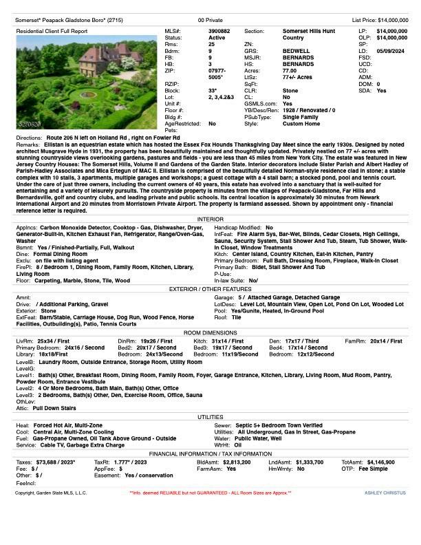 Offering Price $14,000,000 The Ashley Christus Group | Turpin Real Estate c. 908.625.4116 | o. 908.234.9100 x 214 achristus@turpinrealtors.com www.AshleyChristus.com Ellistan Peapack, New Jersey Shown by appointment only Financial reference letter required