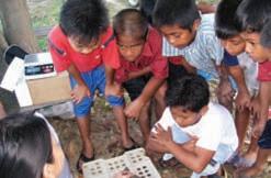 Left: Most people in Madagascar are under the age of 12 Right: Villagers at Antsakoamasy examine brochures and a copy of TSA Magazine. Located just outside the Cap St. Marie Special Reserve, this village could become a model for providing community-based protection for Radiated Tortoises.