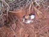 (a) An unfinished two-holed nest (4 June 2006) with chambers 60 mm apart; (b) a covered two-holed nest (4 June 2006); (c) excavating a twoholed nest (4 June 2006) with chambers 90 mm apart, one egg in left chamber and three eggs in right chamber; (d) excavating a two-holed nest (10 June 2006) with chambers 110 mm apart, two eggs in left chamber and three eggs in right chamber; (e) an excavated 2-hole nest (4 June 2006) with chambers 60 mm apart, two eggs in left chamber and three eggs in right chamber; and (f) a two-holed nest (4 August 2006) with all four eggs in the right chamber.