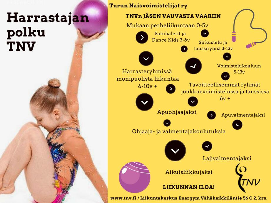 TNVn iloisille tunneille voivat osallistua ihan kaikki. Tuntitarjontaa löytyy jokaiselle viikonpäivälle, joten on helppoa löytää jokaiselle lapselle mieluisa ja perheen aikatauluihin sopiva liikuntaharrastus. Tunnit on suunniteltu lasten liikunnallisen kehityksen pohjalta ja lapsia ohjaavat koulutetut aikuiset ohjaajat.