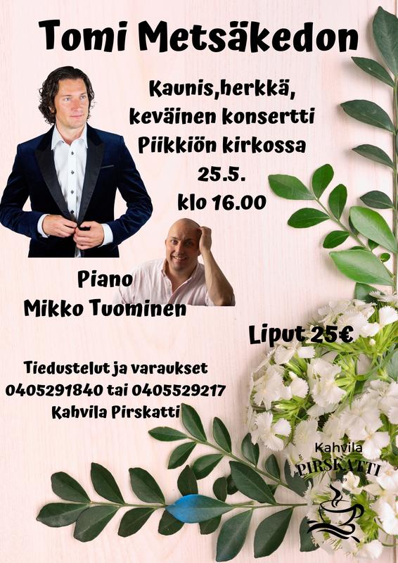 / 0405529217. Konsertin tuotto lahjoitetaan Tomi Metsäkedon palkkion jälkeen Piikkiö Päivät ry:lle.