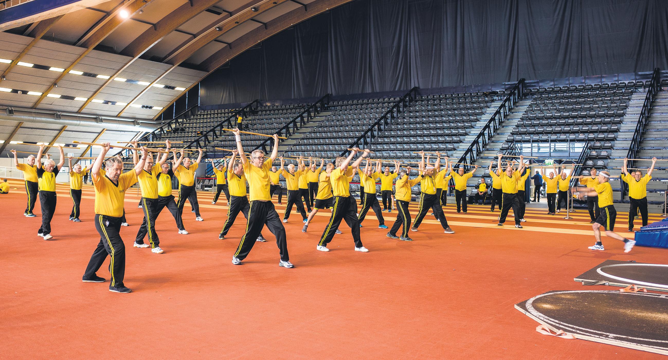Turun urheiluhallilla Kupittaalla on taas tuttu keskiviikkoinen aamupäivä. Sadat kelta-musta -pukuiset ikämiehet reippailevat yhdessä hymy huulillaan. Osa kävelee, osa voimistelee, osa polkee kuntopyörää tai soutaa soutulaitteella – saattaapa joku tehdä lihaskuntotreeniäkin.