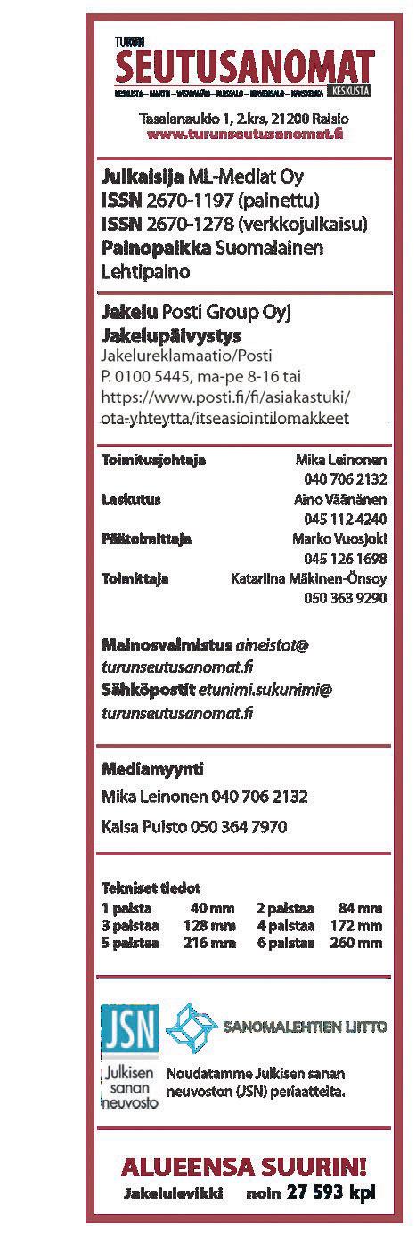 Painovalmiit aineistot tulee toimittaa aineistot@turunseutu sanomat.fi -osoitteeseen torstaihin 5.1.2023 kello 12 mennessä. (Ilmoitusvaraukset ja valmistettavat aineistot viimeistään 4.1. aamupäivällä)