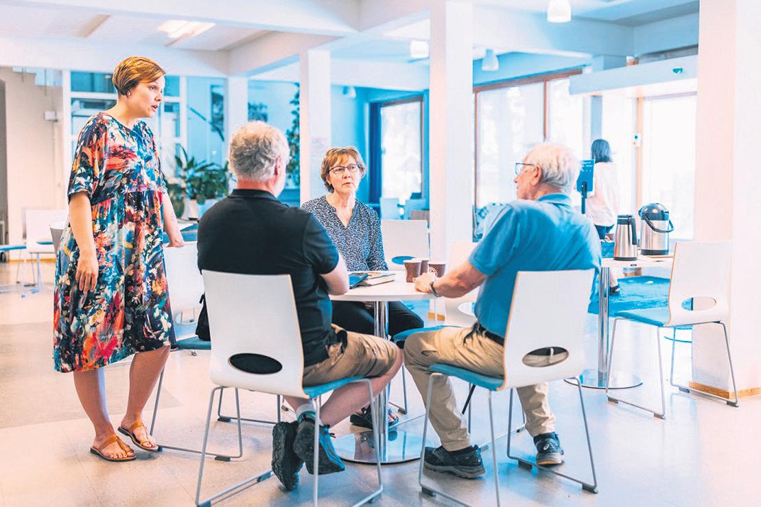 Yhteisökehittäjä Essi Leikas ja olohuonekävijöitä Auralassa. Kuva: Heikki Räisänen.