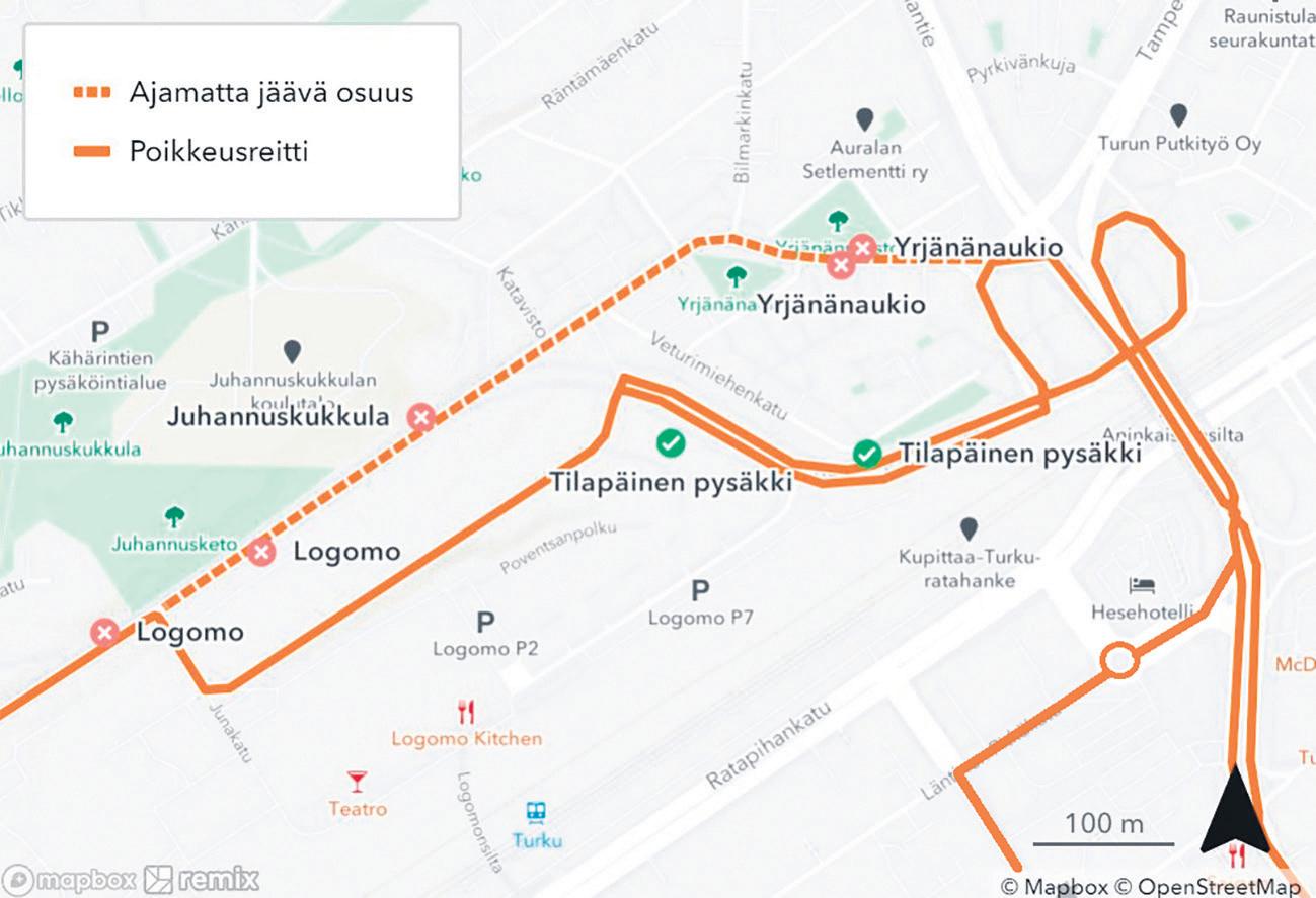Pysäkit 1016 ja 1017 Logomo, 1051 Juhannuskukkula sekä 1028 ja 1050 Yrjänänaukio ovat pois käytöstä. Poikkeusreiteillä on käytössä tilapäinen pysäkkipari; 1005 ja 1006 Vaunukatu. Fölin poikkeusreitit ovat käytössä ensi kesän asti. Marko Vuosjoki