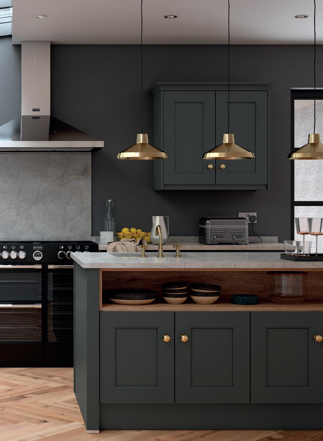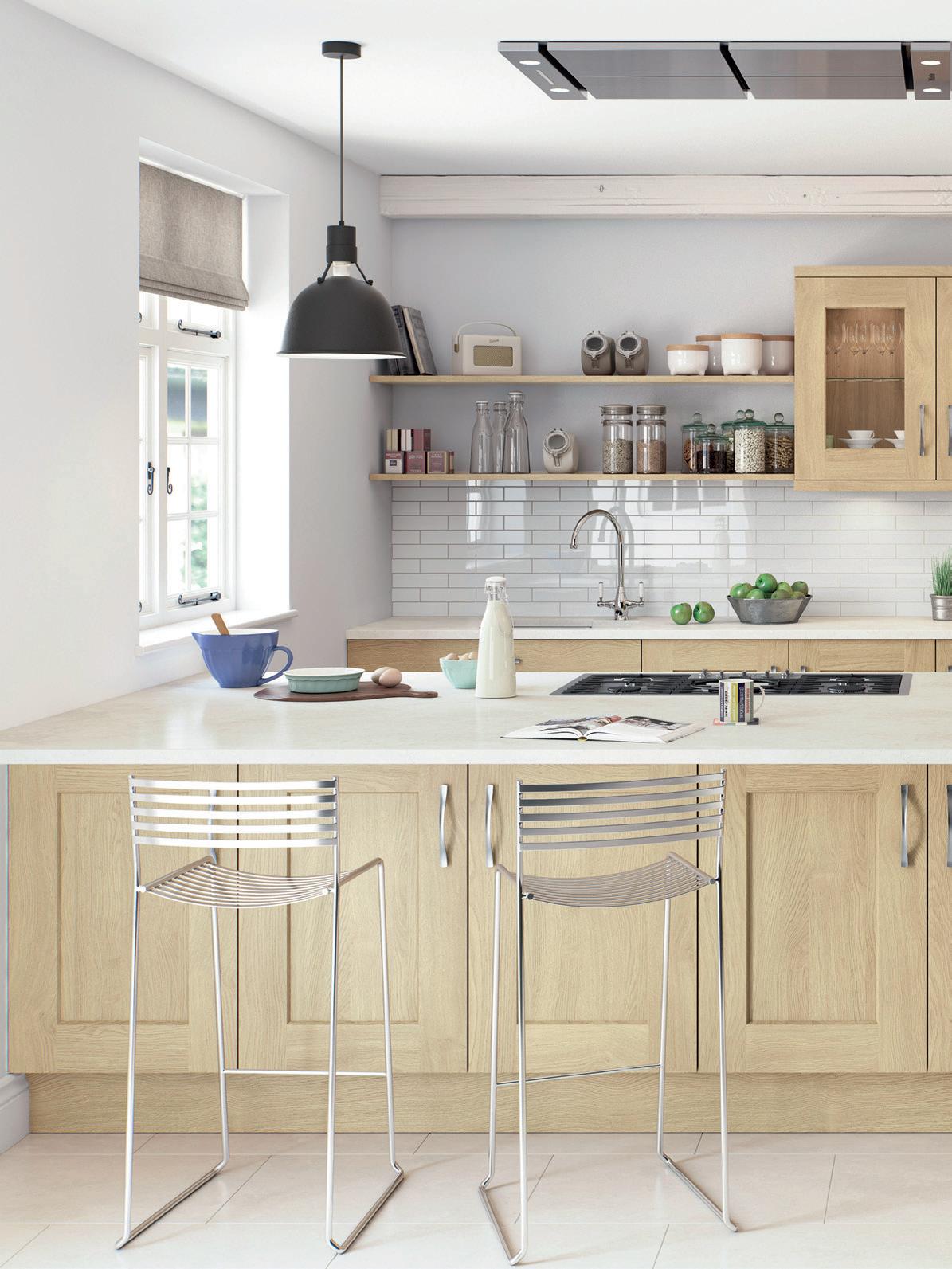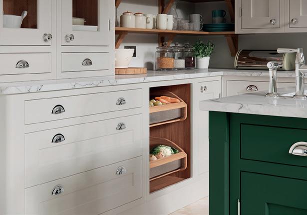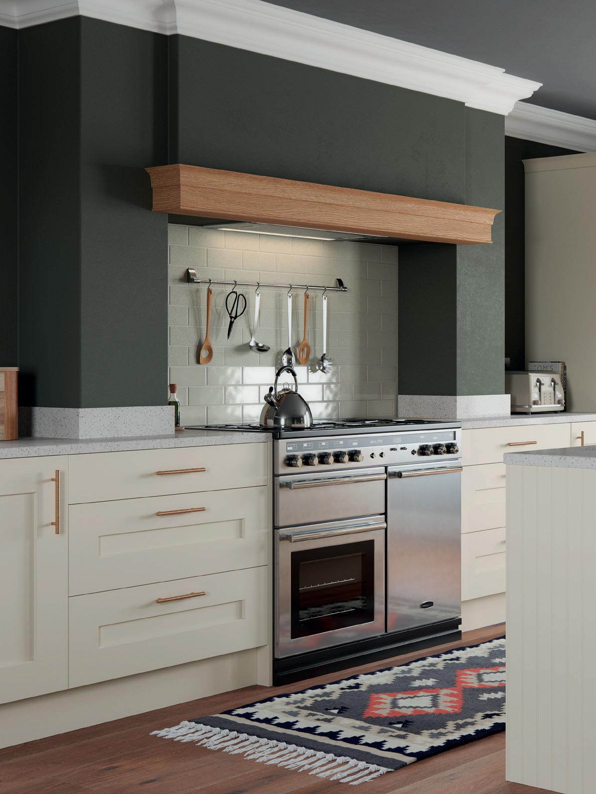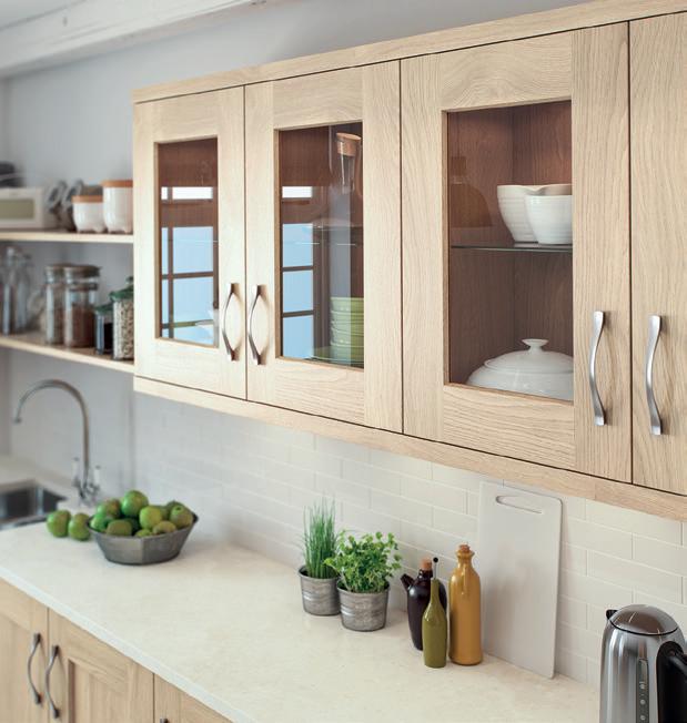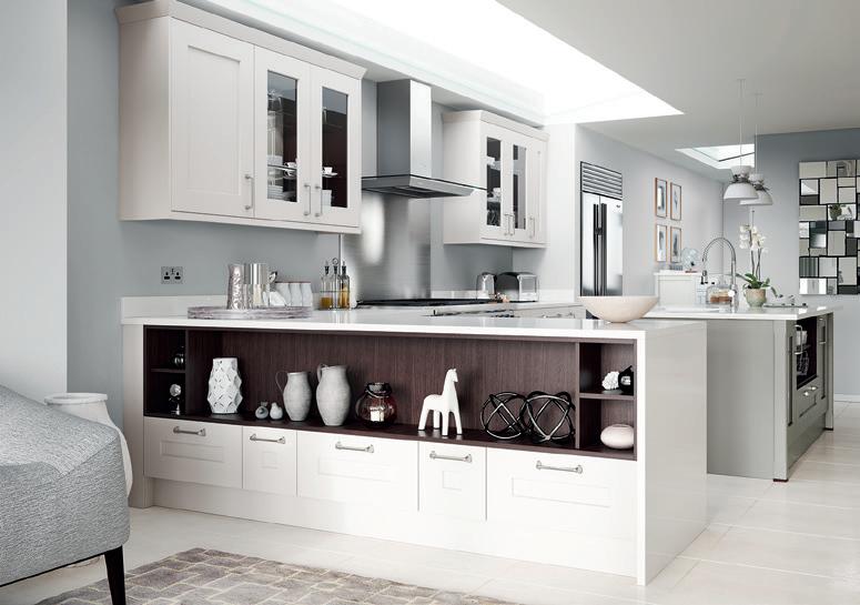 THE CHAMFERED solid oak door front of Rivington shaker is given an extra twist with the addition of wider side rails. Along with chamfered pilasters with colour coordinated feet and mirrored backs to the glazed units, the result a truly bespoke feel that is functional yet nevertheless welcoming.