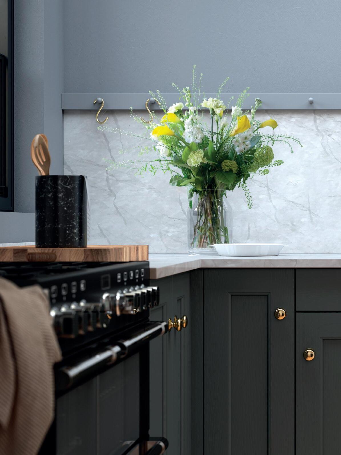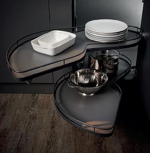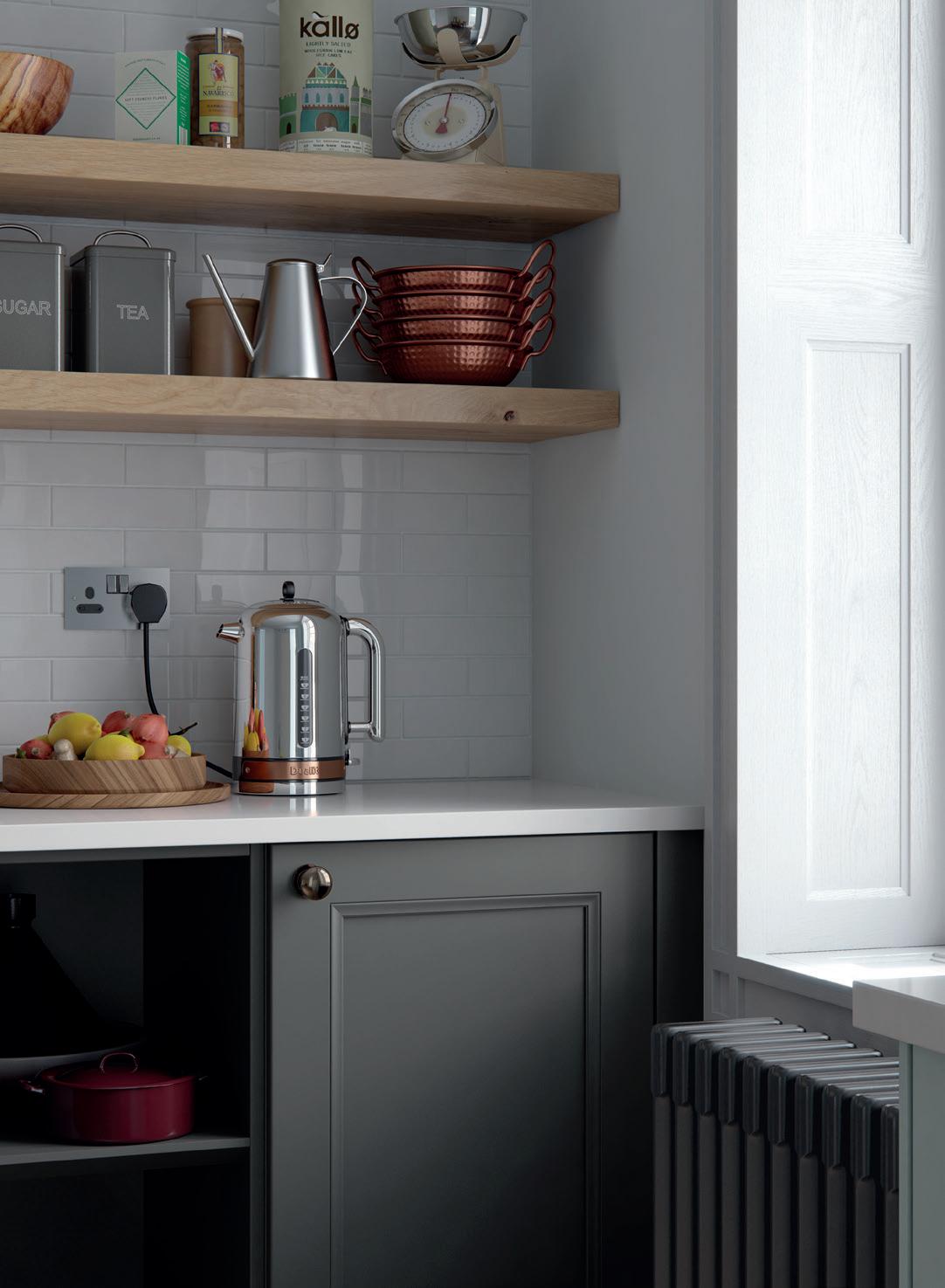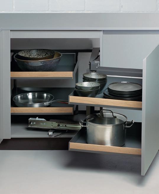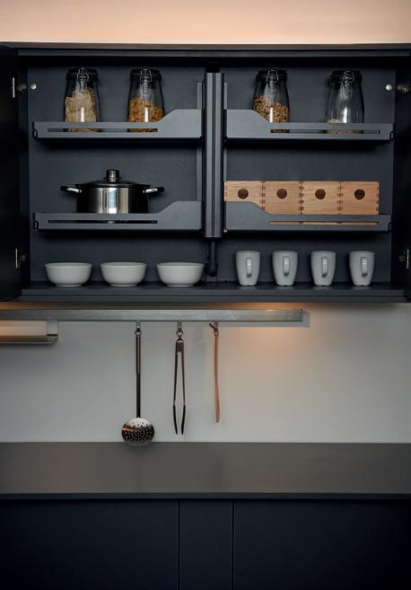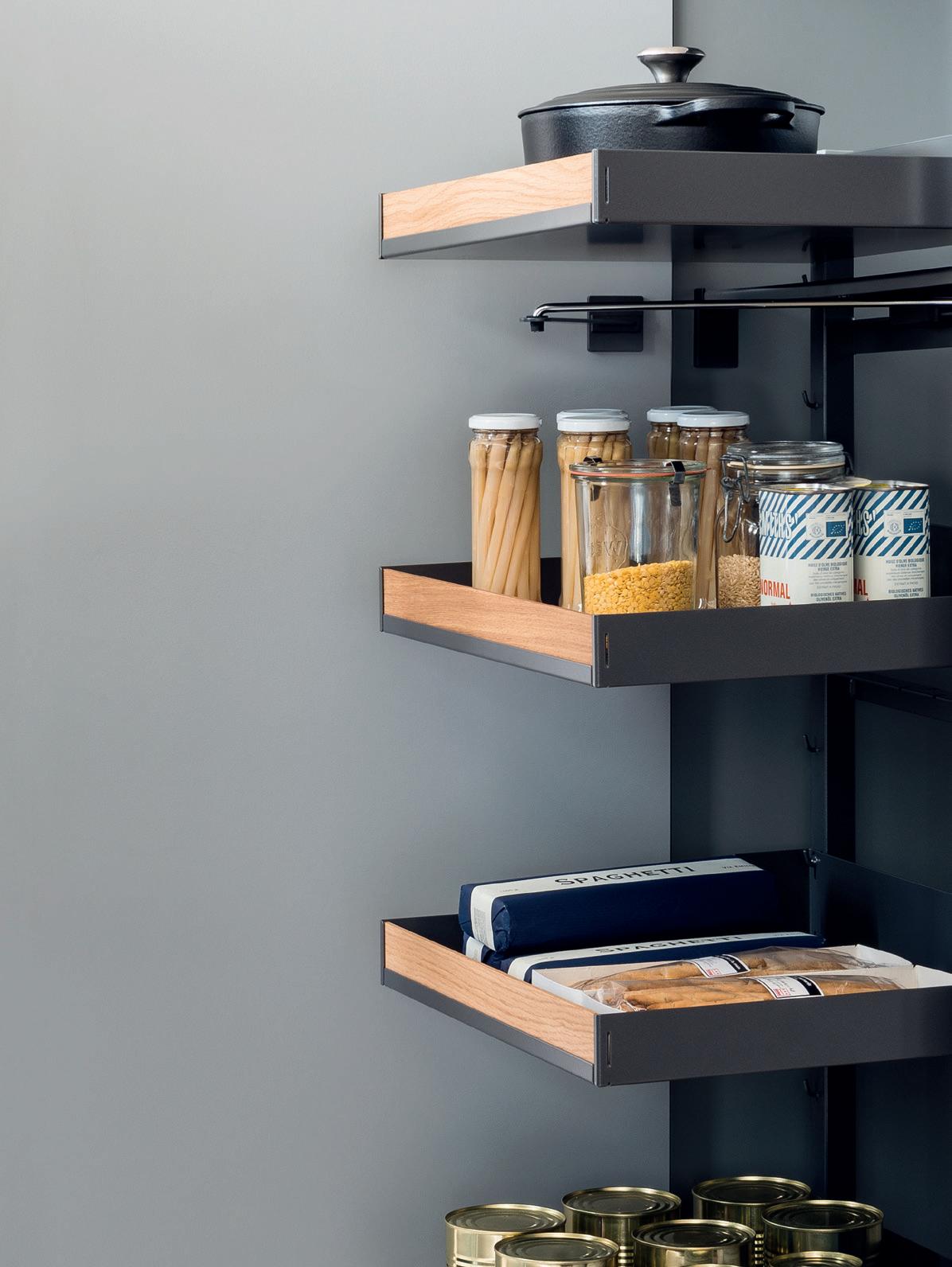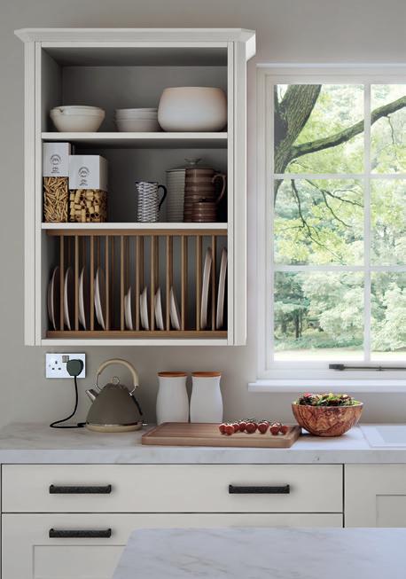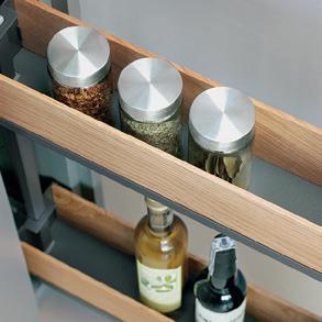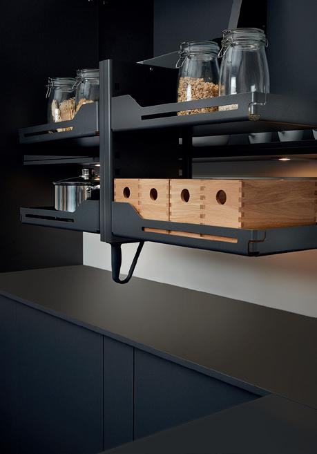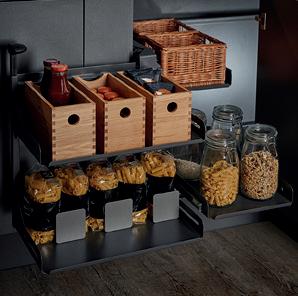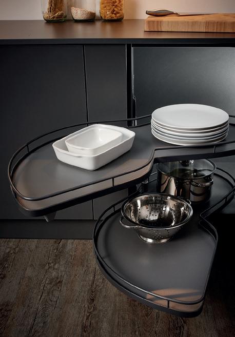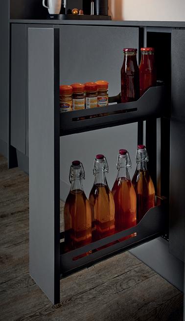 A place for everything and… well, you know the rest. A full range of ingenious storage ideas turns every nook and corner of your kitchen cabinets into valuable storage space. Anthracite shelving is strong and practical, with rotary, slide out and pull down designs all available. Timber panelled options are easy on the eye and make it even easier to organise things exactly the way you want. For more storage solutions, see pages 110—113