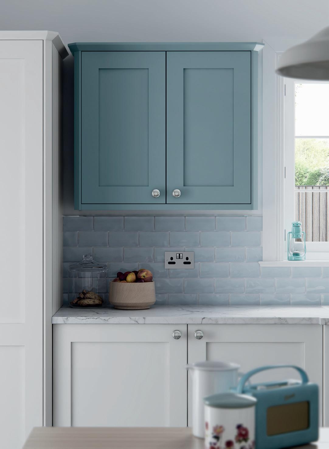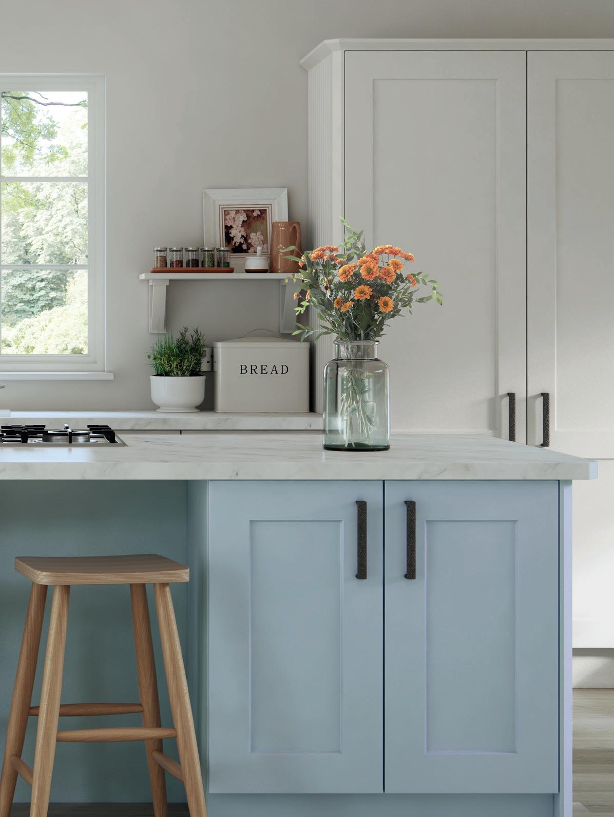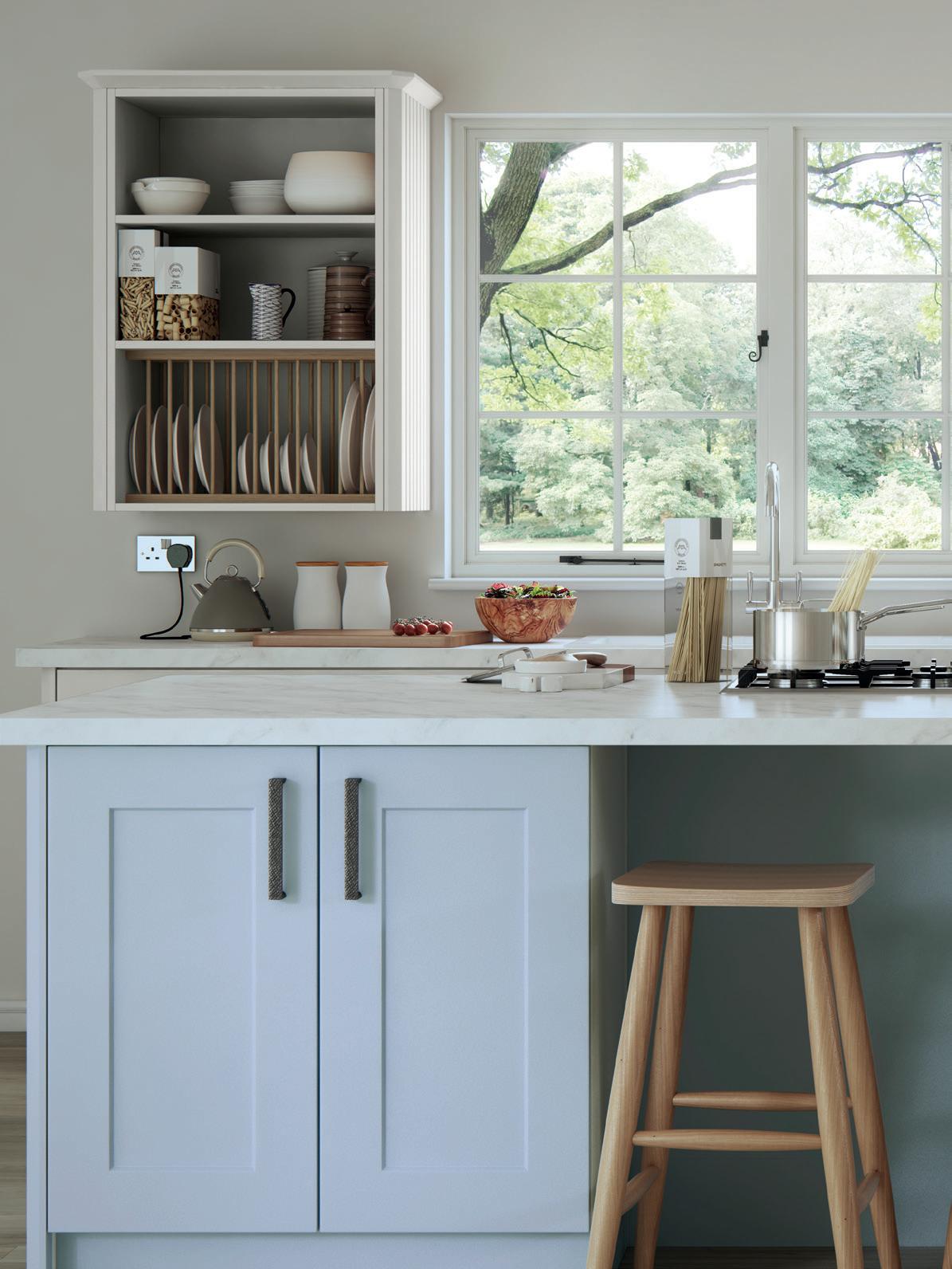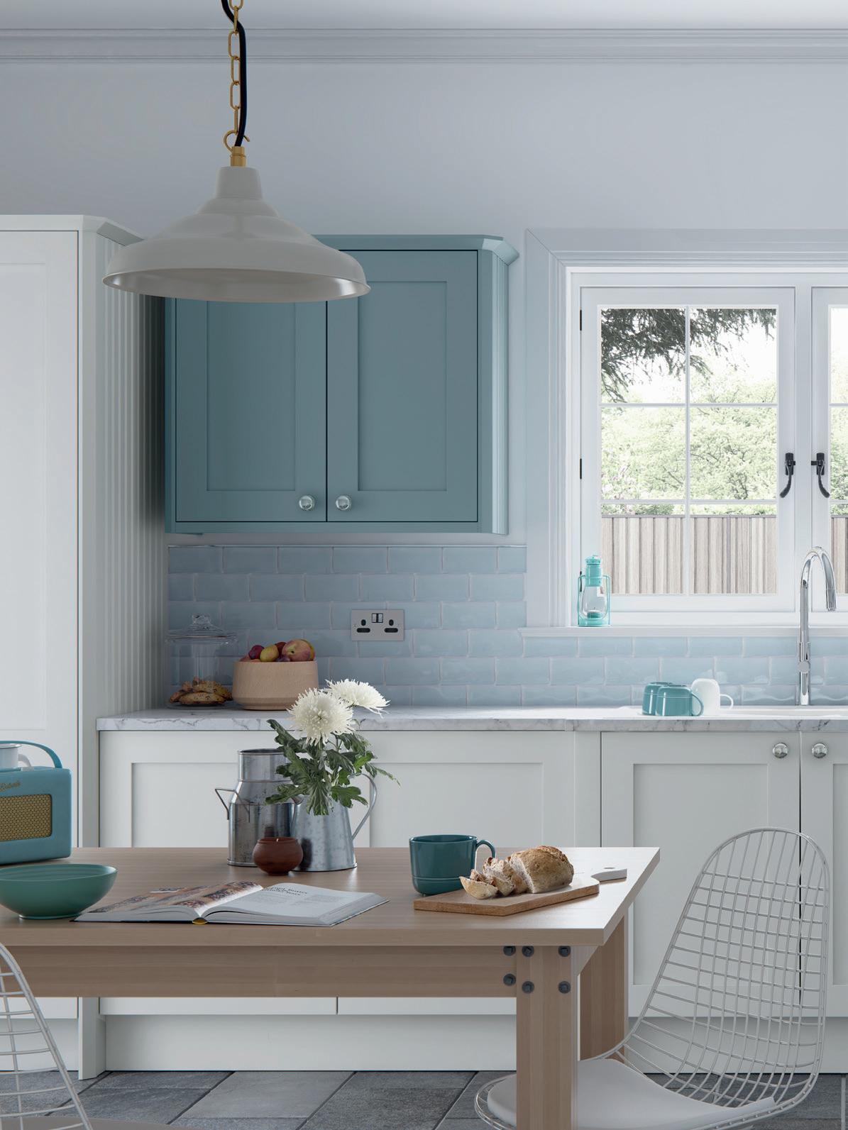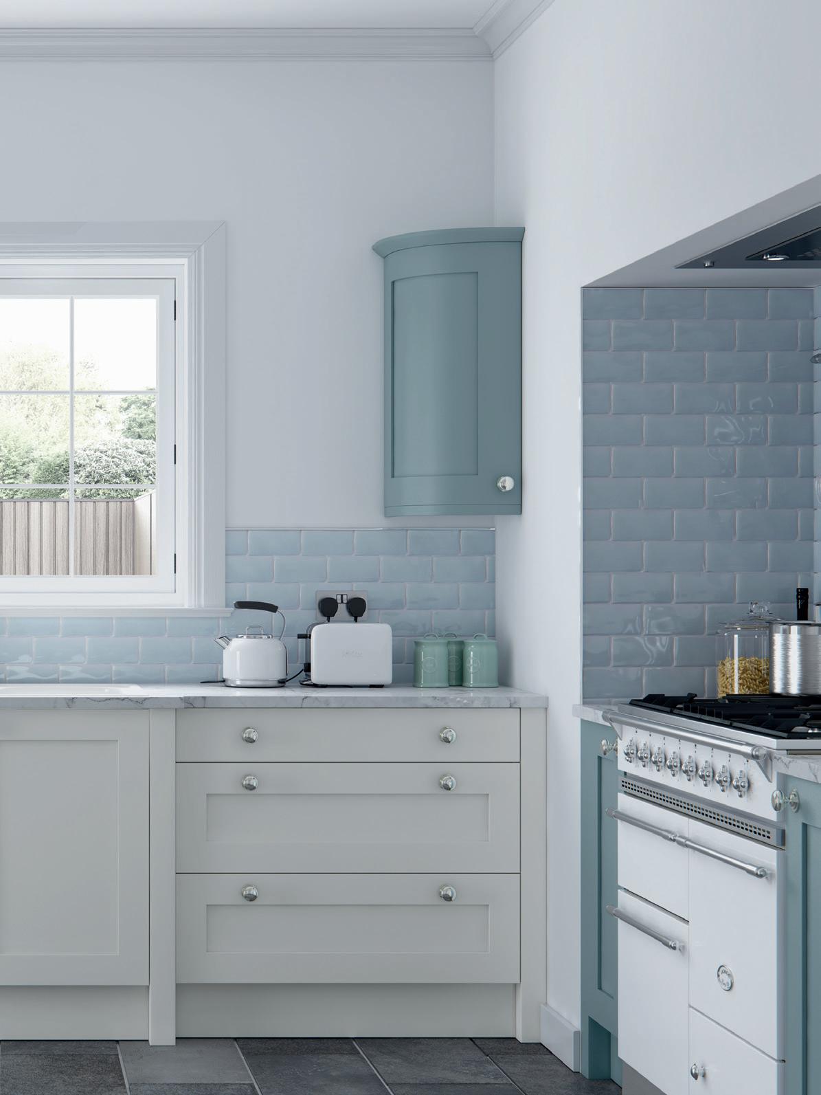 AN INVITING COUNTRY KITCHEN in calming Porcelain and complementary Sky Blue, featuring a chamfered shaker style door and some subtle design details that reward a closer look.