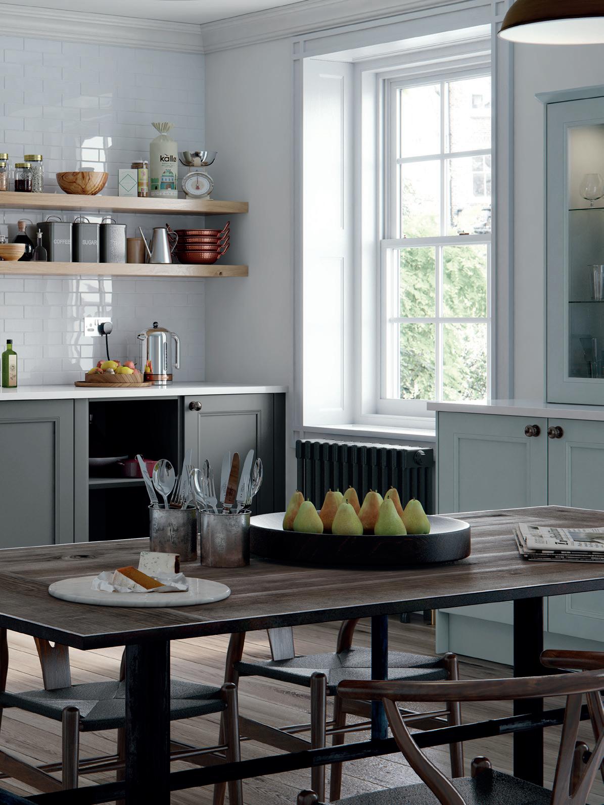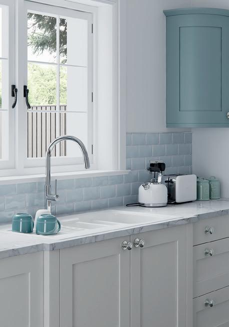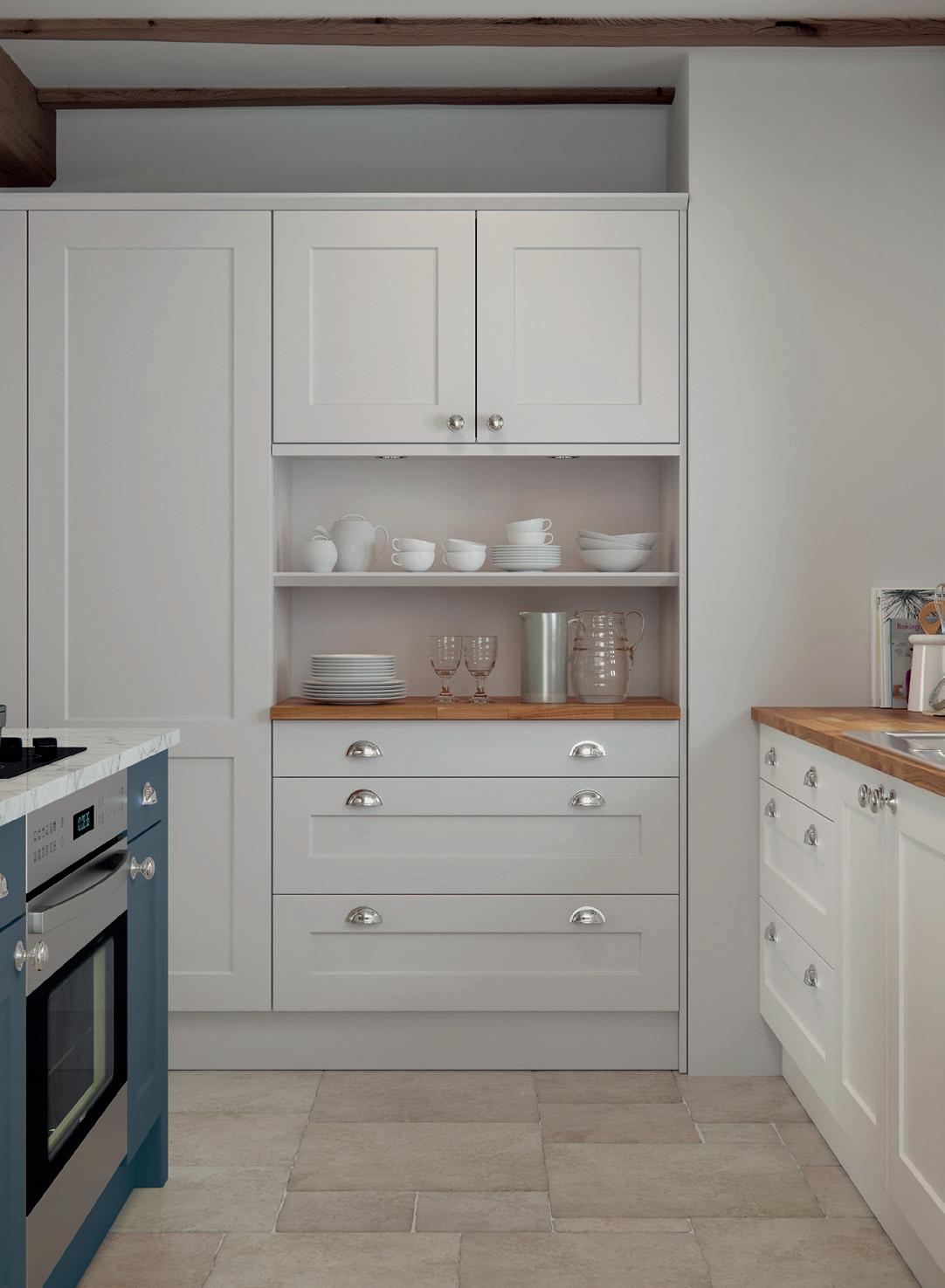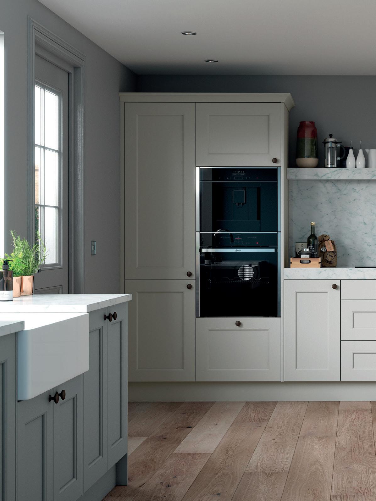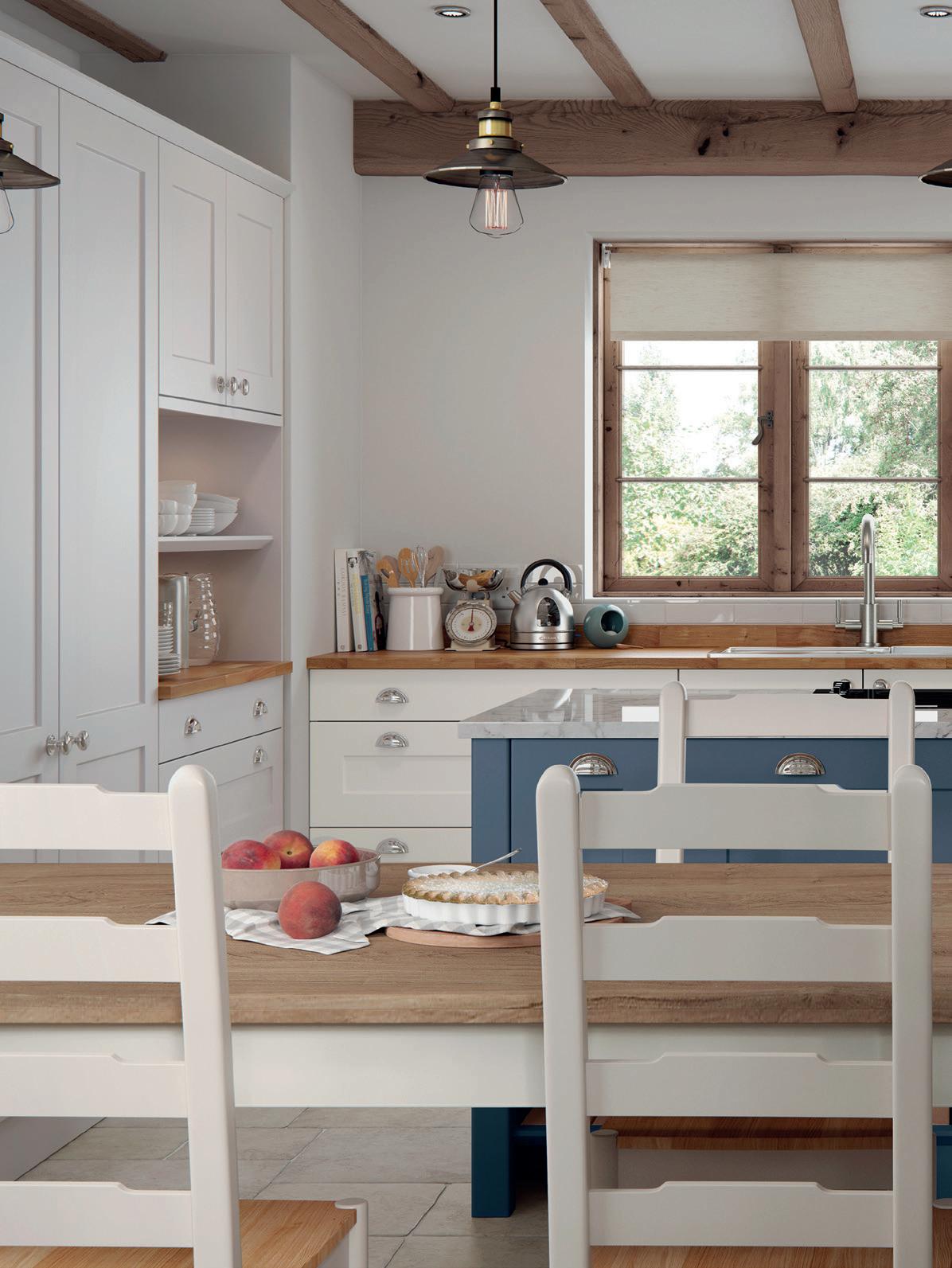 AN INVITING COUNTRY KITCHEN in calming Porcelain and complementary Sky Blue, featuring a chamfered shaker style door and some subtle design details that reward a closer look.