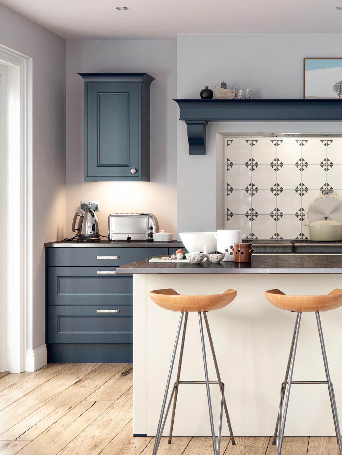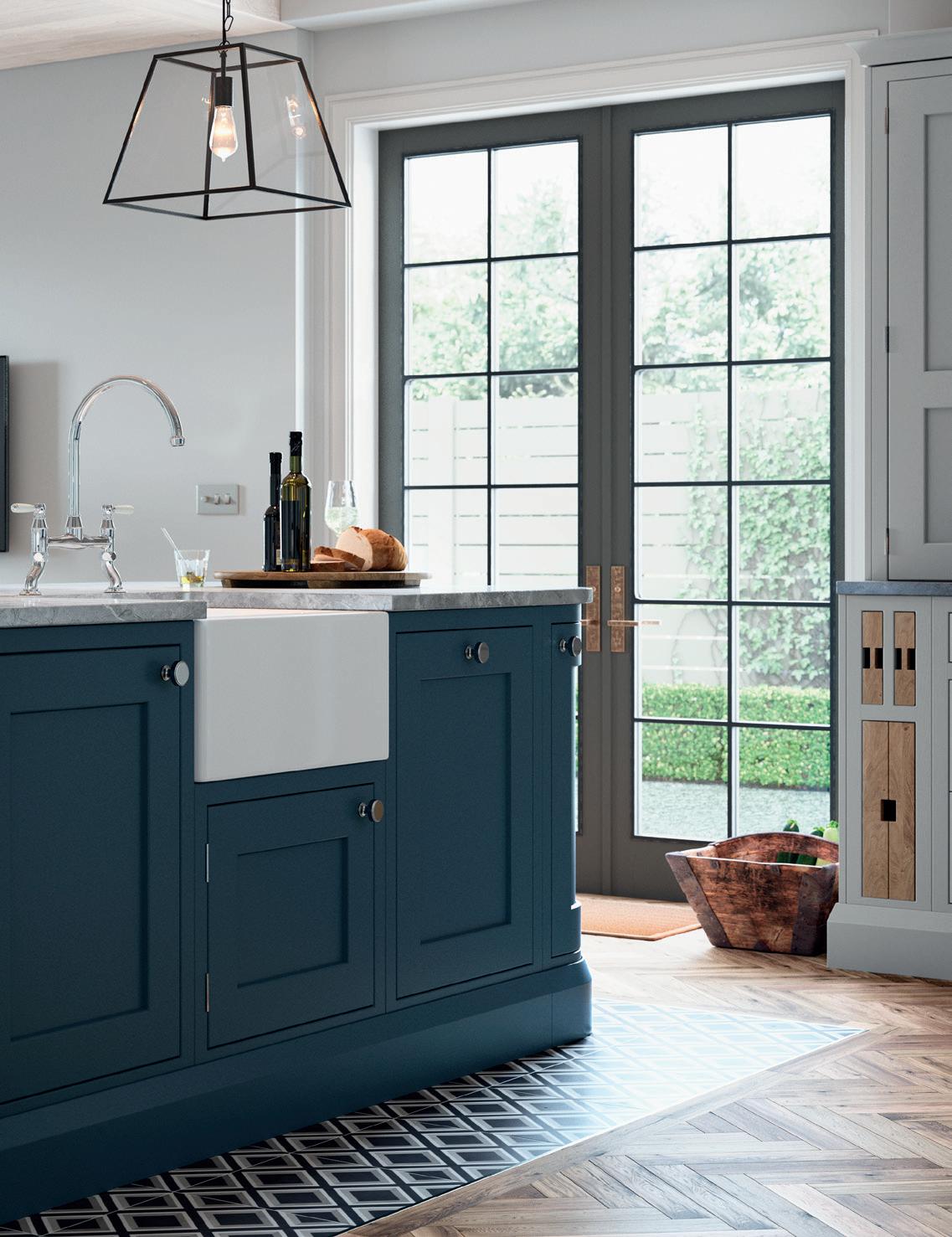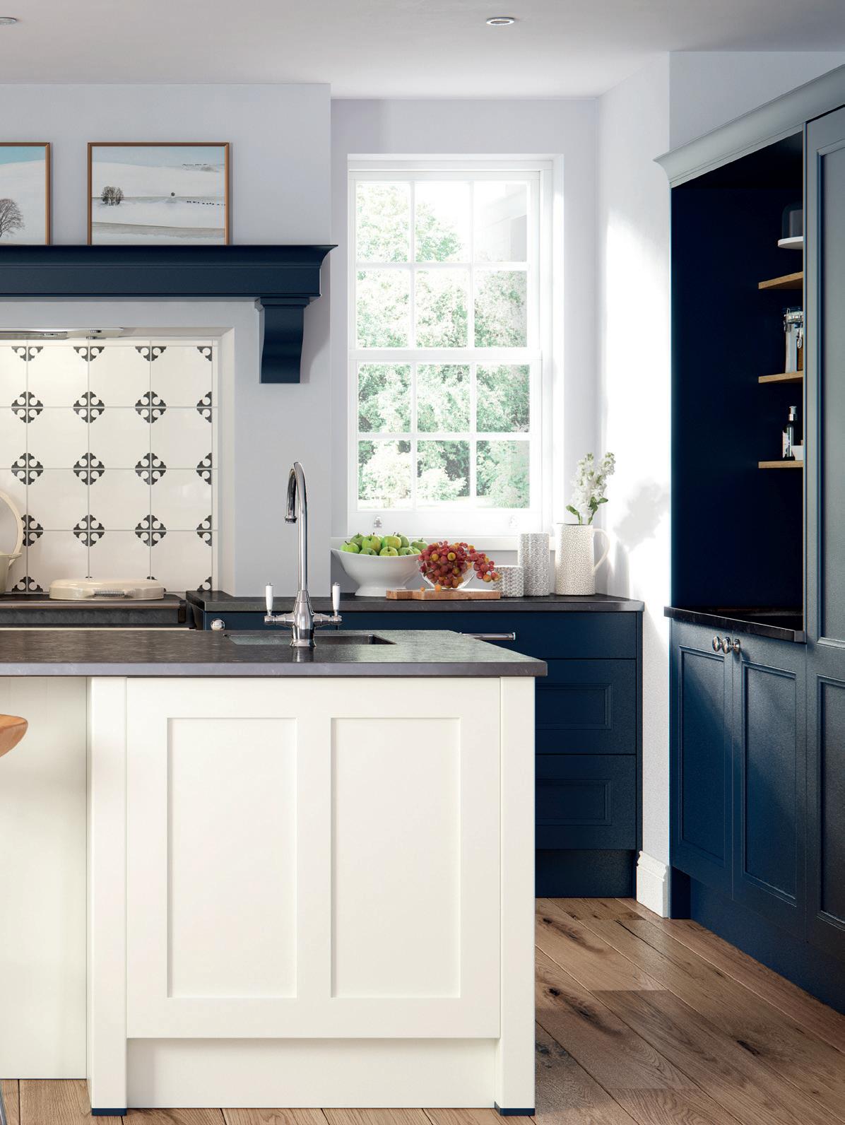 A CHAMFERED CENTRE PANEL brings a subtle update to the shaker template in this Hartside country kitchen, which features a trio of colours - Dark Blue, Porcelain and Light Grey – that together create a space full of traditional character and charm.