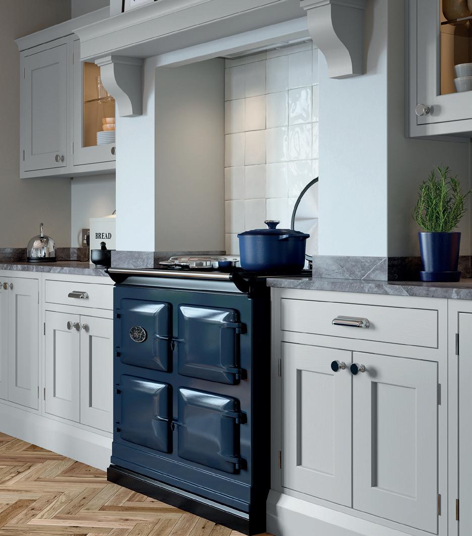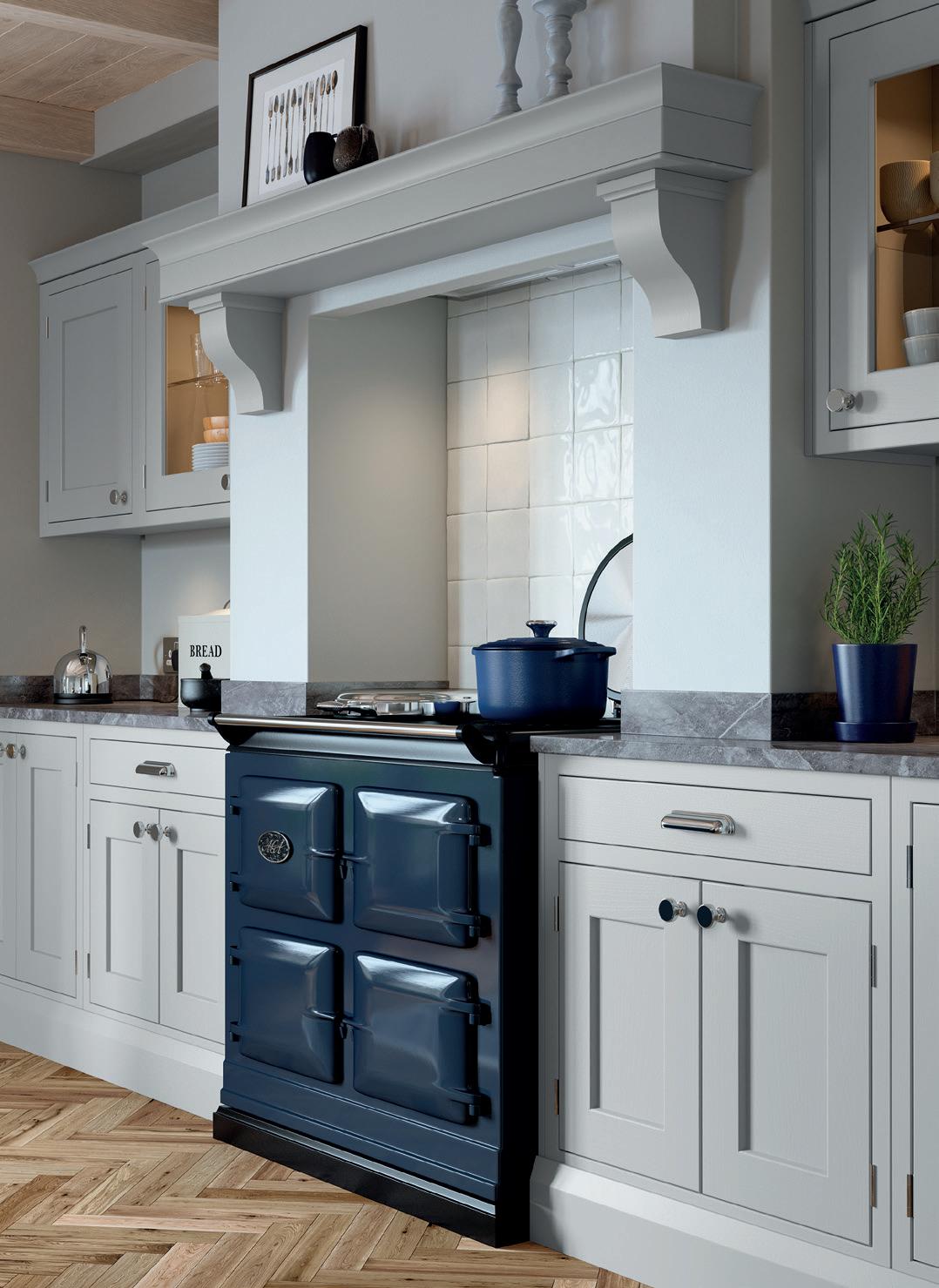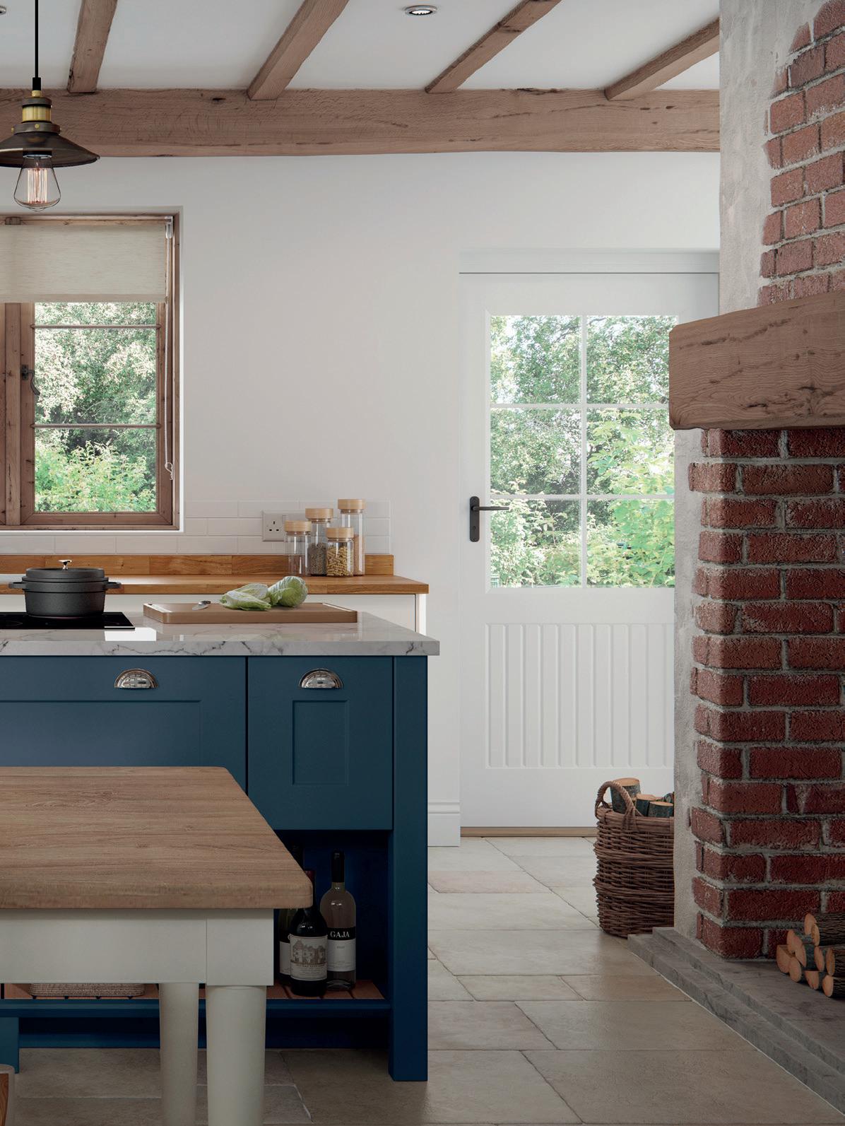 A CHAMFERED CENTRE PANEL brings a subtle update to the shaker template in this Hartside country kitchen, which features a trio of colours - Dark Blue, Porcelain and Light Grey – that together create a space full of traditional character and charm.