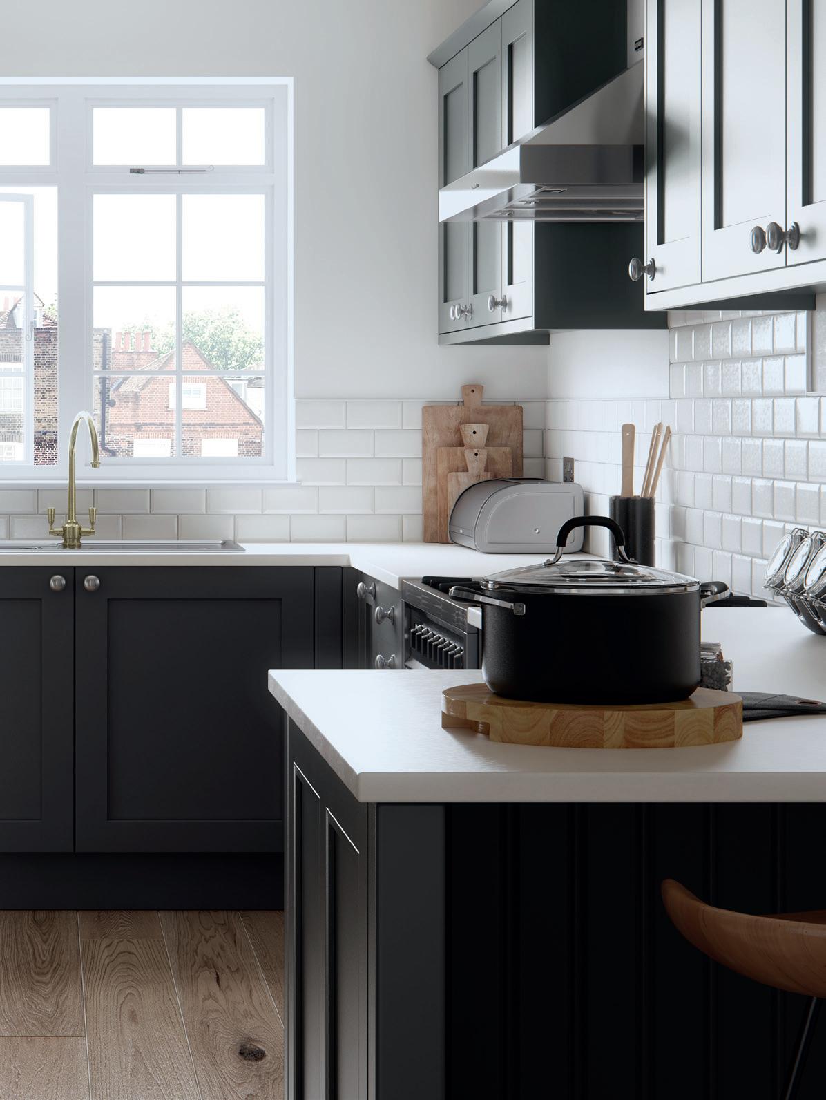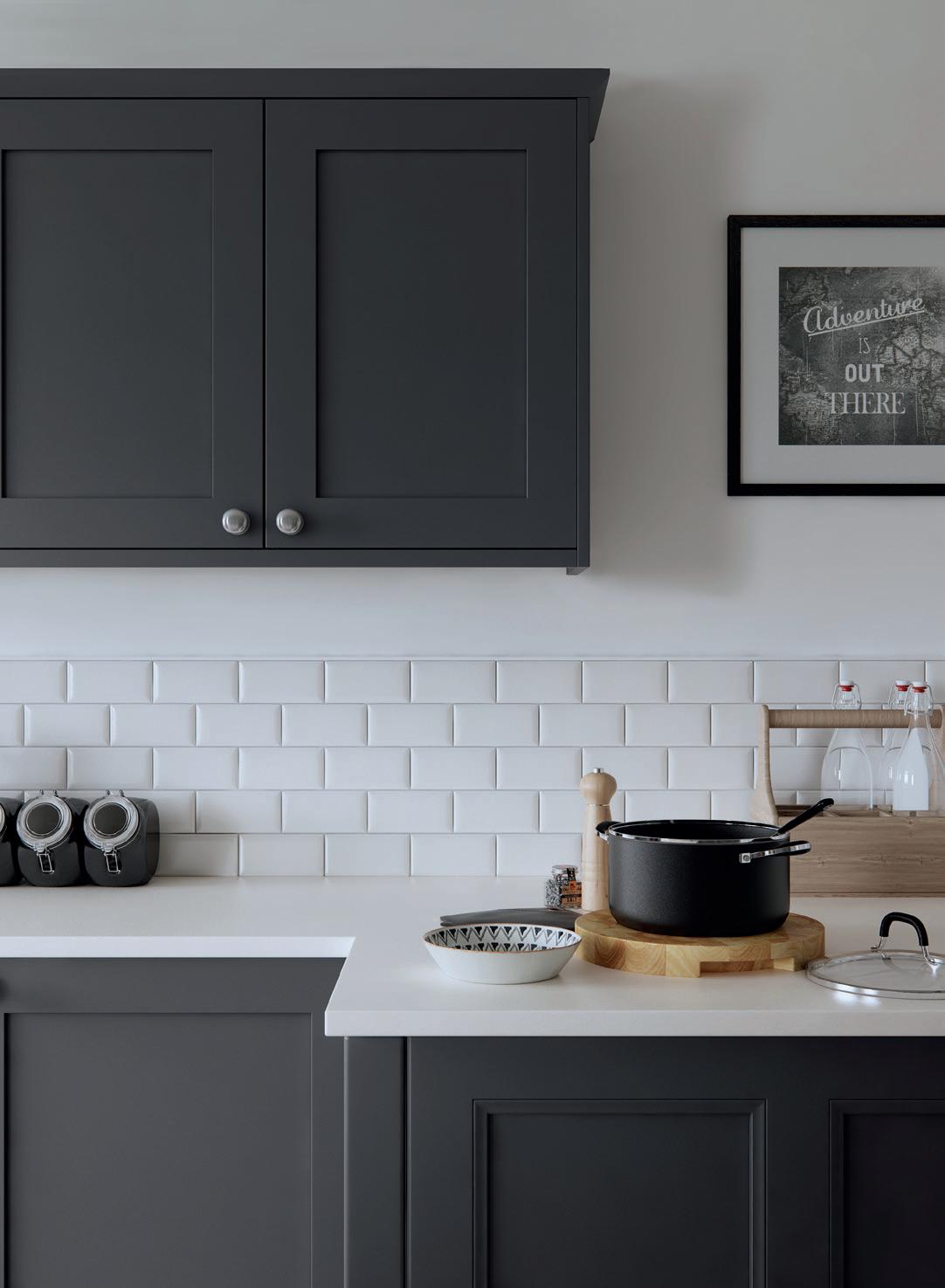 THE SUBTLE BUT significant difference between plain shaker doors on floor and wall cabinets and beaded doors on the side cupboard and breakfast bar maintains the visual interest in this otherwise deceptively simple design. A plain white worktop emphasises the darker tones of Graphite below it, with white bevelled tiles adding an element of texture.