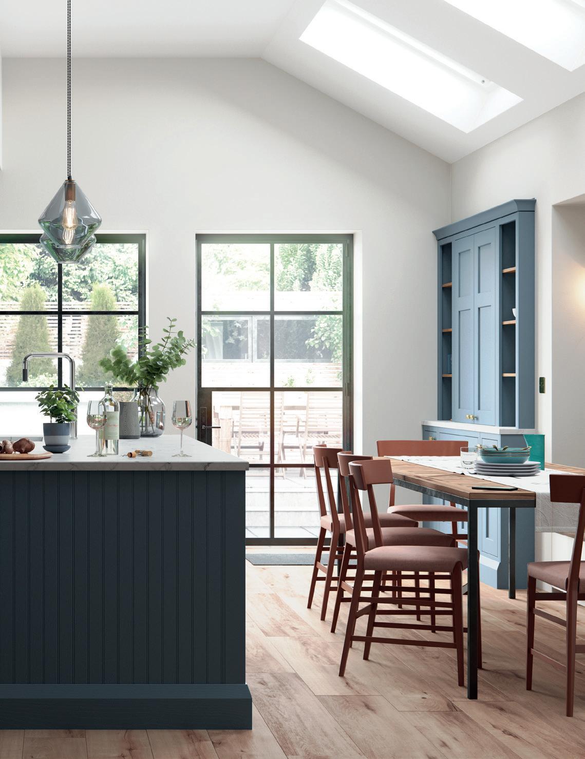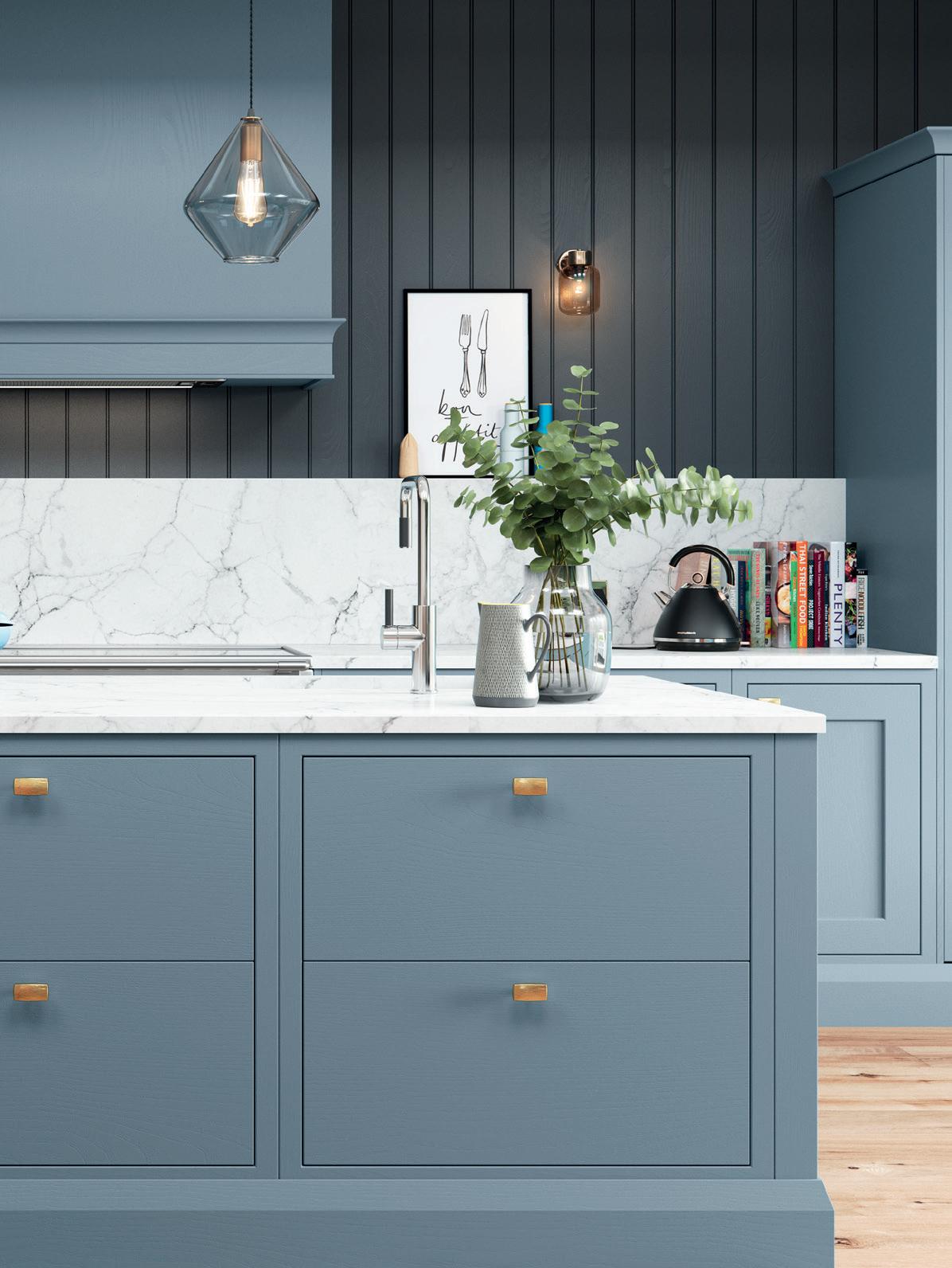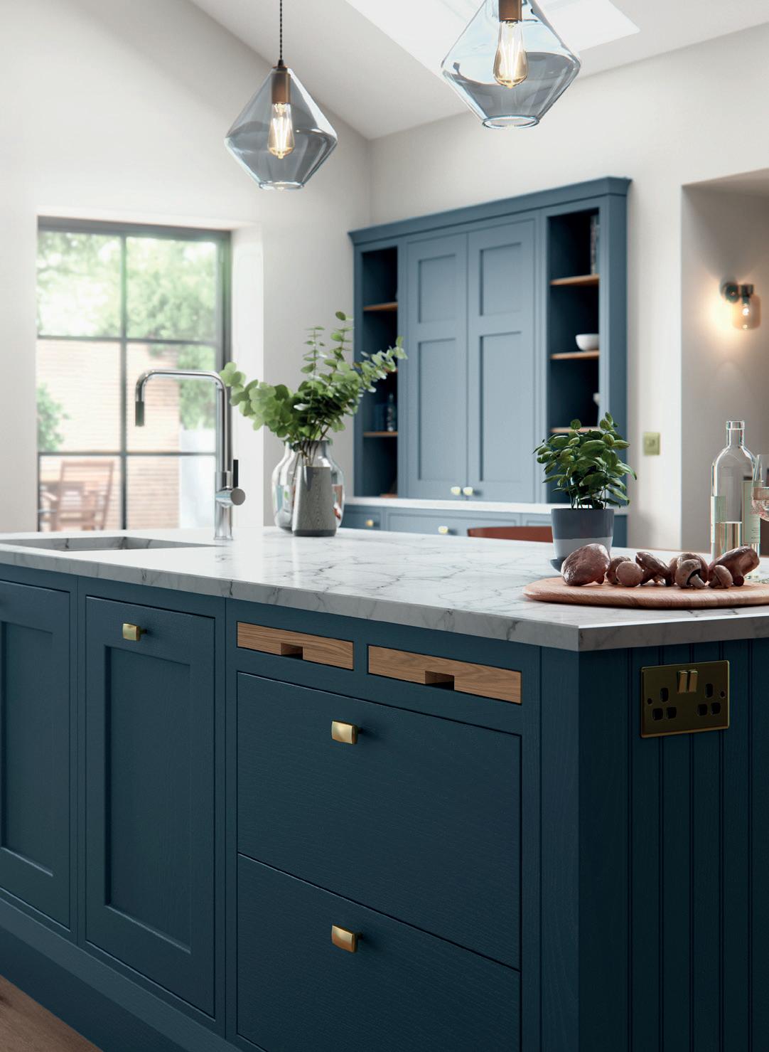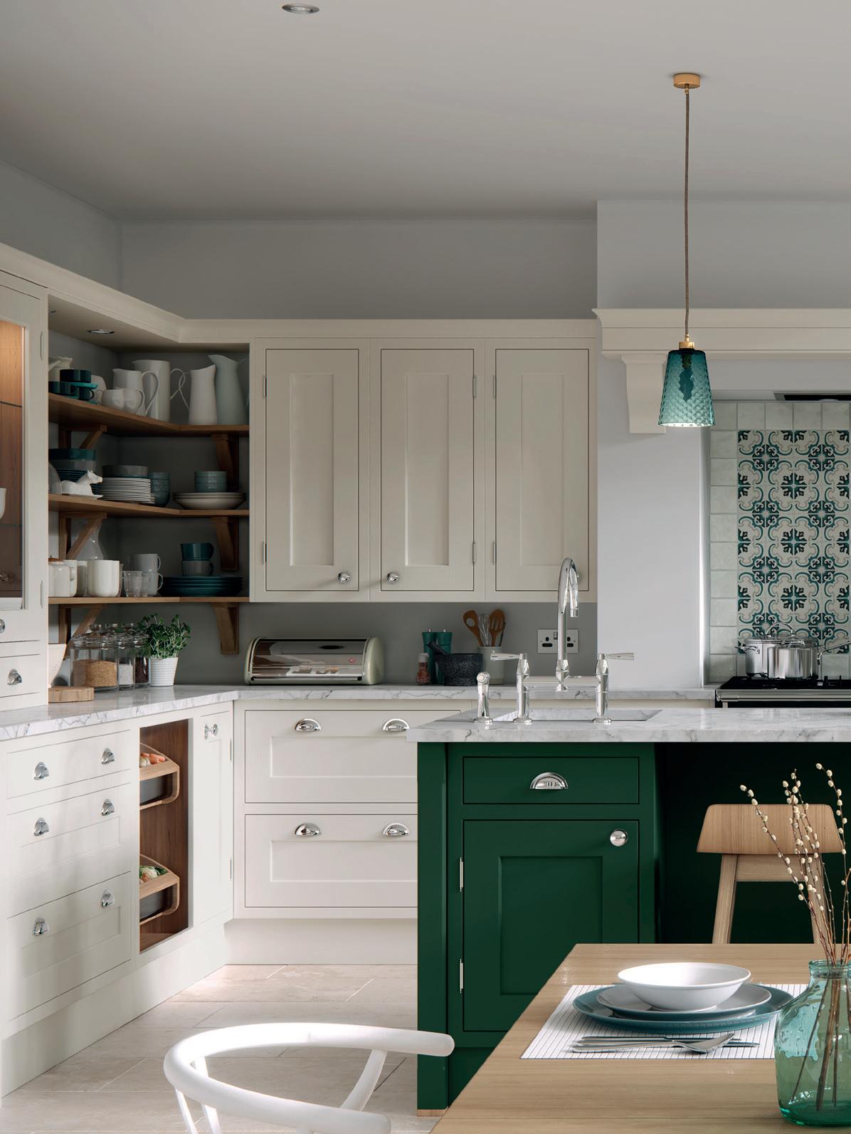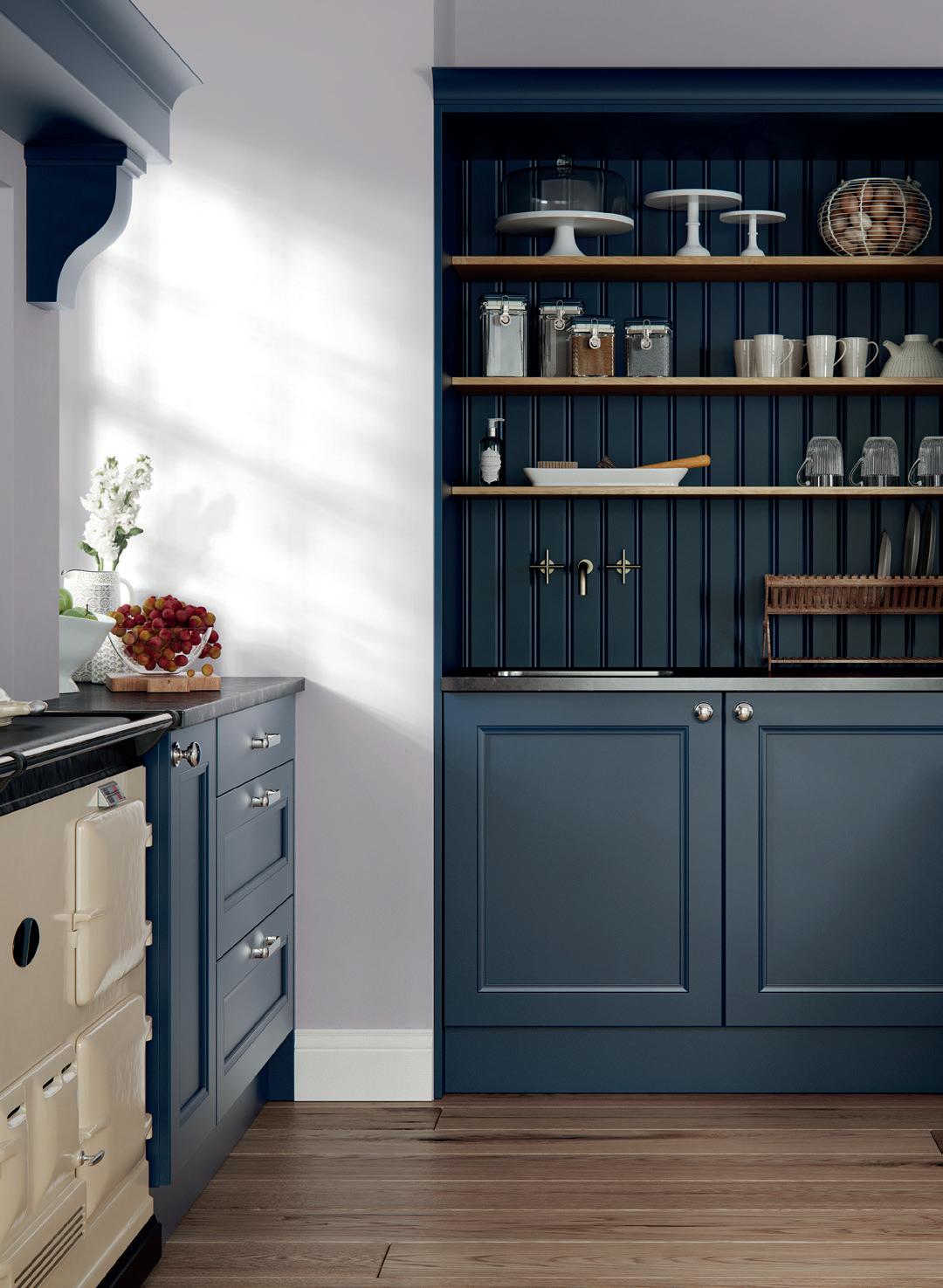 A LITTLE CONTRAST. A Silestone Alpine White worktop adds a contrasting accent to the Stone Blue of the kitchen island, which also features slab fascias in a contemporary twist on the classic in-frame design. Built-in chopping boards are a clever additional touch. The pantry unit with open shelving provides extra storage alongside space to display treasured personal items and ornaments.
