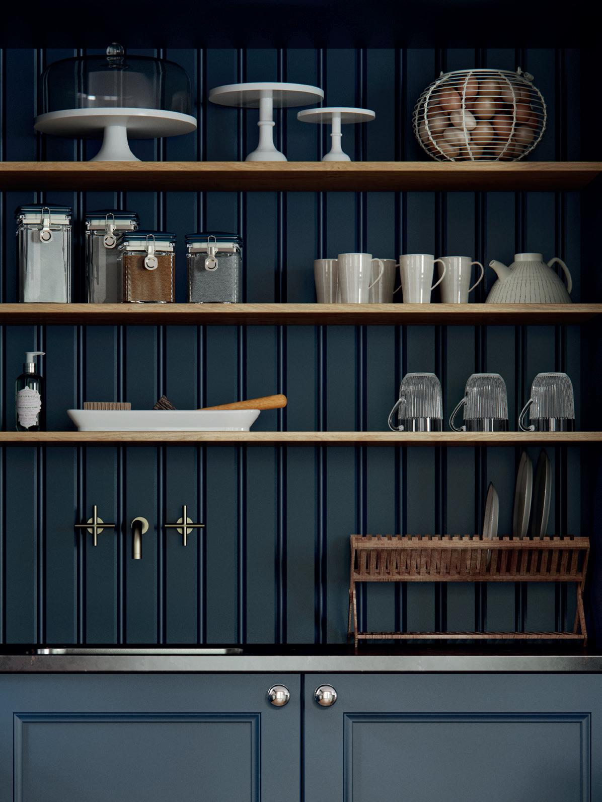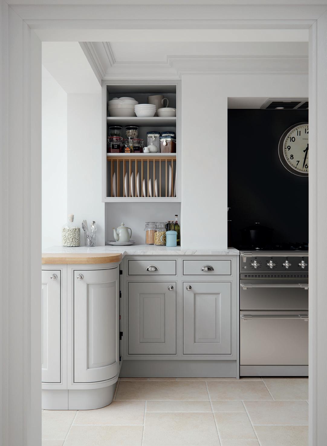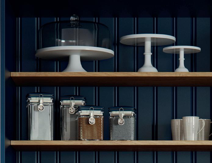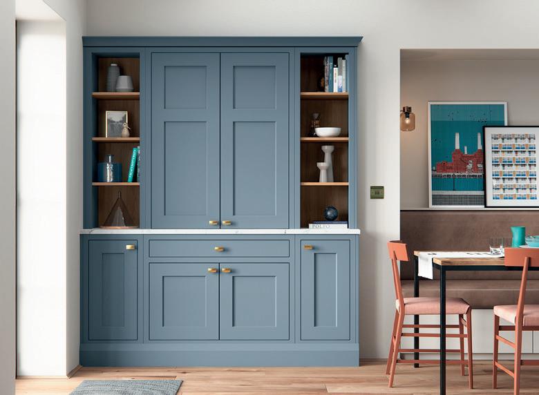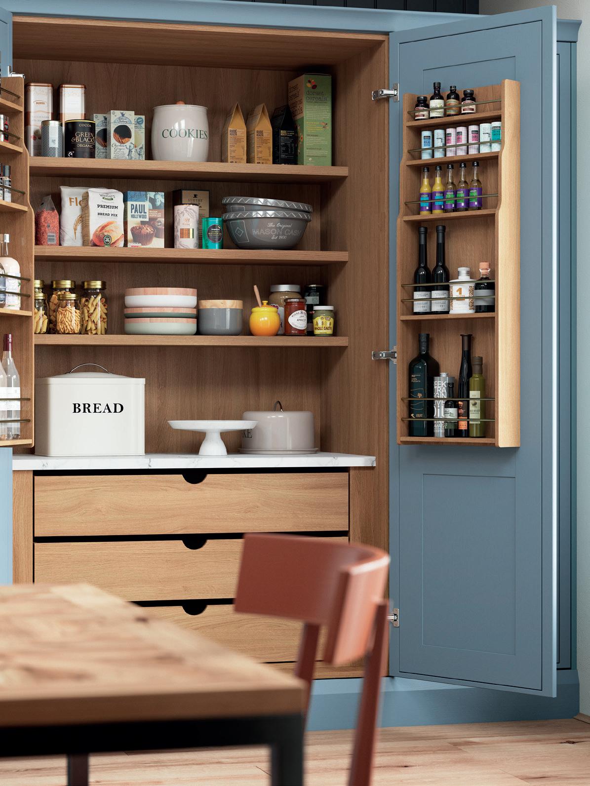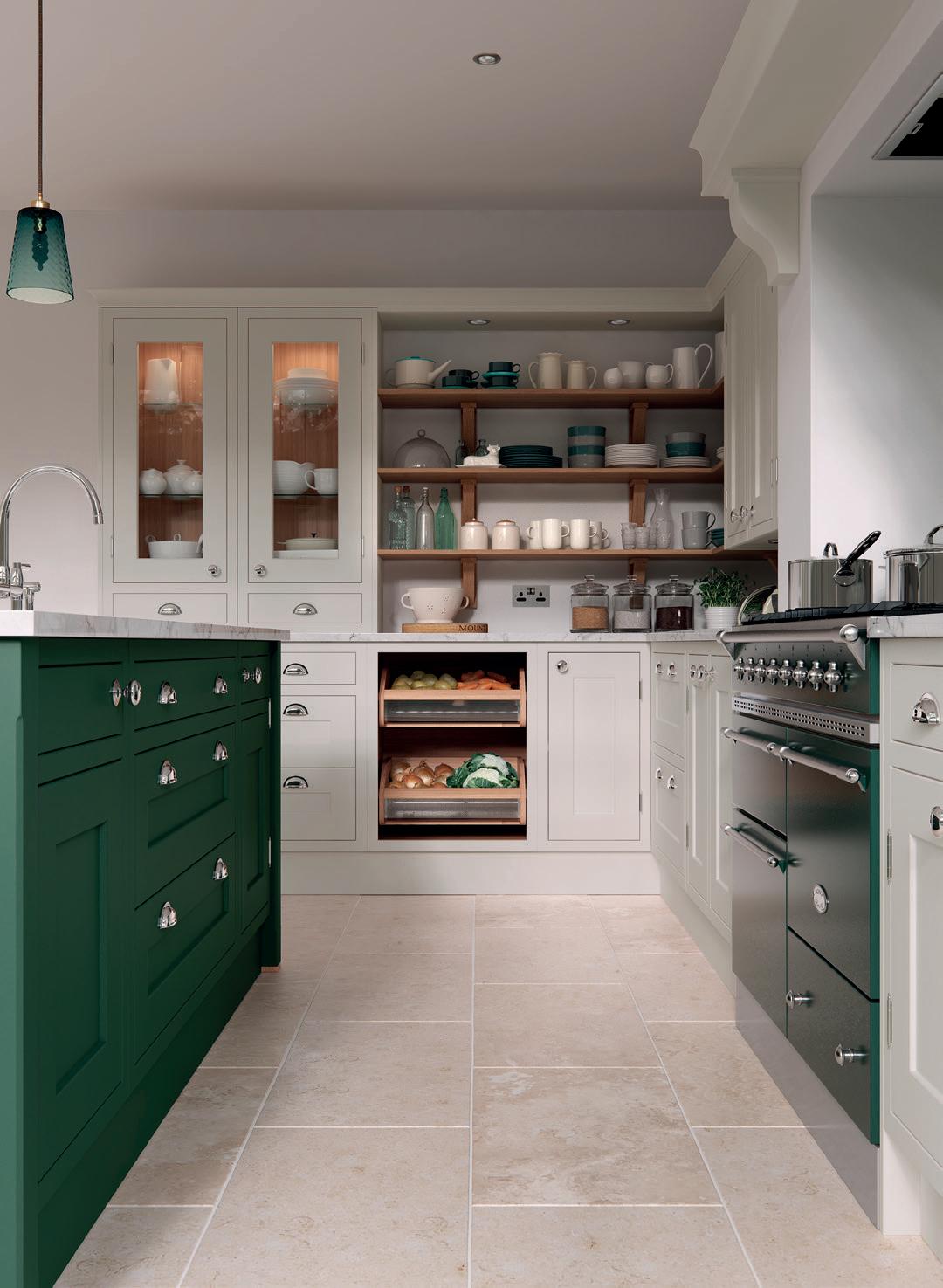 A LITTLE CONTRAST. A Silestone Alpine White worktop adds a contrasting accent to the Stone Blue of the kitchen island, which also features slab fascias in a contemporary twist on the classic in-frame design. Built-in chopping boards are a clever additional touch. The pantry unit with open shelving provides extra storage alongside space to display treasured personal items and ornaments.
