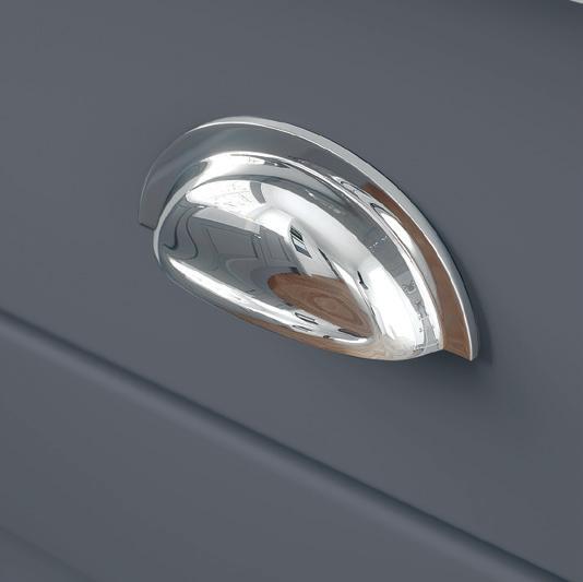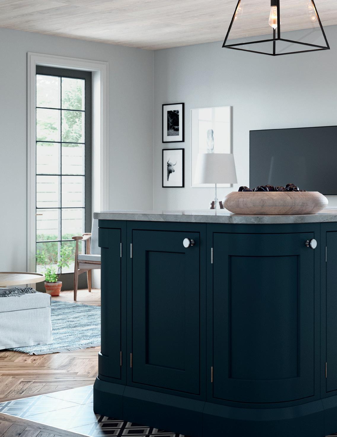 BAYSTONE’S PARED-DOWN classic in-frame style is the ideal canvas for an all over colour scheme of calming, contemporary Stone Blue punctuated by solid brass door and drawer handles. A full width moulded plinth lends a sense of solidity throughout.