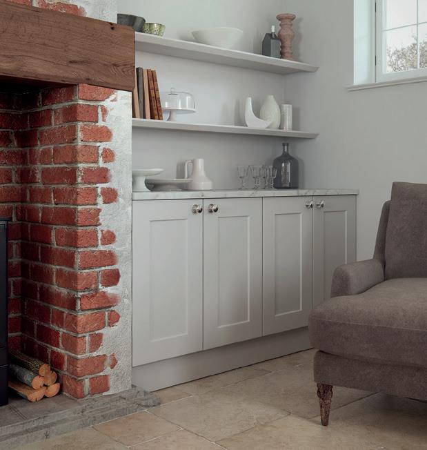 ECHOING THE CHAMFERED centre door panels, angled end mouldings on the open shelves are unique to the Timeless range. Chrome knobs and cup style handles ring the changes between drawer fronts and cabinet doors, with the natural tones of exposed brick and solid wood worktops providing a rustic homeliness.